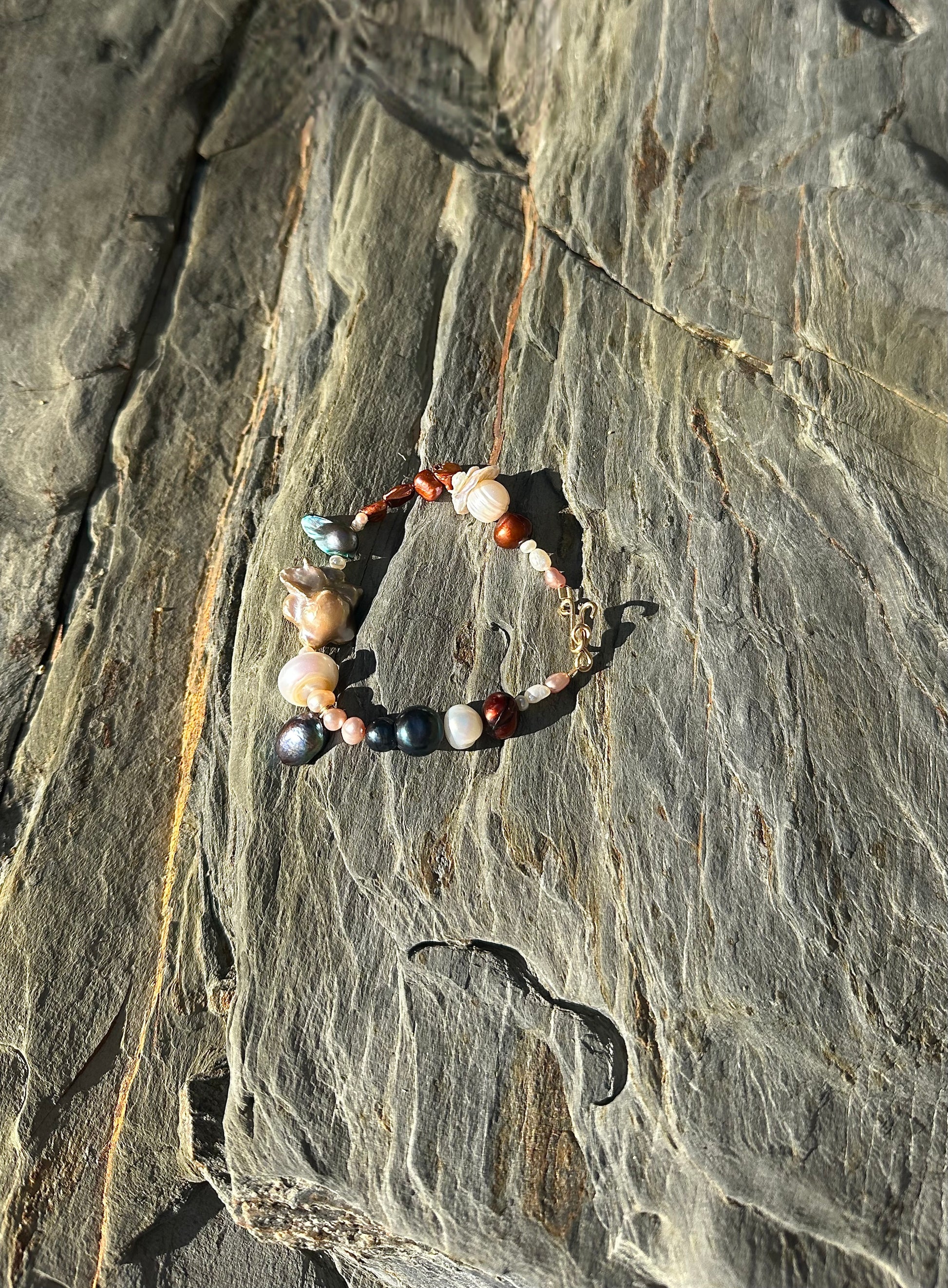 ANTON · a bracelet full of color and personality, created from a carefully selected mix of different types of freshwater pearls. The piece combines Keshi pearls, baroque pearls, and classic freshwater pearls in a variety of shapes, sizes, and tones—from soft whites and bronzes to deep blues and warm, rich hues that give the bracelet an organic and vibrant character.