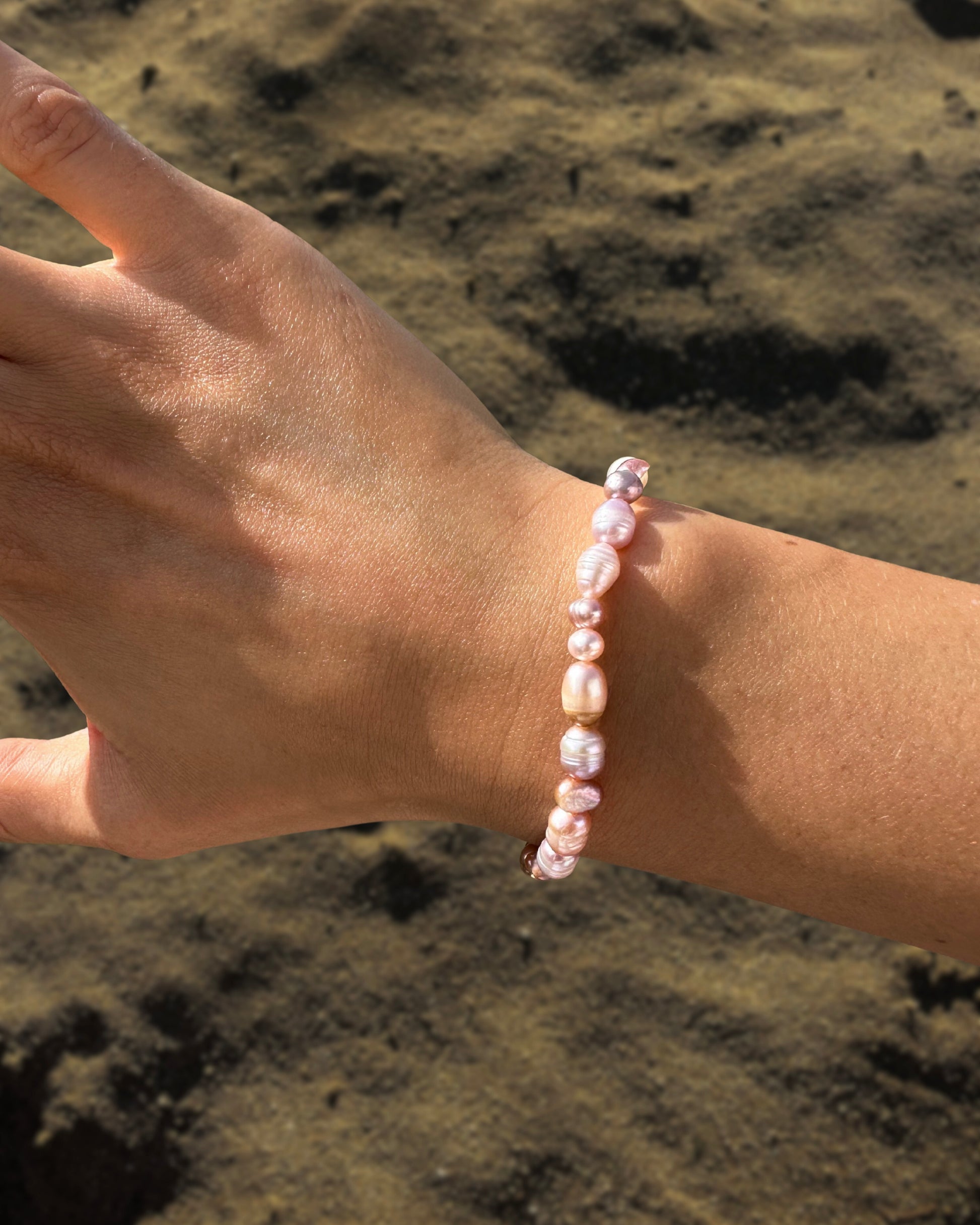 DONA · elastic bracelet composed of freshwater pearls in soft pink tones and varying sizes. Adorned with a 925 silver “SALTI” detail, on which rests a small freshwater pearl.