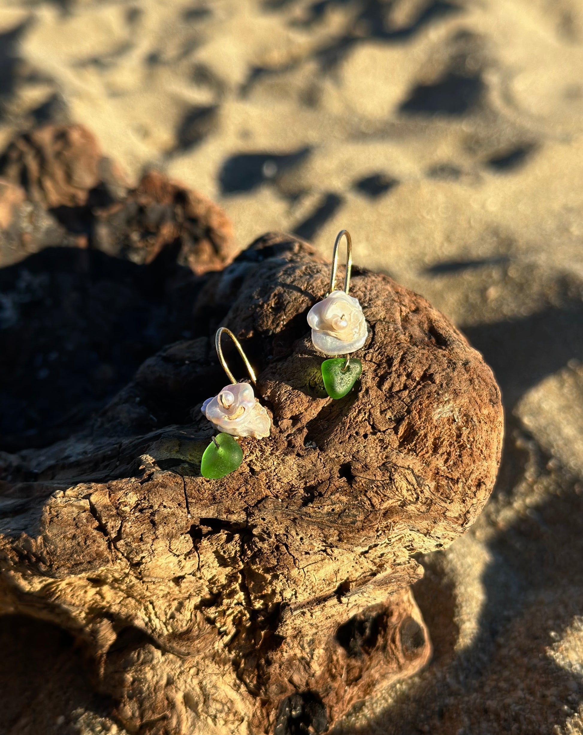 MAGNOLIA · small and delicate earrings featuring Keshi pearls shaped like tiny flowers, with a small freshwater pearl resting at their center. Below, a piece of green sea glass adds a touch of natural freshness. The entire composition hangs from a 14K gold-filled hook, evoking the softness and grace of a little magnolia.