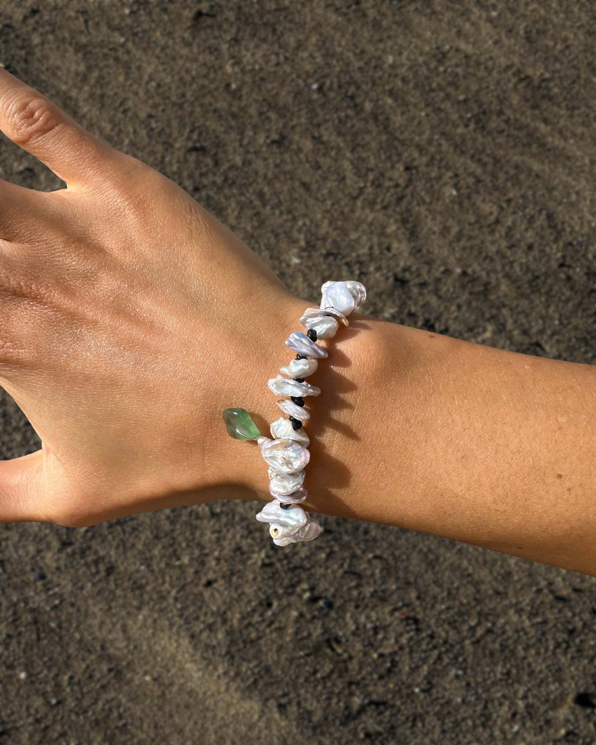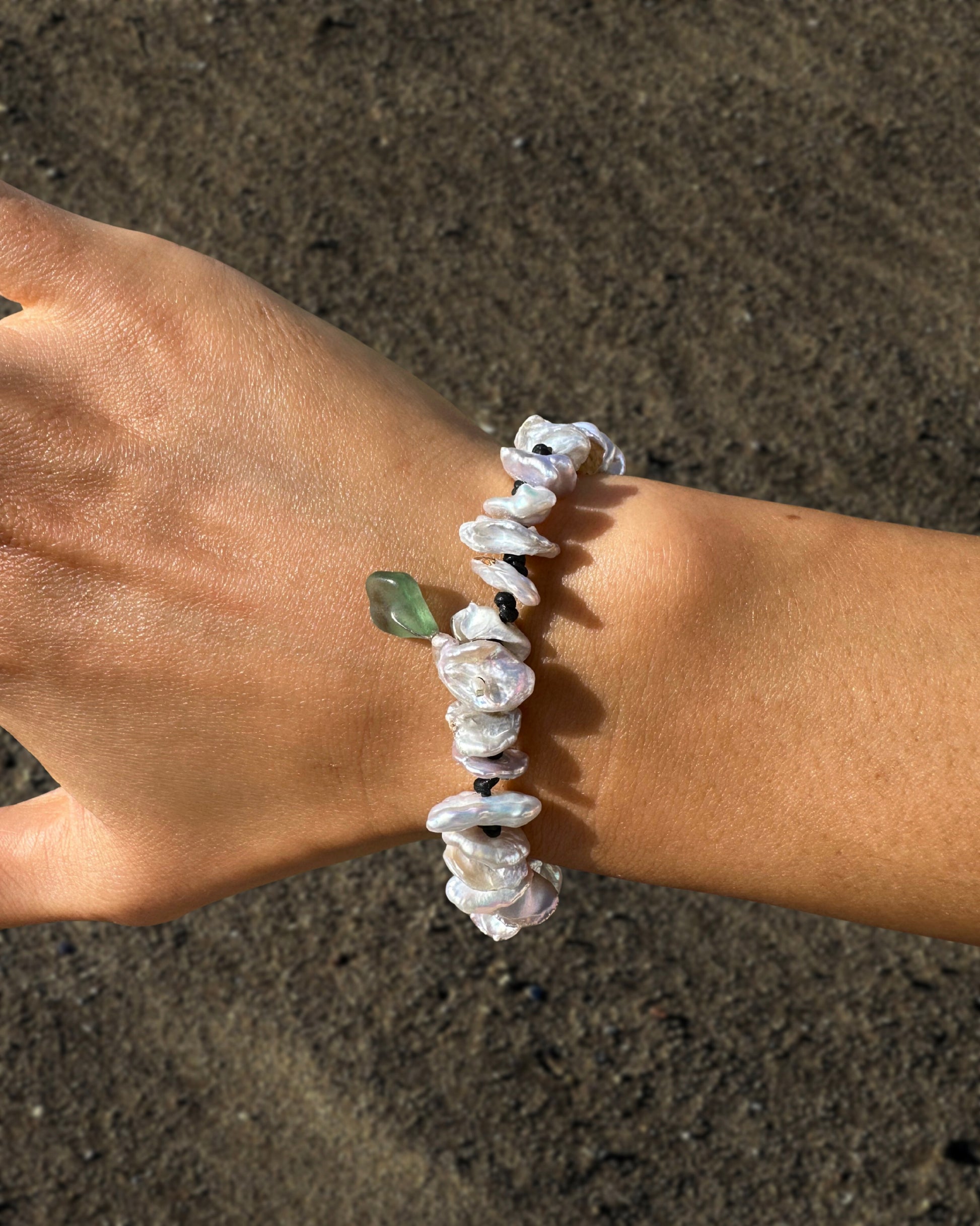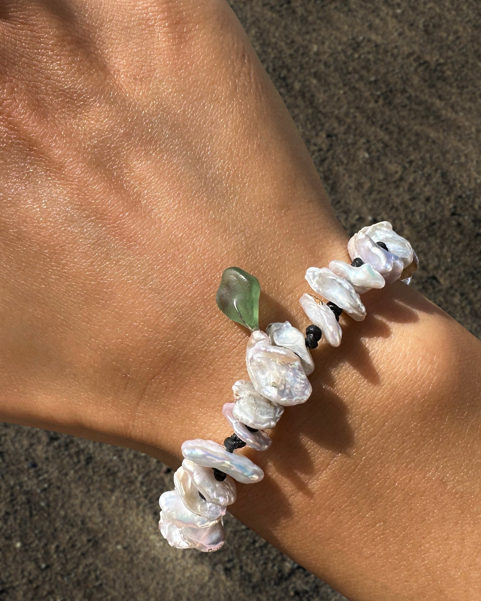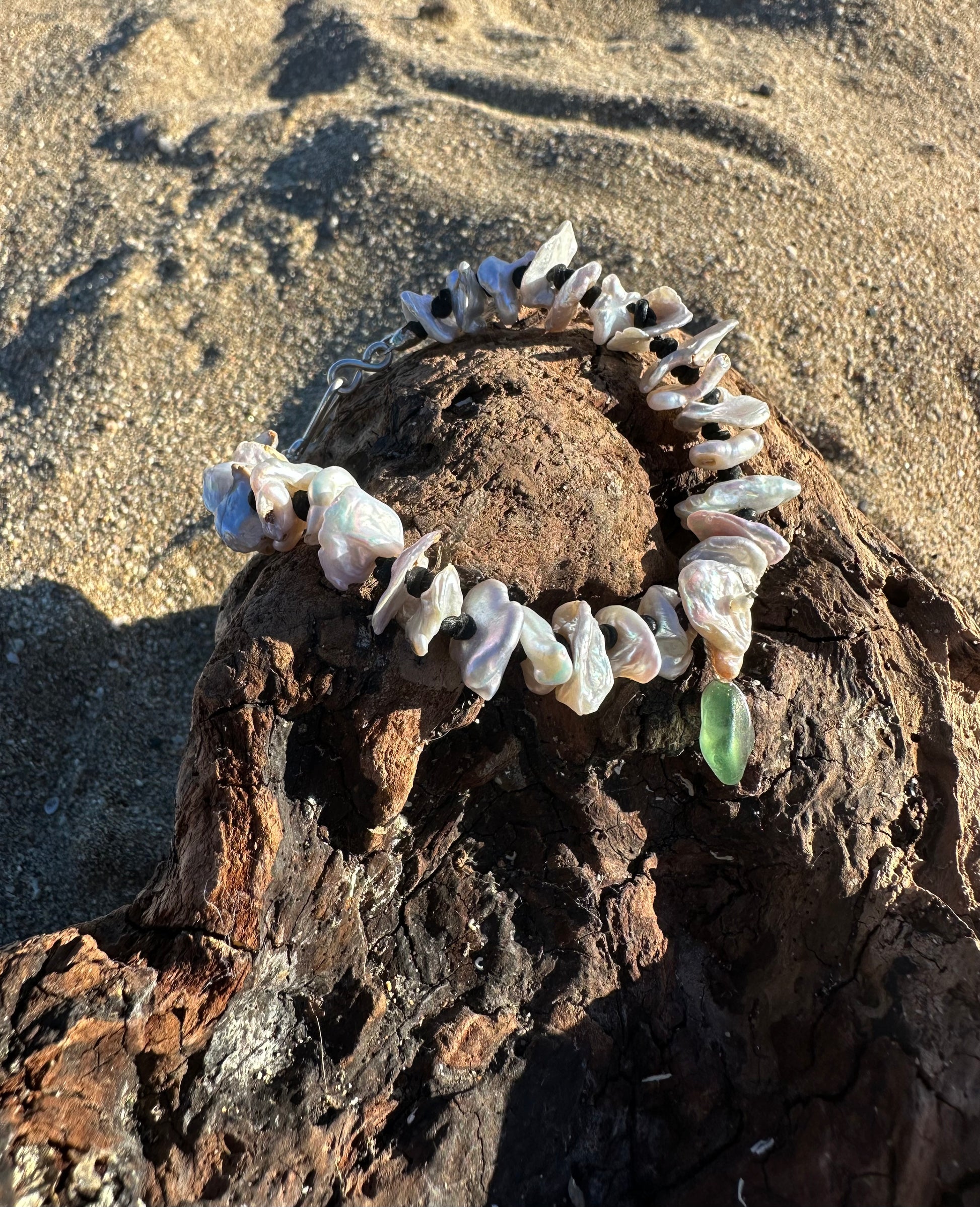 NEWT · bracelet crafted with Keshi pearls of various organic shapes, shimmering in delicate nacre tones. Each pearl has been hand-strung and knotted onto a strip of black leather. At the center, a larger Keshi pearl stands out, from which hangs a piece of turquoise sea glass. A piece that unites nature, craftsmanship, and the spirit of the sea.