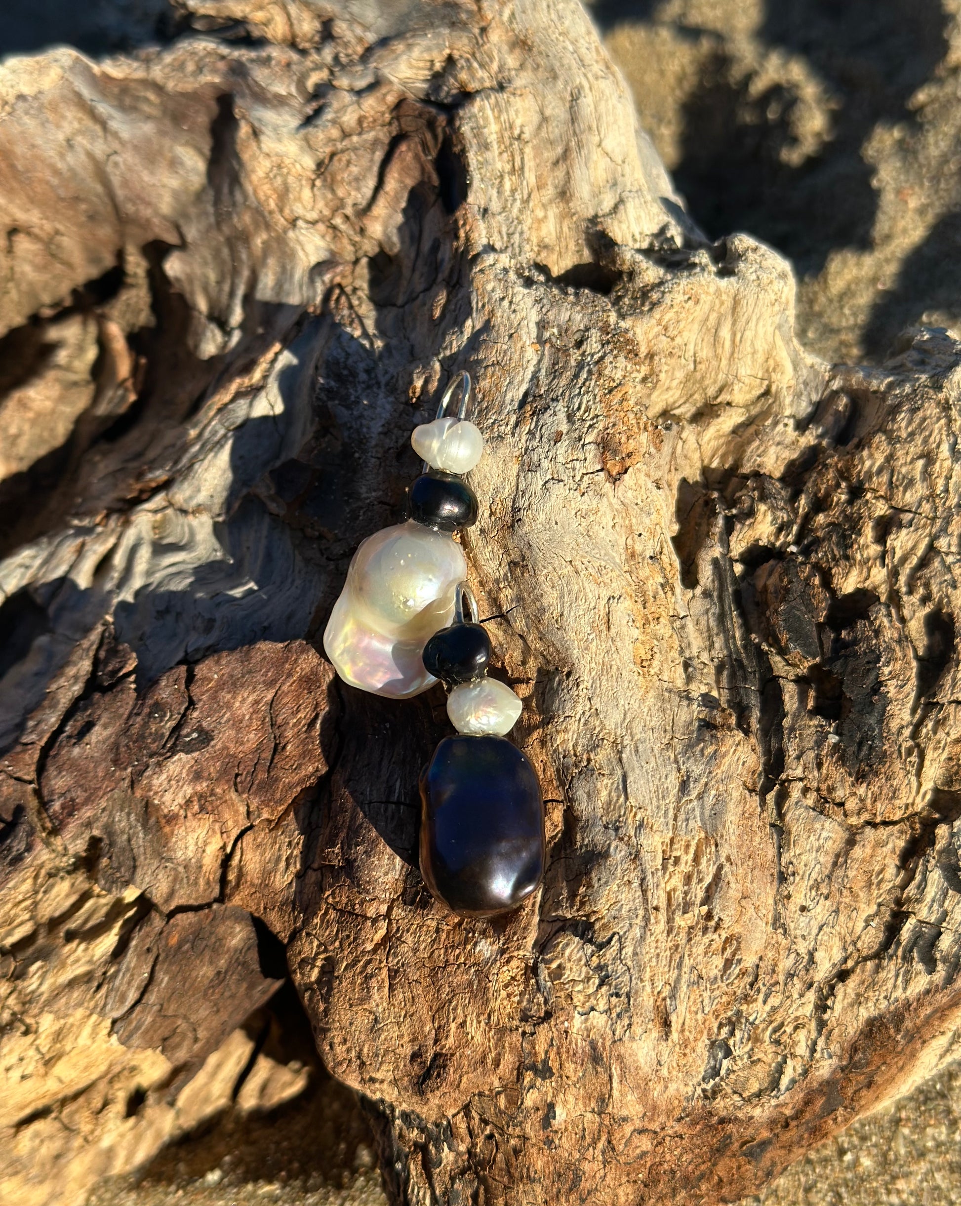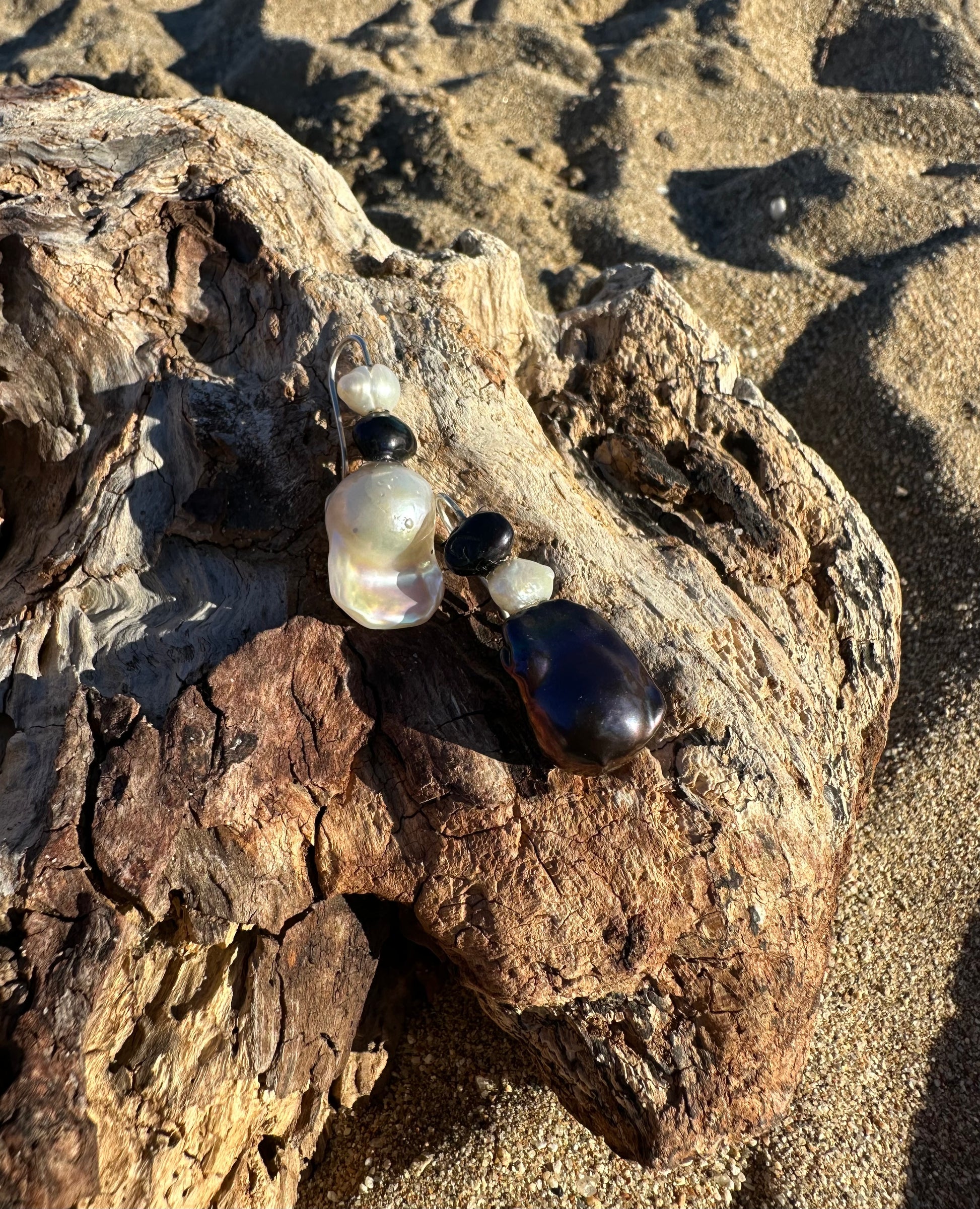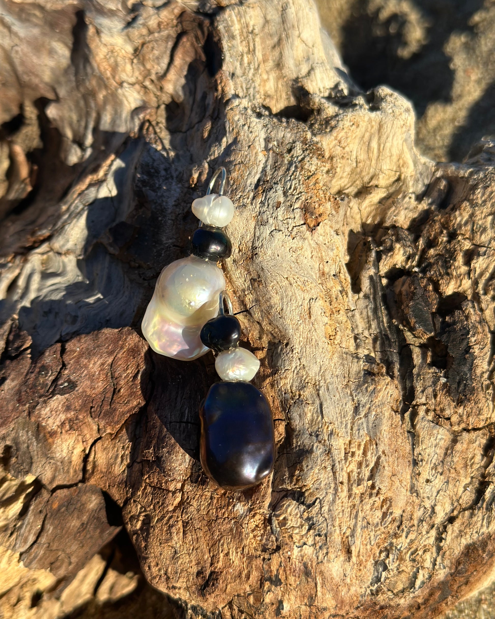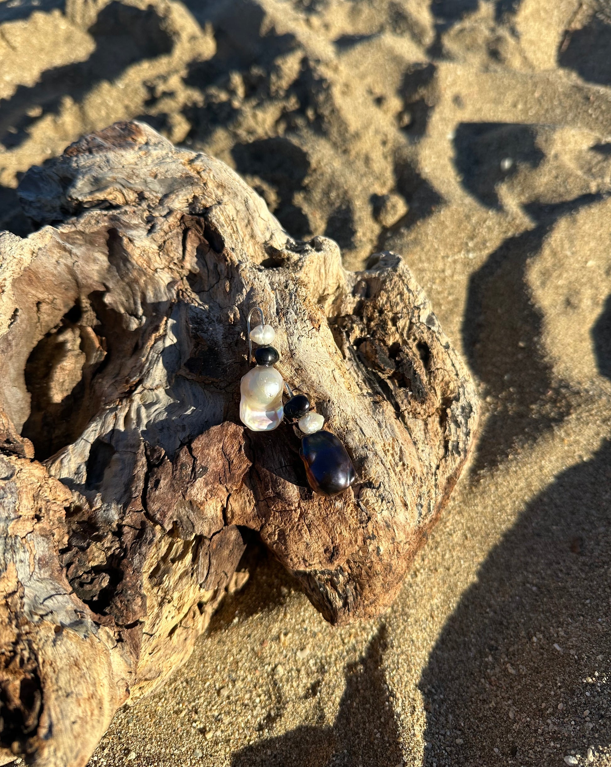 ZEBRA · asymmetrical earrings featuring two baroque pearls —one white and one dark— hanging from delicate strands of white and black freshwater pearls, suspended from a 925 sterling silver hook.