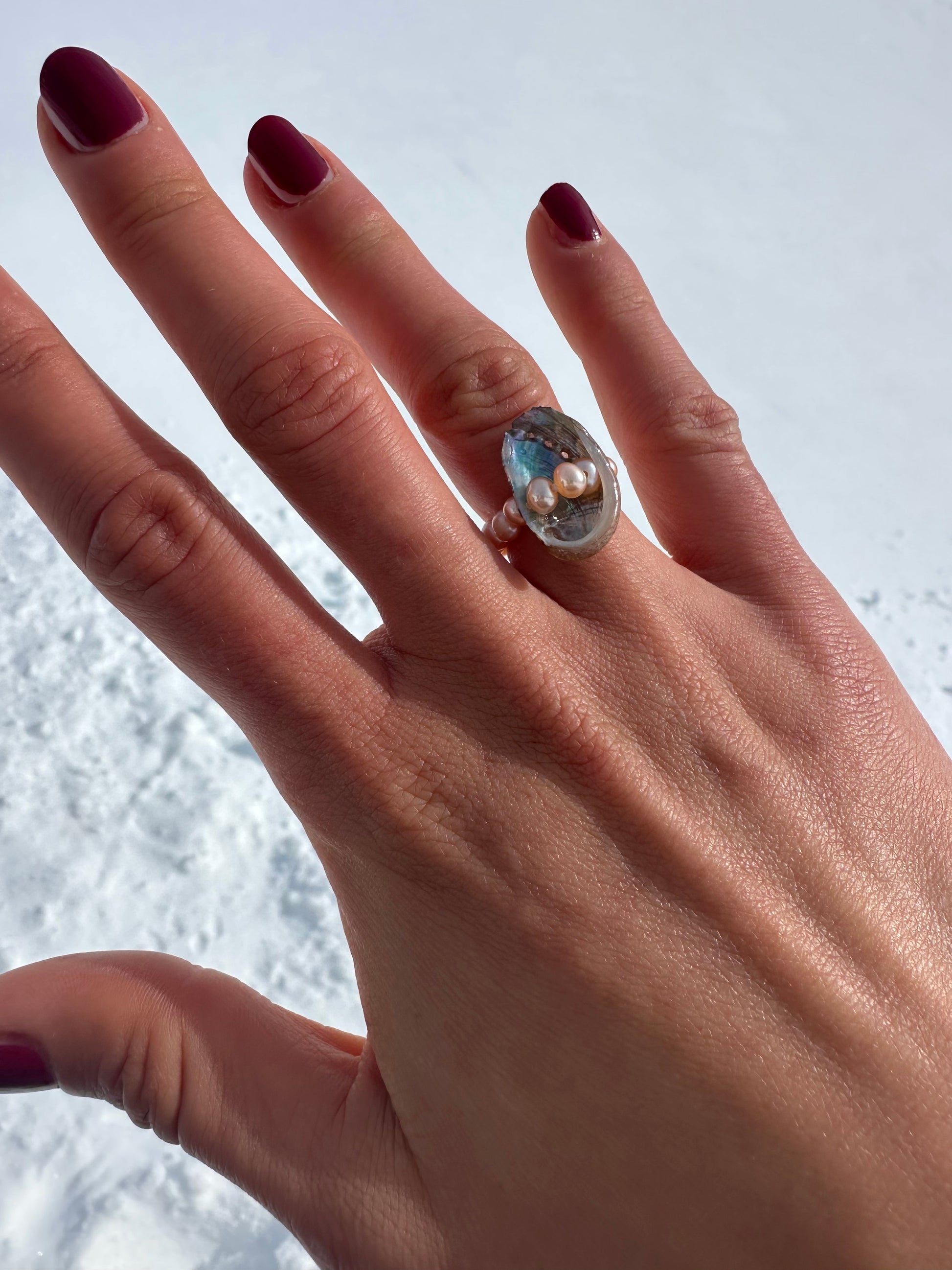 ABA · anillo elástico con una pequeña concha de abulón en el centro, que refleja sus hermosos tonos iridiscentes con destellos arcoíris. Está rodeada de perlas tipo potato de agua dulce en tonos rosados, de calidad A, que armonizan perfectamente con las tonalidades naturales de la concha.