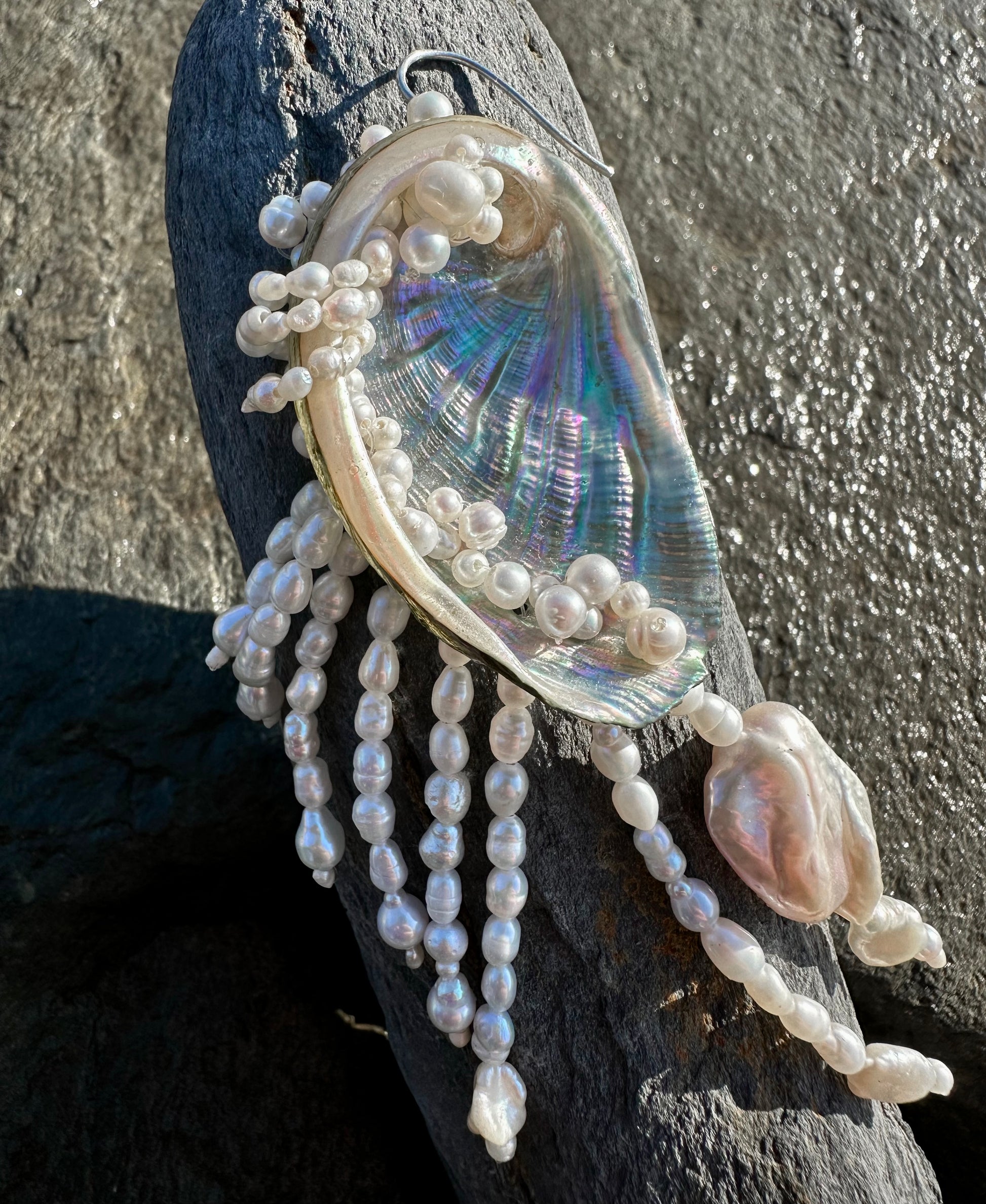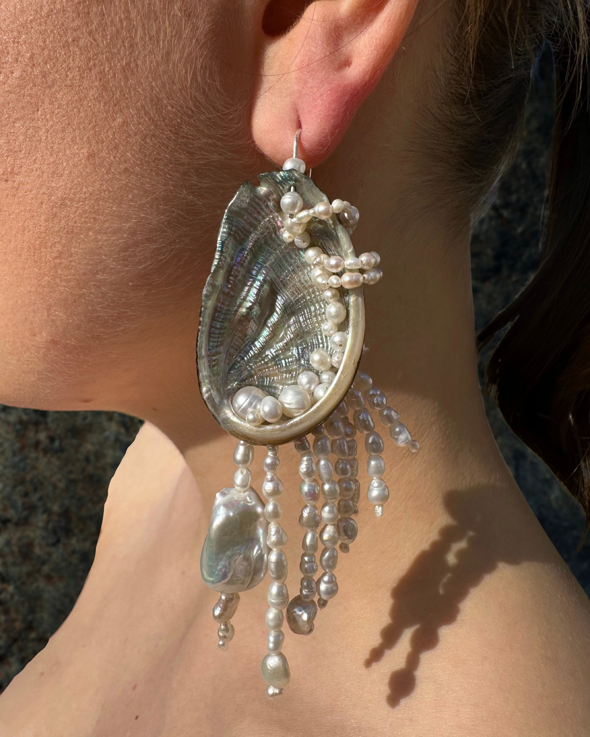 ABALUNA · pendientes asimétricos y reversibles, nacidos de dos maravillosas conchas de abalone. Cada una ha sido vestida con unas doscientos cuarenta diminutas perlas de agua dulce, colocadas a mano por dentro y por fuera como si fuesen plumas que emergen suavemente del mar.