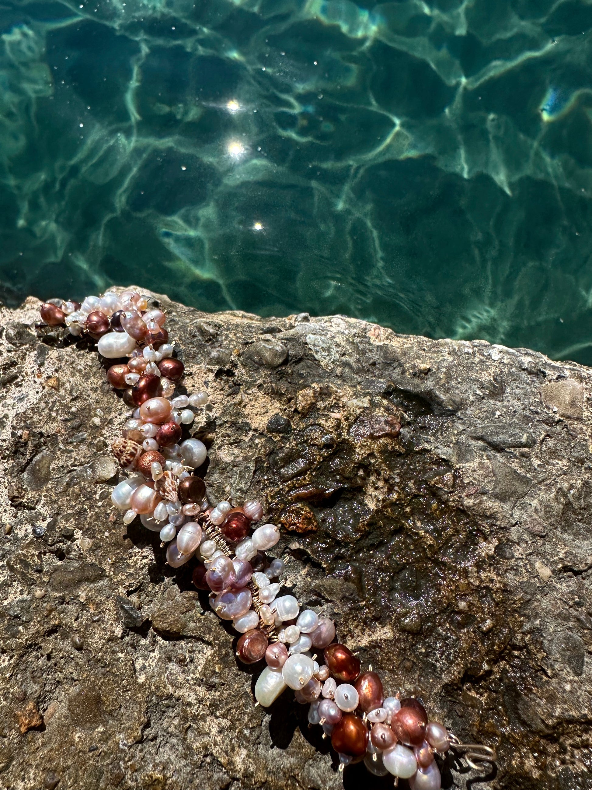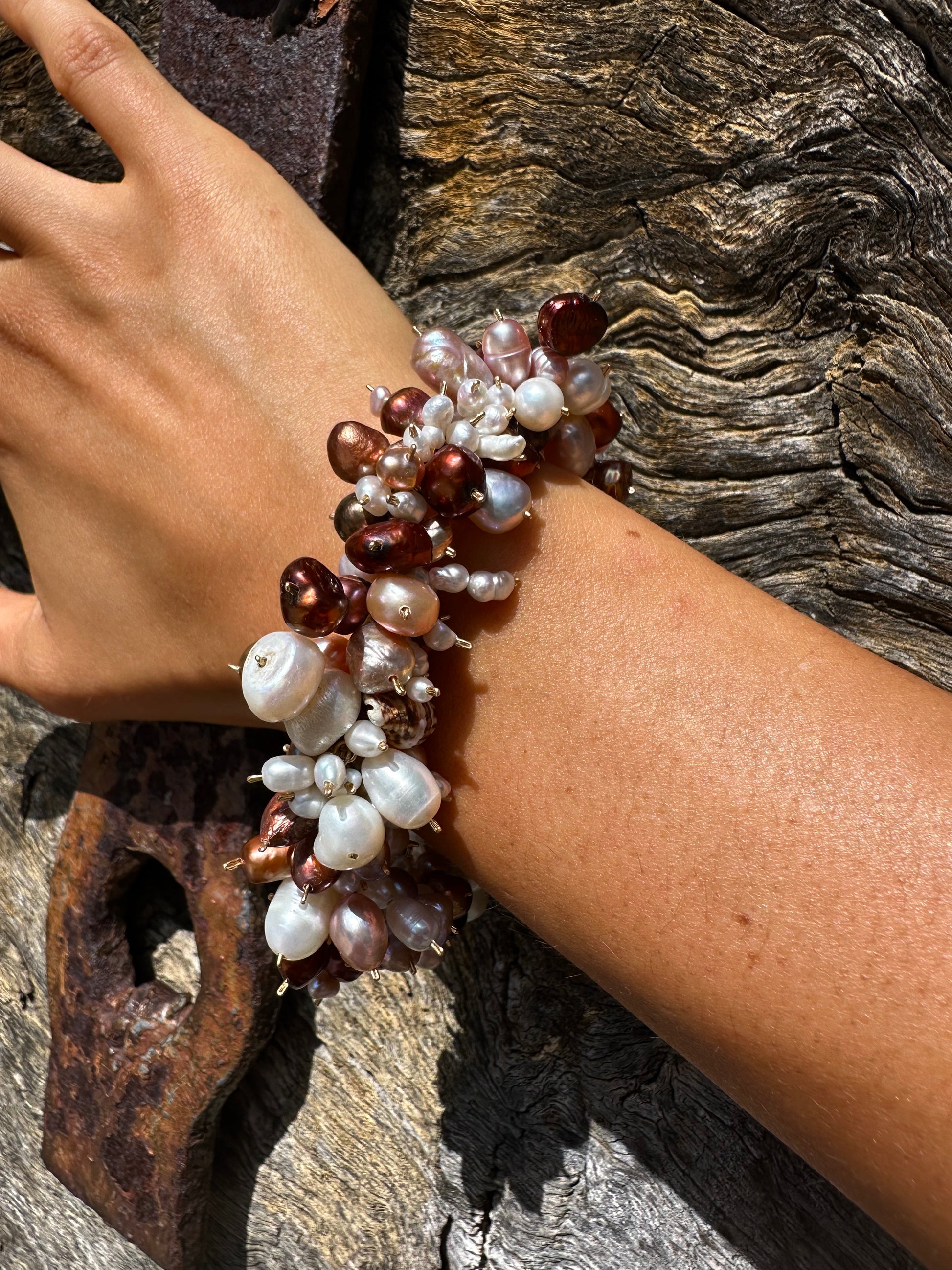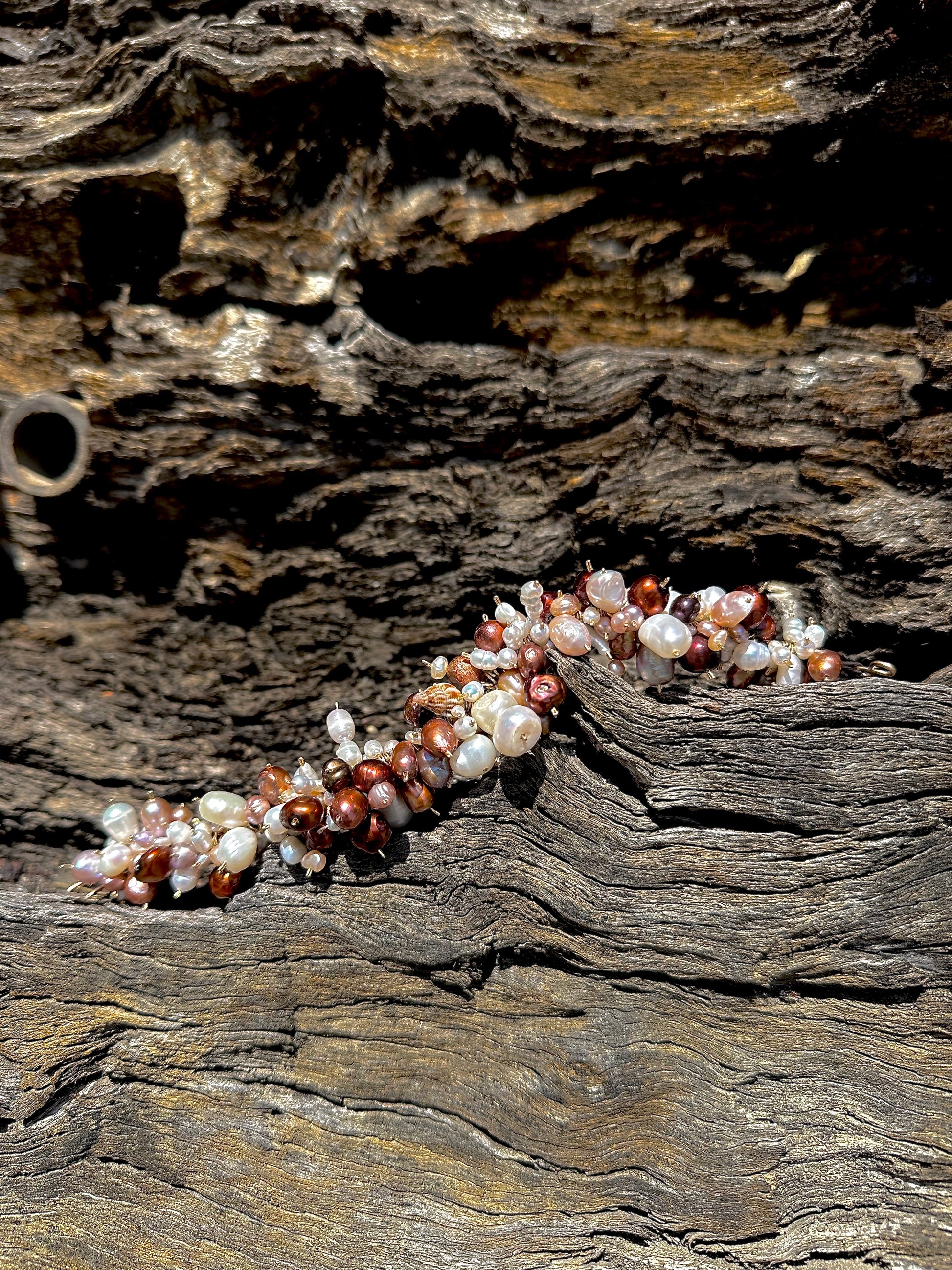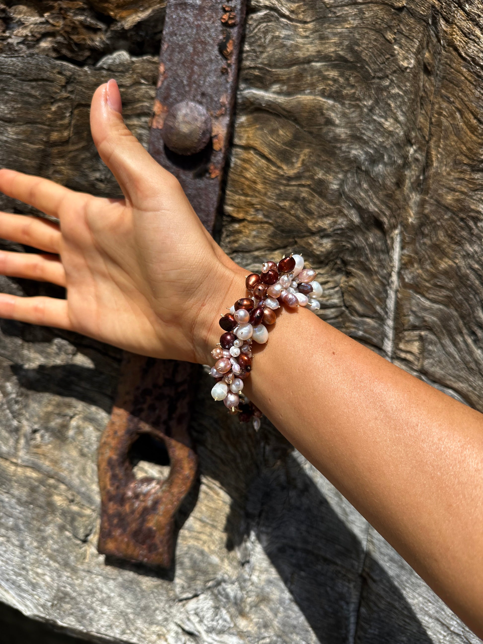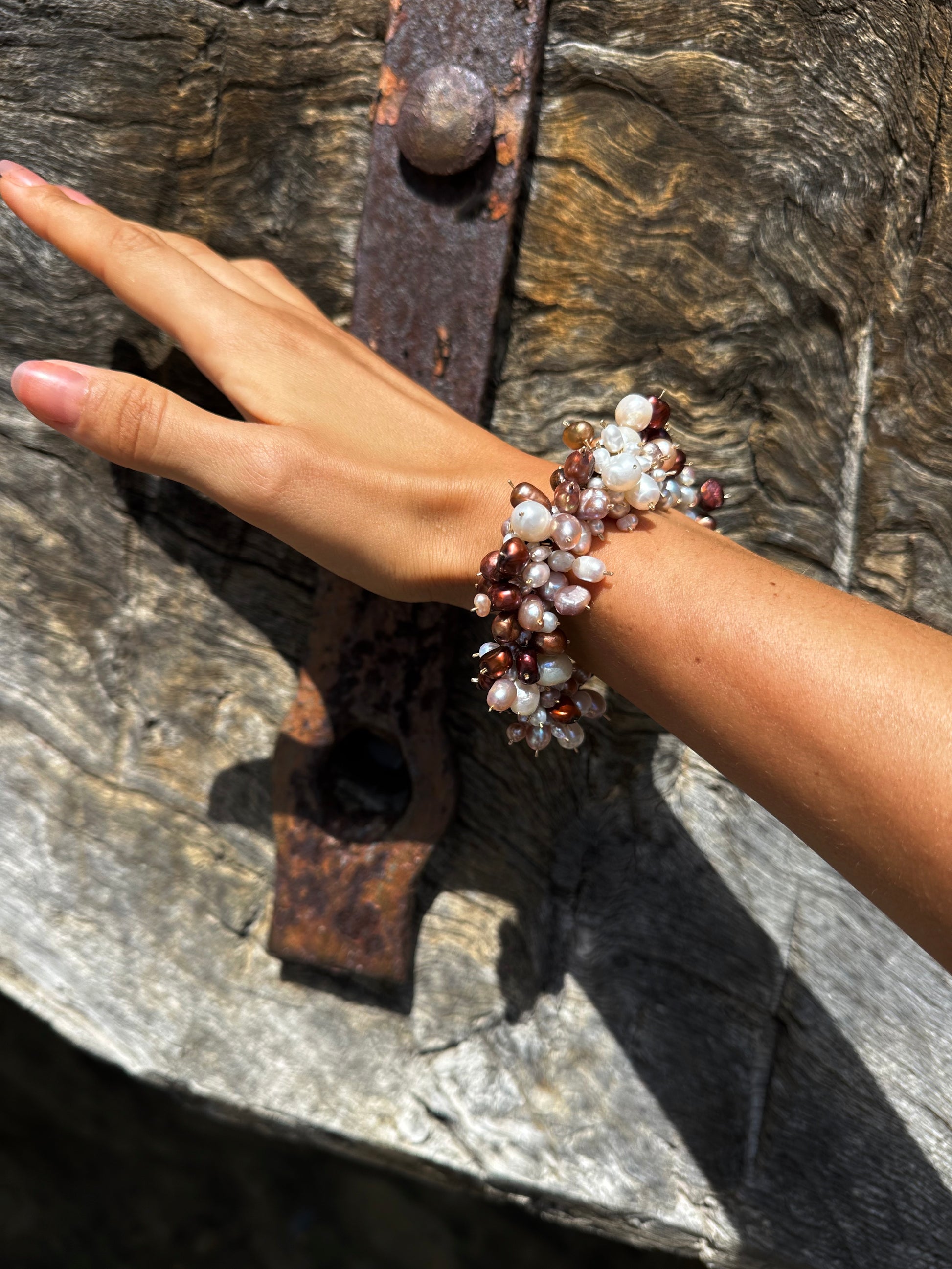 ADELA · pulsera llamativa compuesta por varias perlas de agua dulce, cada una cuidadosamente fijada a mano, una por una, sobre alambre 14k gold filled. Las perlas presentan una paleta cálida y natural con tonos bronce, marrón, rojizo, rosado, dorado y blanco. Todas están montadas sobre una base de cuerda satinada oscuro marrón que aporta contraste y carácter al diseño.