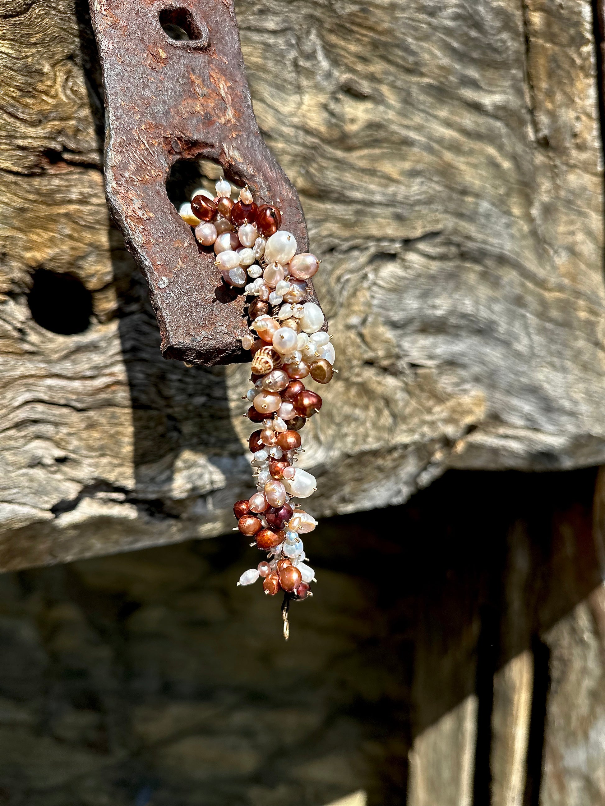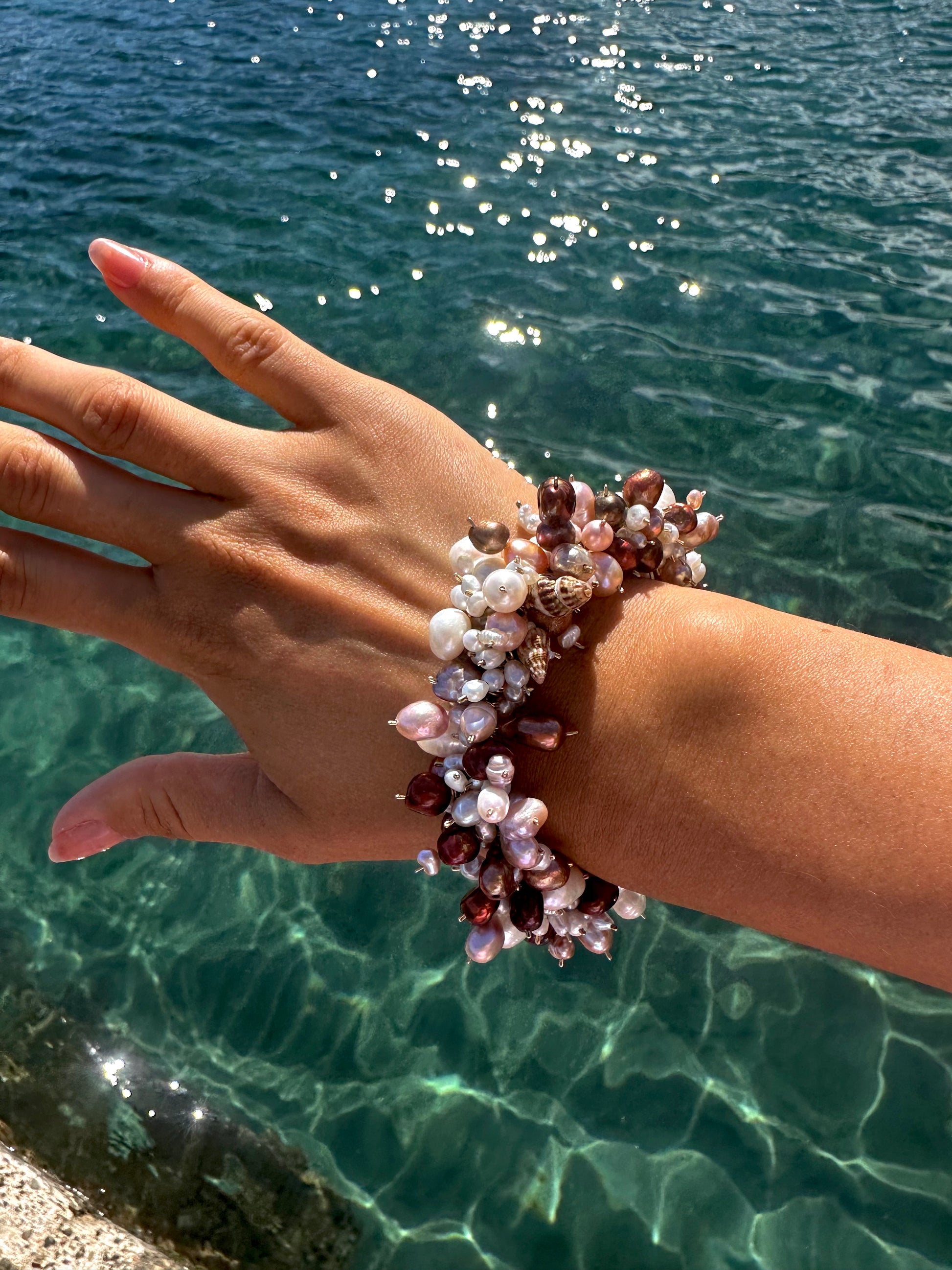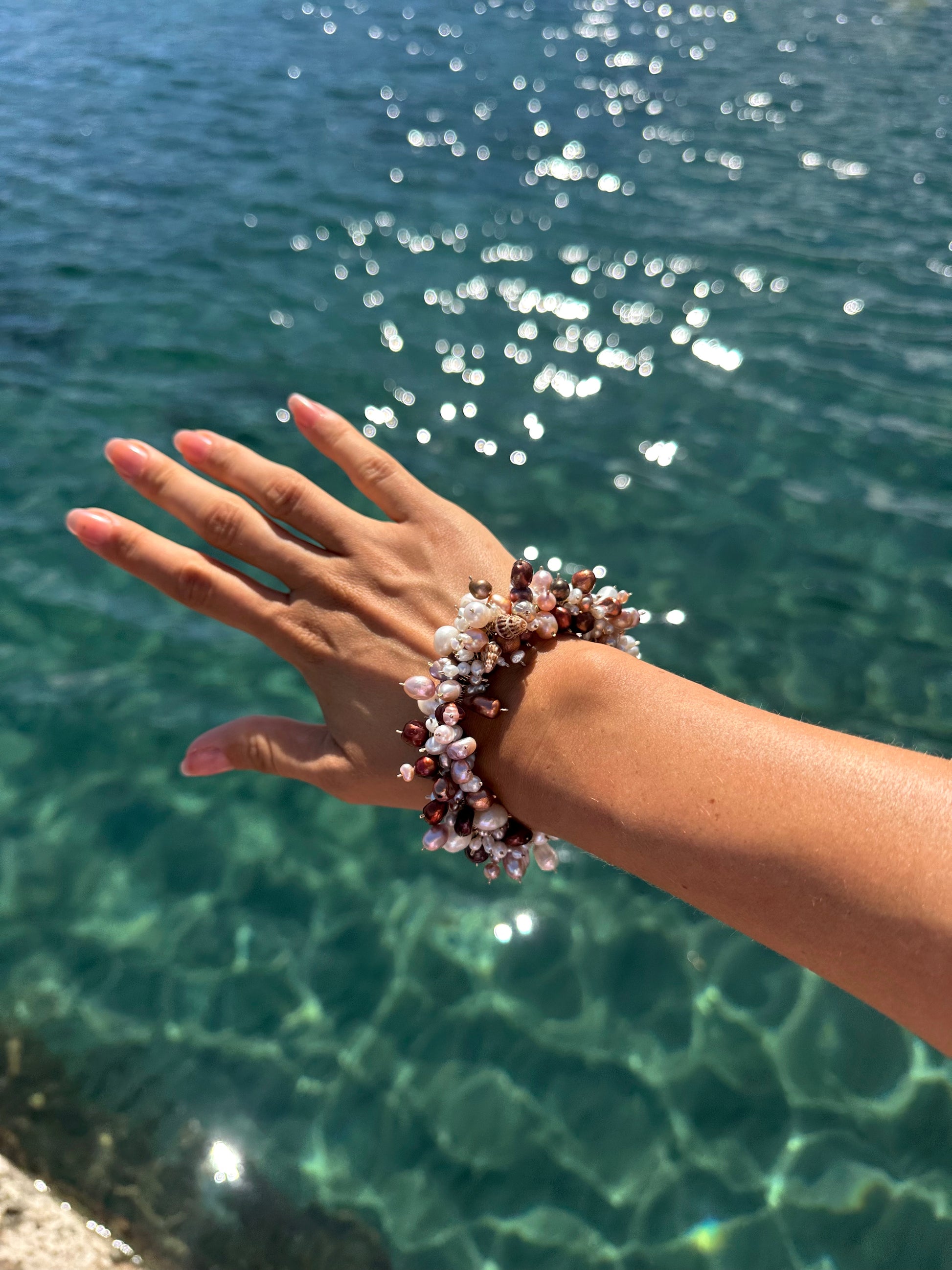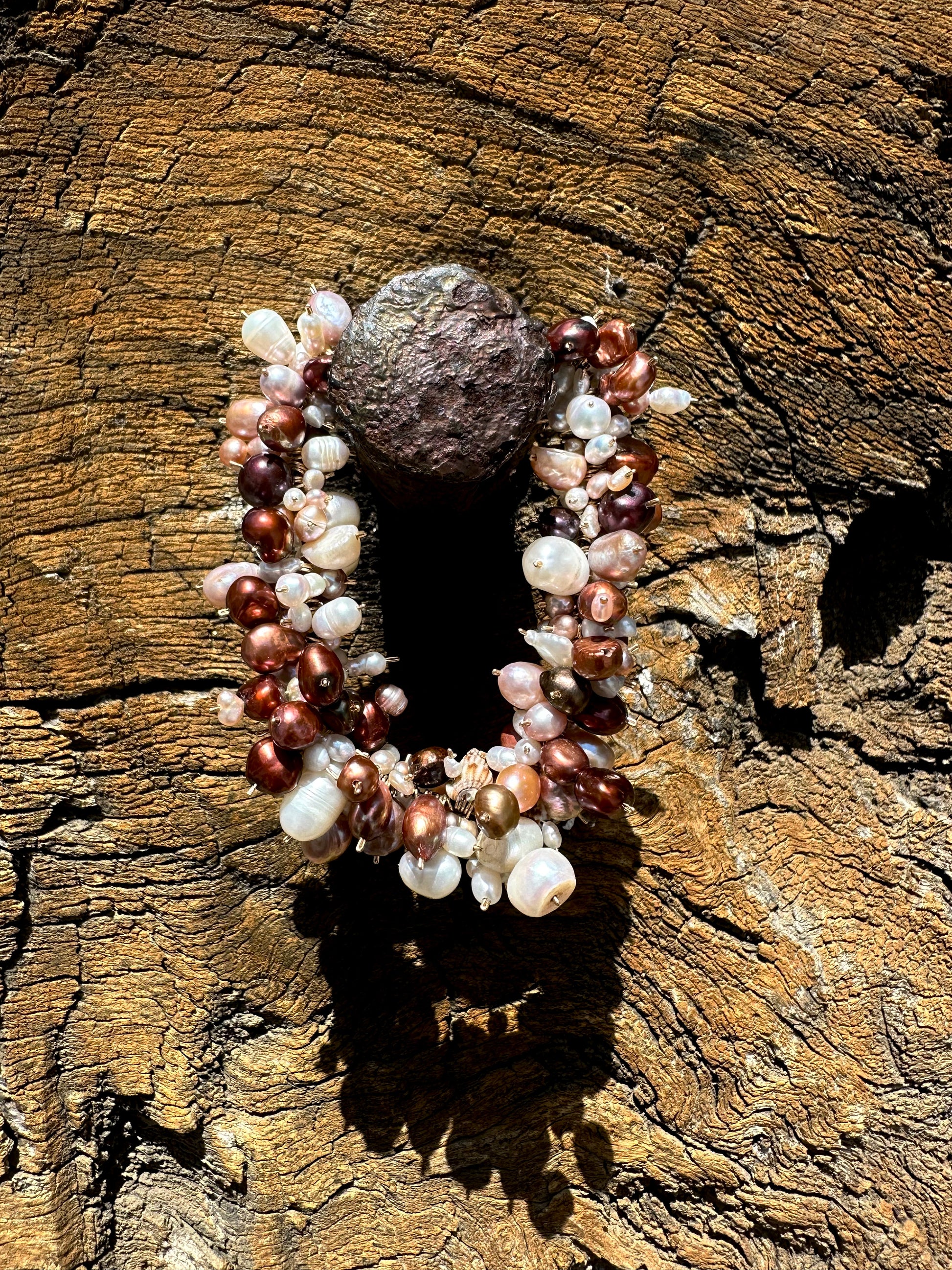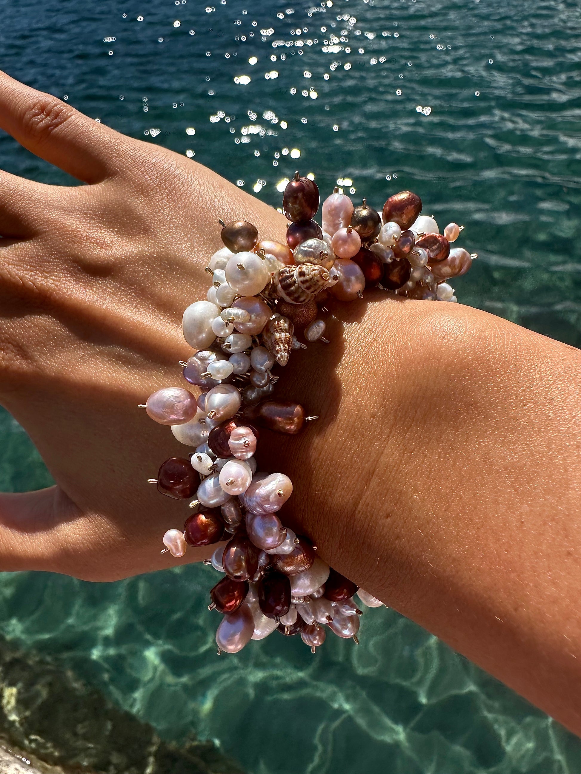 ADELA · pulsera llamativa compuesta por varias perlas de agua dulce, cada una cuidadosamente fijada a mano, una por una, sobre alambre 14k gold filled. Las perlas presentan una paleta cálida y natural con tonos bronce, marrón, rojizo, rosado, dorado y blanco. Todas están montadas sobre una base de cuerda satinada oscuro marrón que aporta contraste y carácter al diseño.