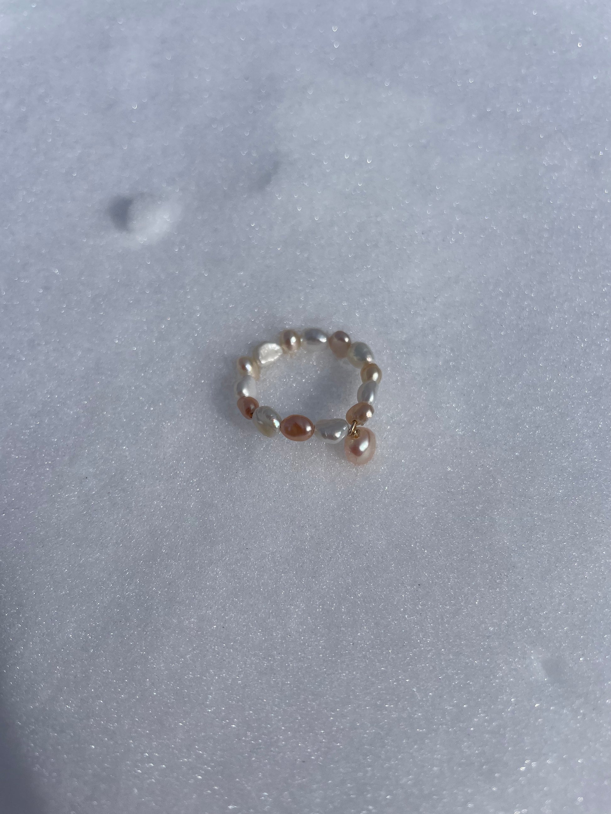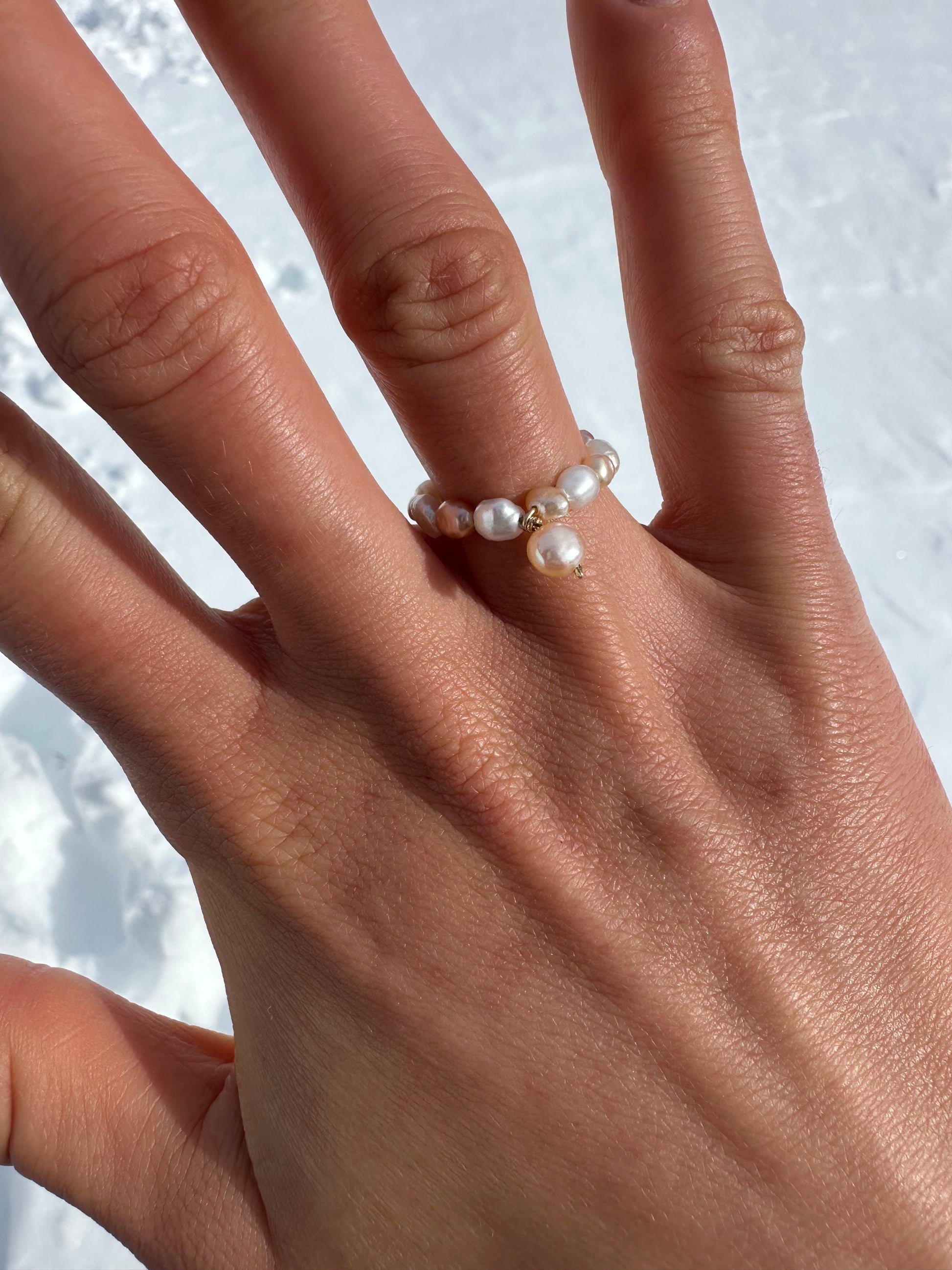 ALBA · anillo cuyo interior está elaborado con alambre gold filled de 14K y rodeado de pequeñas perlas de agua dulce en delicados tonos blanco-rosé. Como detalle especial, en el centro destaca una perla rosada suspendida en alamble gold filled de 14K, que cae suavemente aportando movimiento y elegancia a la pieza.