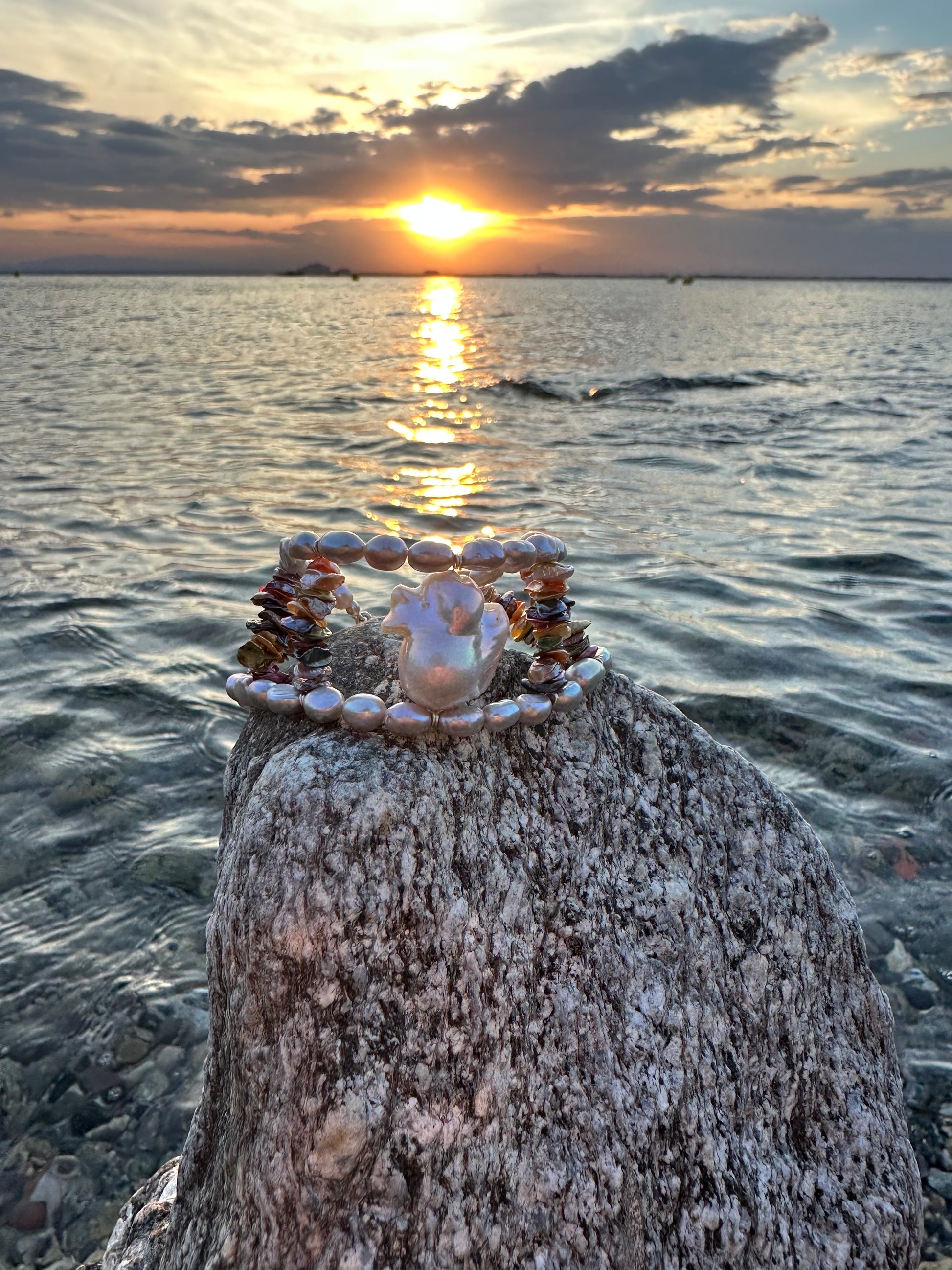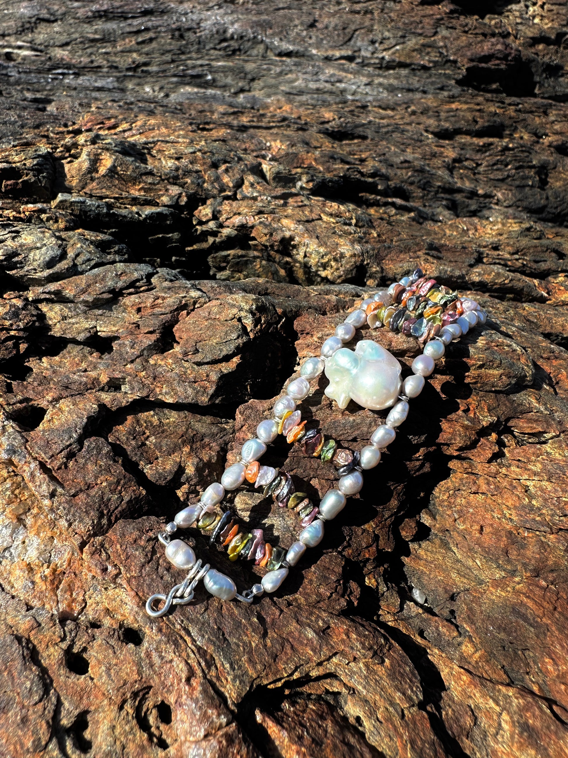 El diseño se enmarca con dos hileras de elegantes perlas de agua dulce plateadas, que aportan equilibrio y realce, convirtiendo la pieza en una joya artesanal llena de carácter y singularidad.
