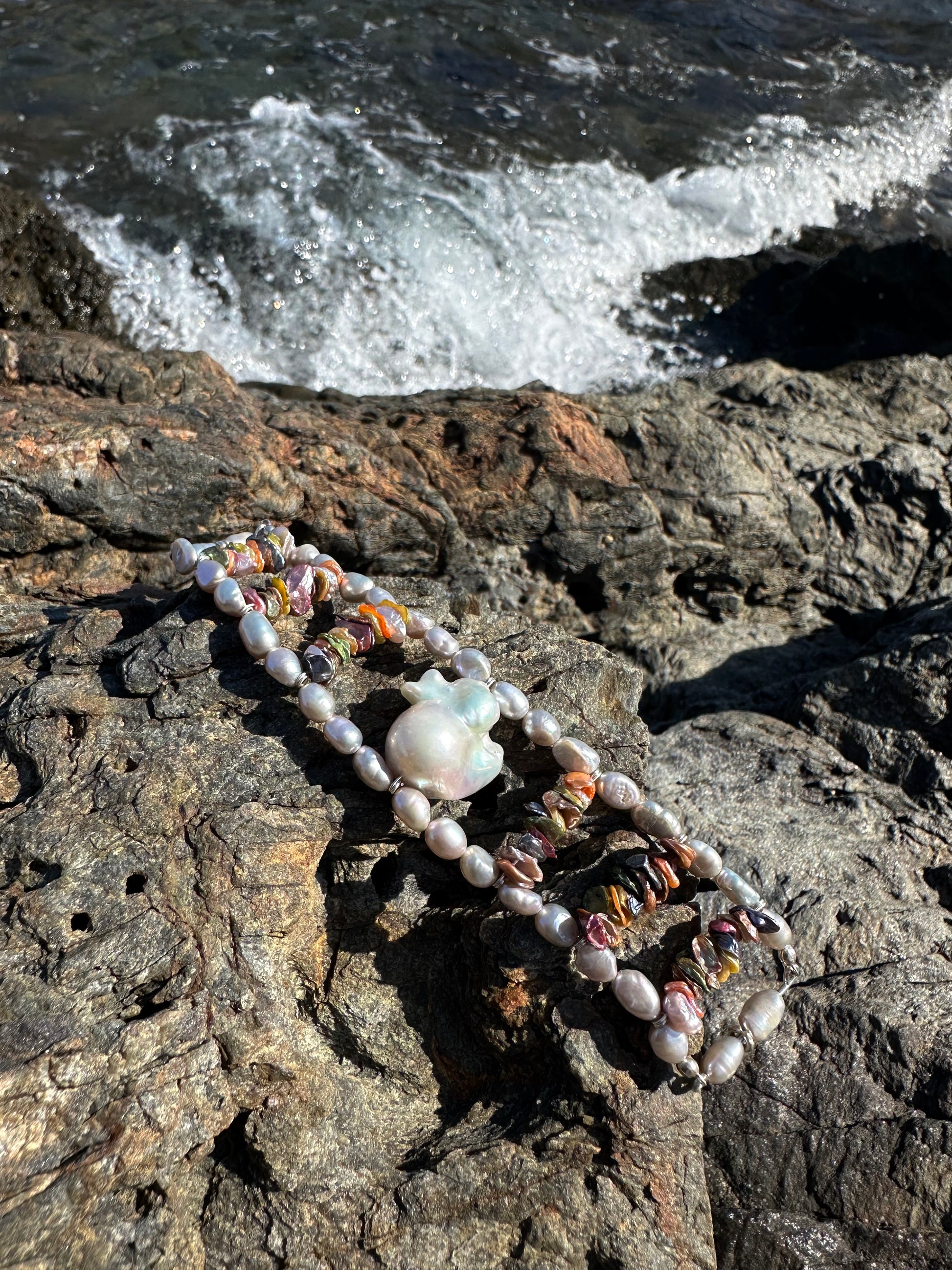 DONALD DUCK · en el centro de esta creación destaca una imponente perla barroca, cuya forma evoca la silueta de un pequeño pato. A cada lado, delicados racimos de perlas keshi en tonos vibrantes se entrelazan sobre fino hilo de plata 925, trabajado cuidadosamente a mano.