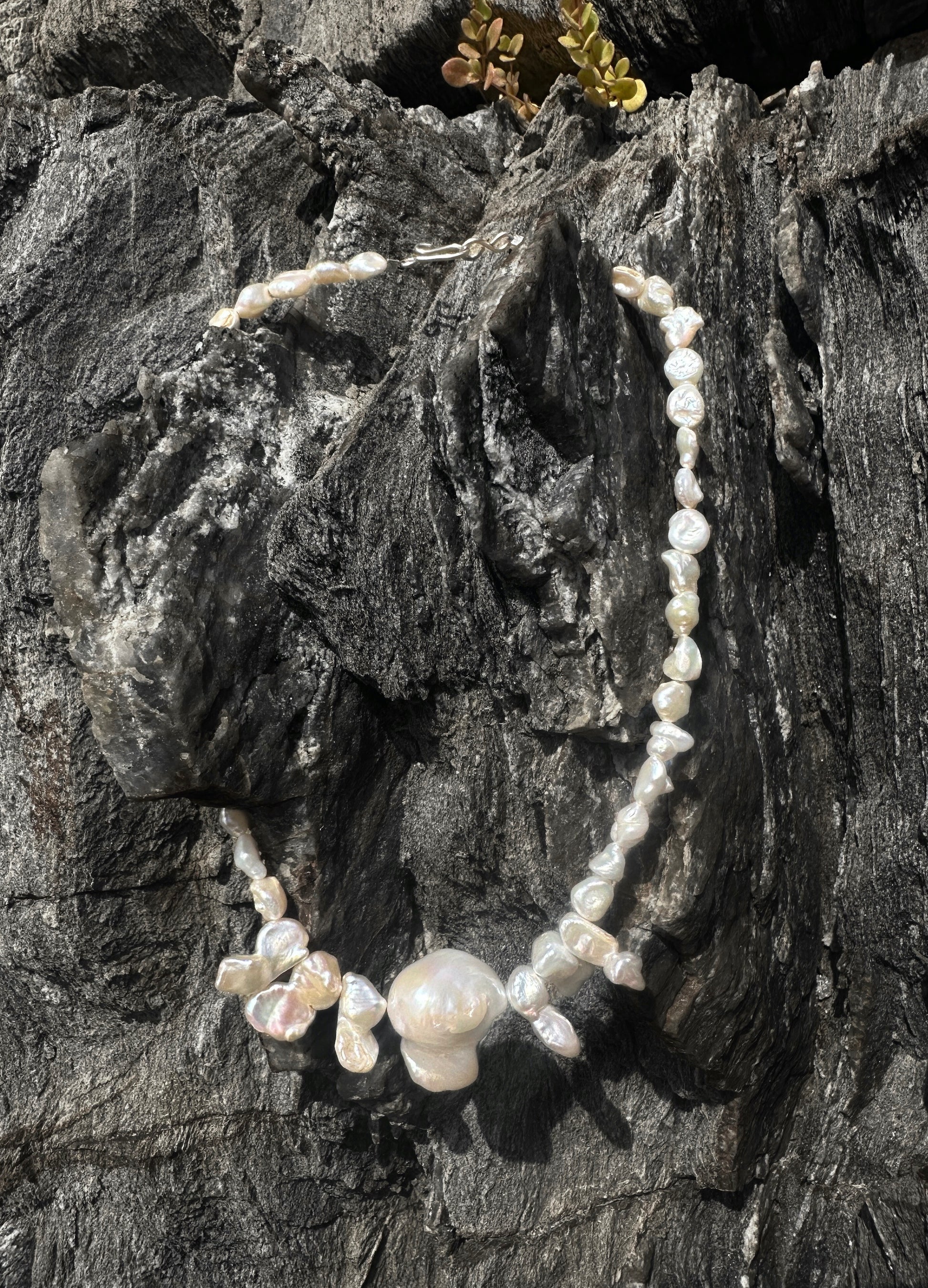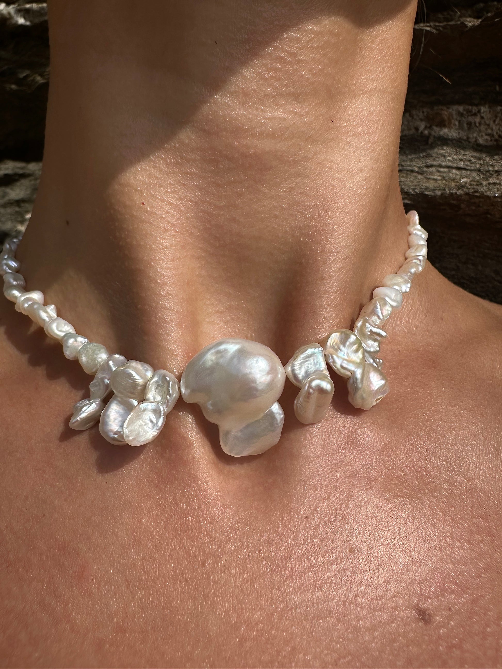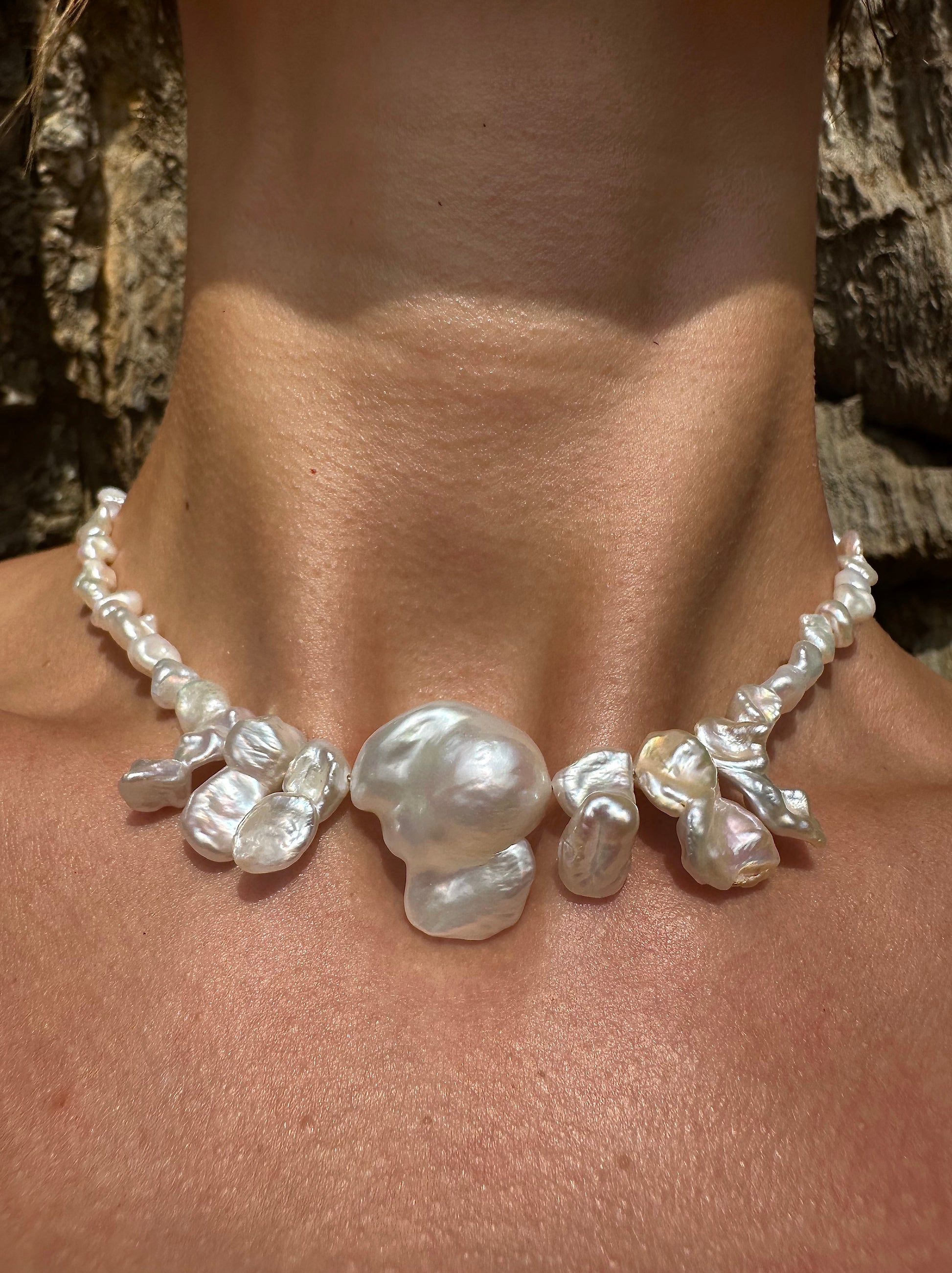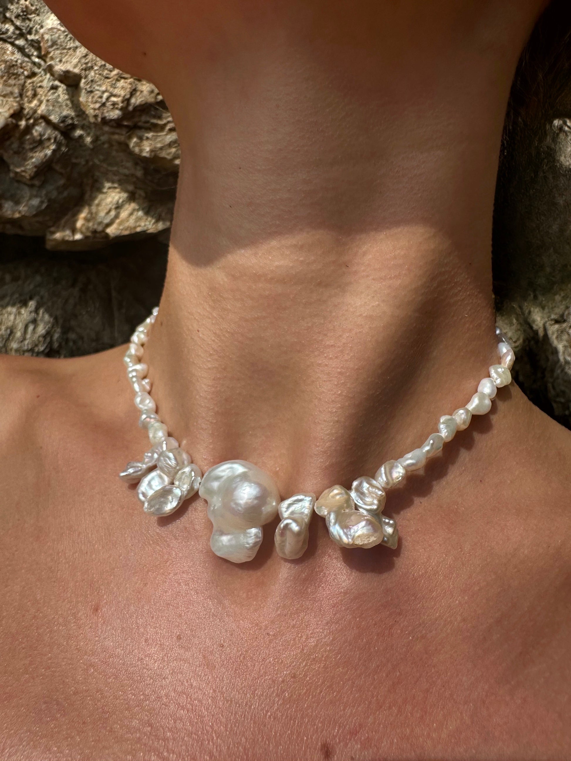 ANDER · collar compuesto por una gran perla barroca de forma orgánica en el centro, rodeada de seis perlas barrocas más pequeñas y numerosas perlas de agua dulce en formas irregulares y naturales.