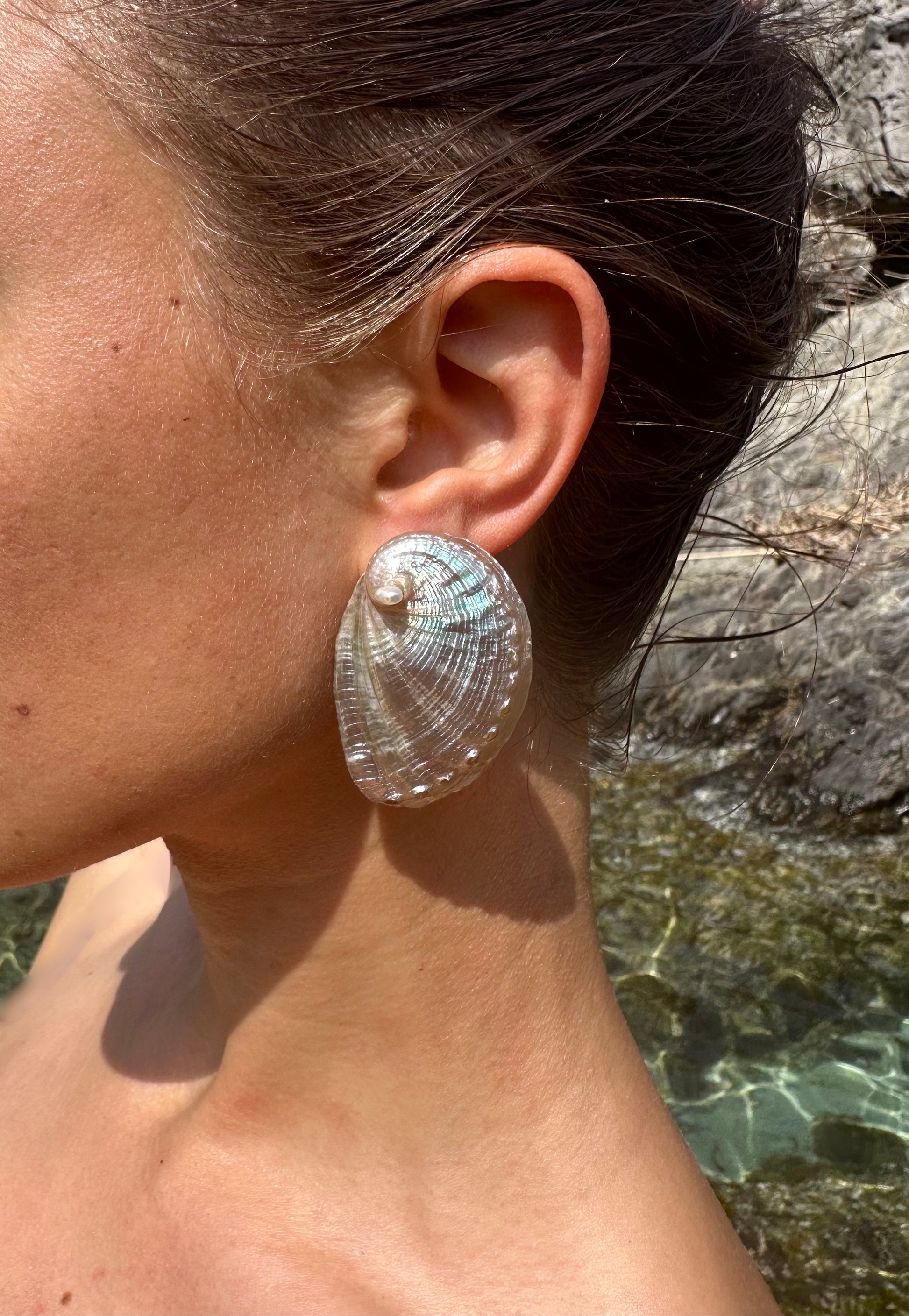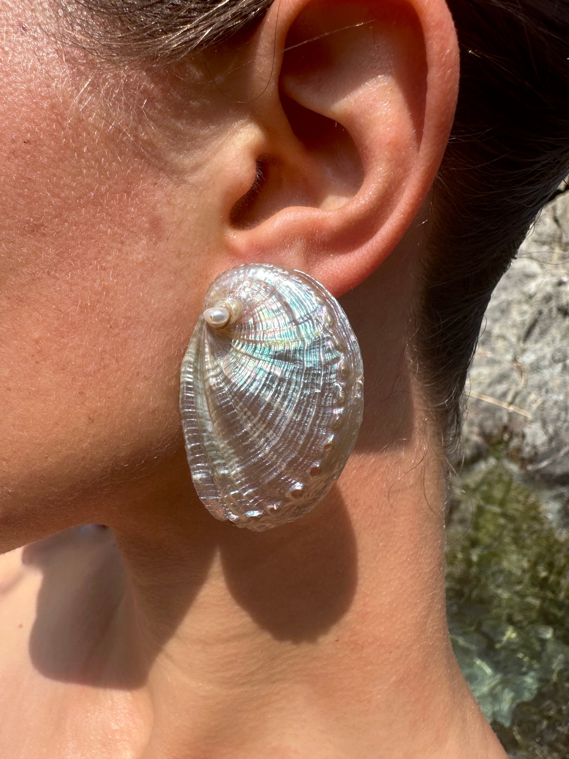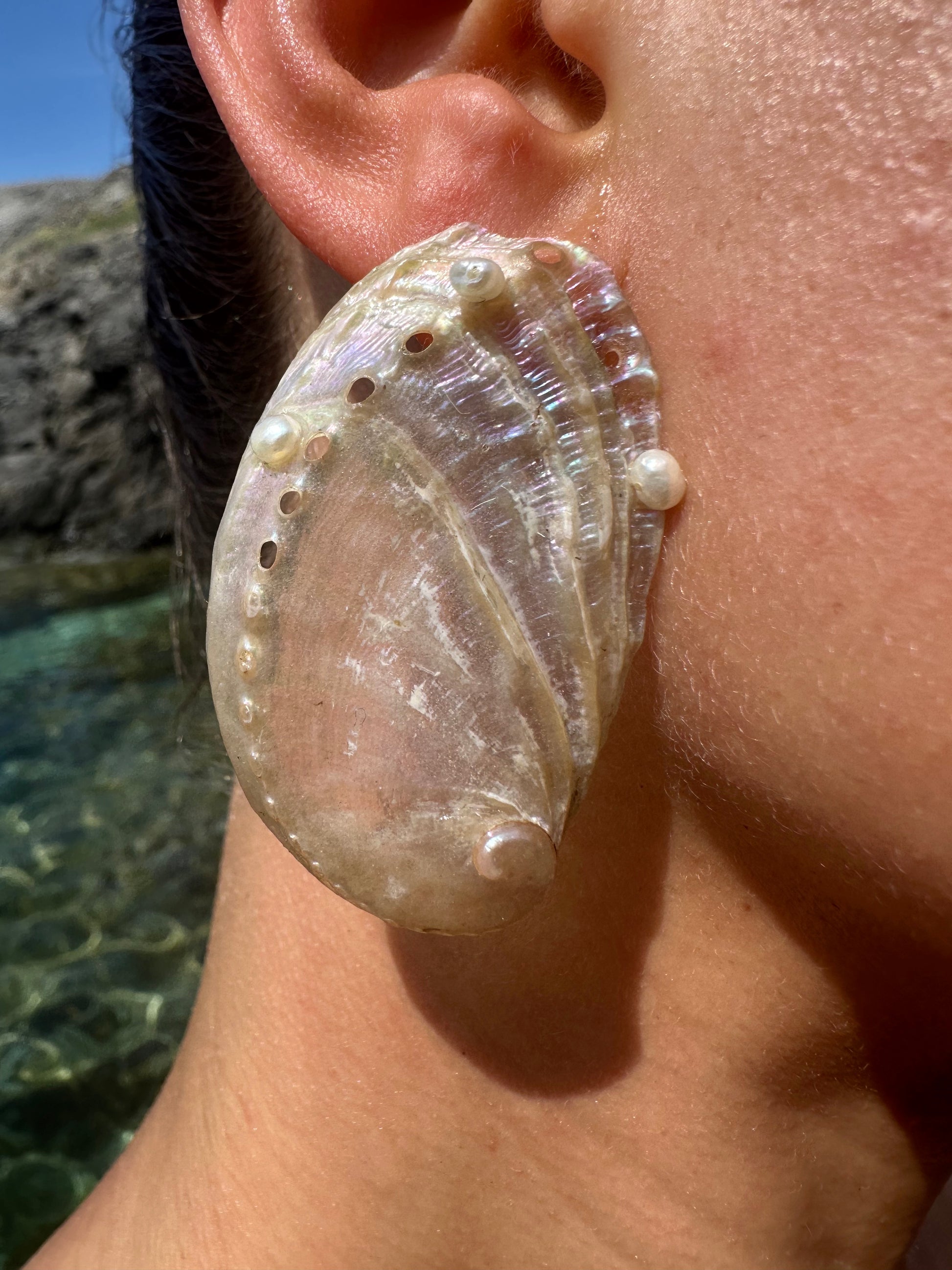 AVA · pendientes elaborados con dos grandes conchas de abulón en tonos nacarados, decoradas con pequeñas perlas de agua dulce y montadas sobre pasadores de plata de ley 925.