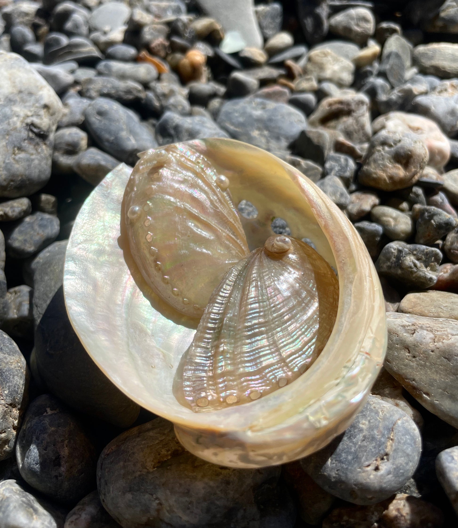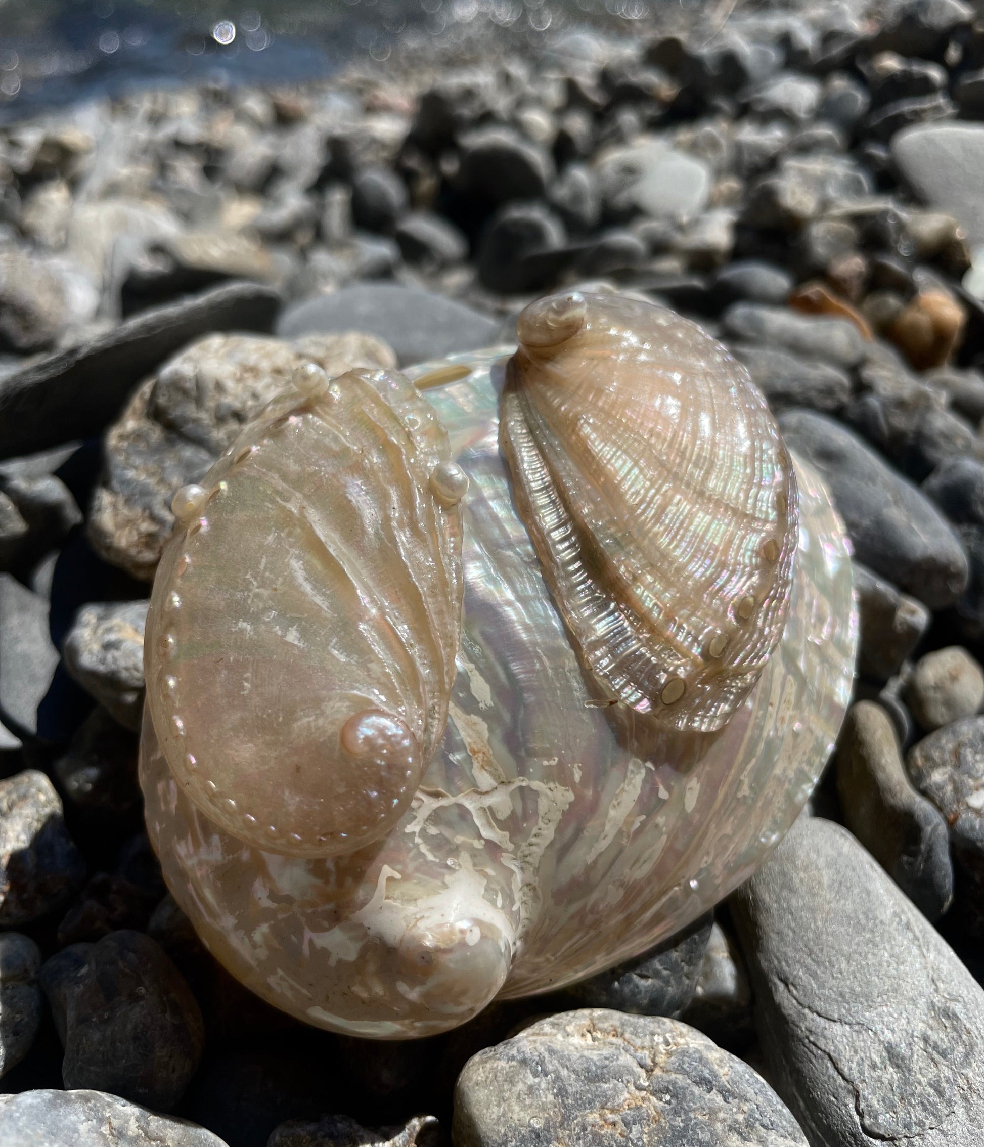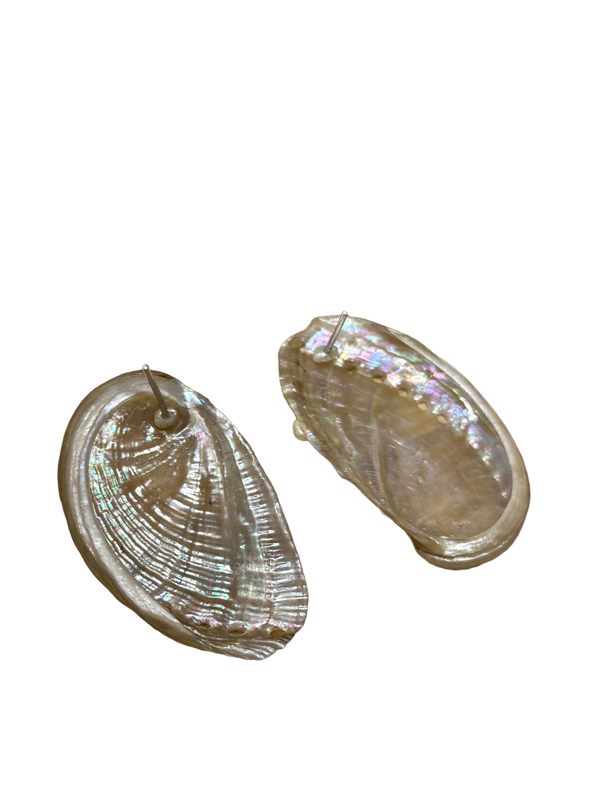 AVA · pendientes elaborados con dos grandes conchas de abulón en tonos nacarados, decoradas con pequeñas perlas de agua dulce y montadas sobre pasadores de plata de ley 925.