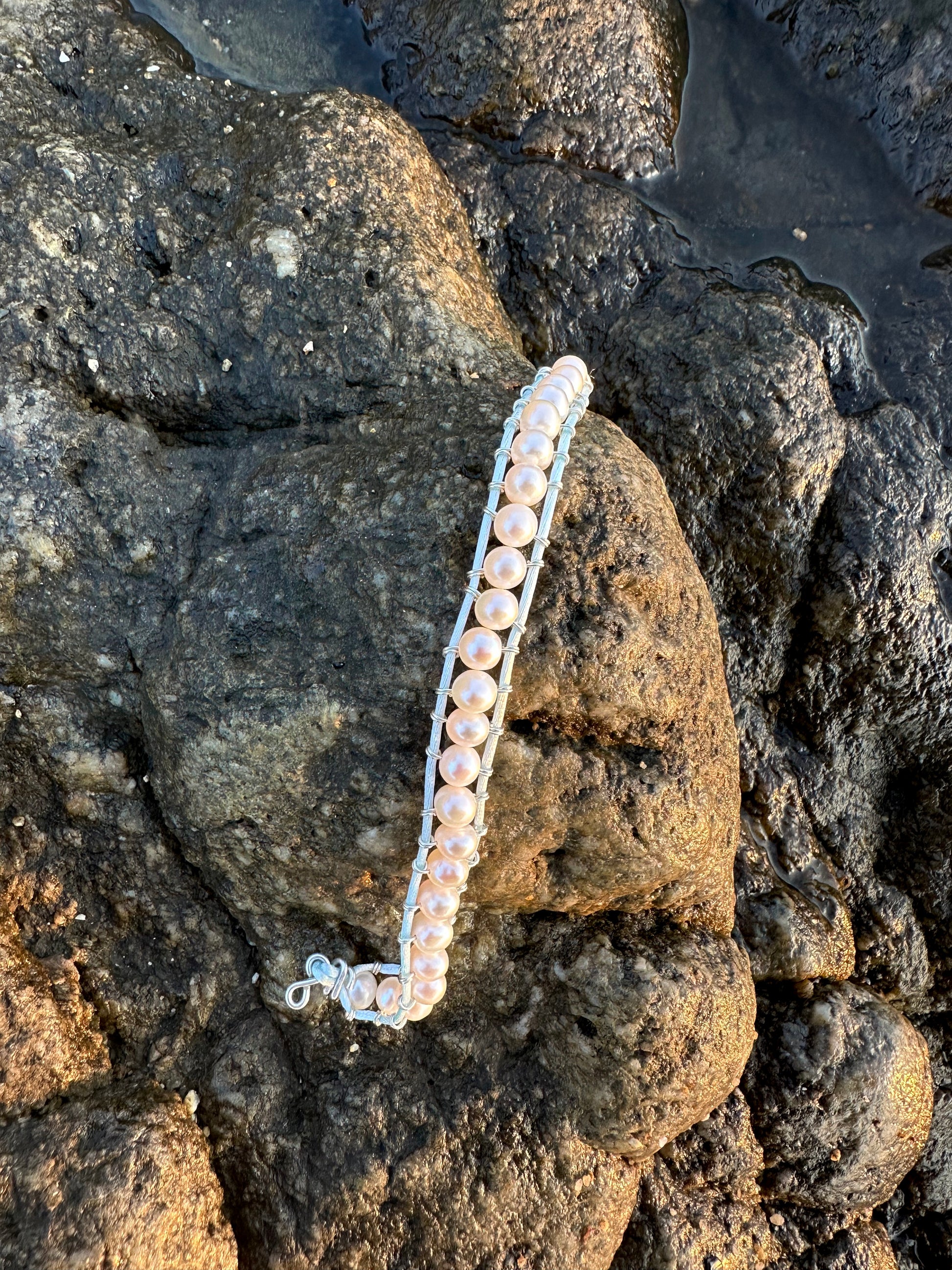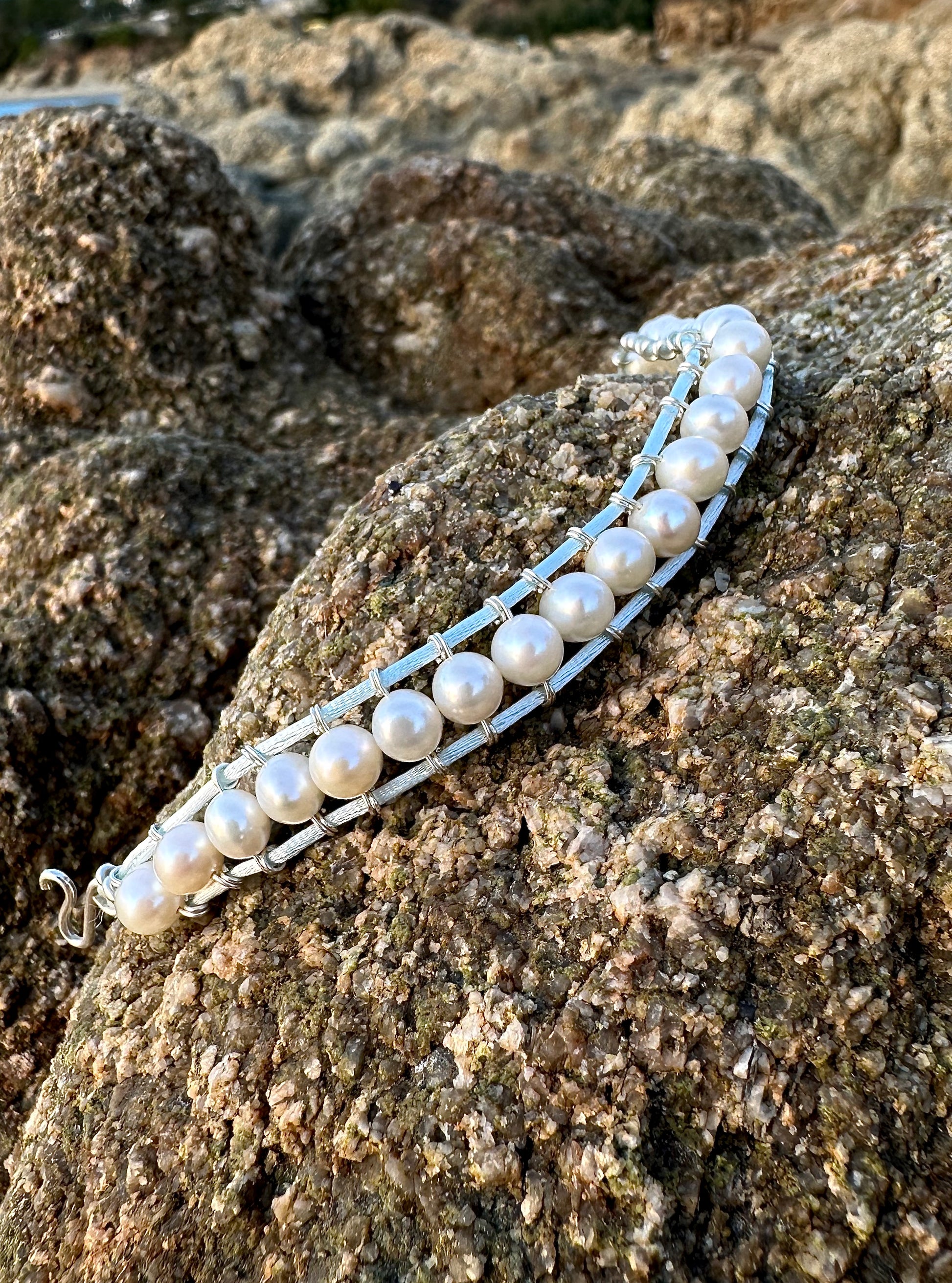 AZUL · una pulsera fina y elegante, elaborada a mano con perlas de agua dulce de calidad A, con forma orgánica tipo “patata”. Cada perla ha sido cuidadosamente ensartada en delicados hilos de plata, reflejando un trabajo artesanal lleno de detalle y precisión.