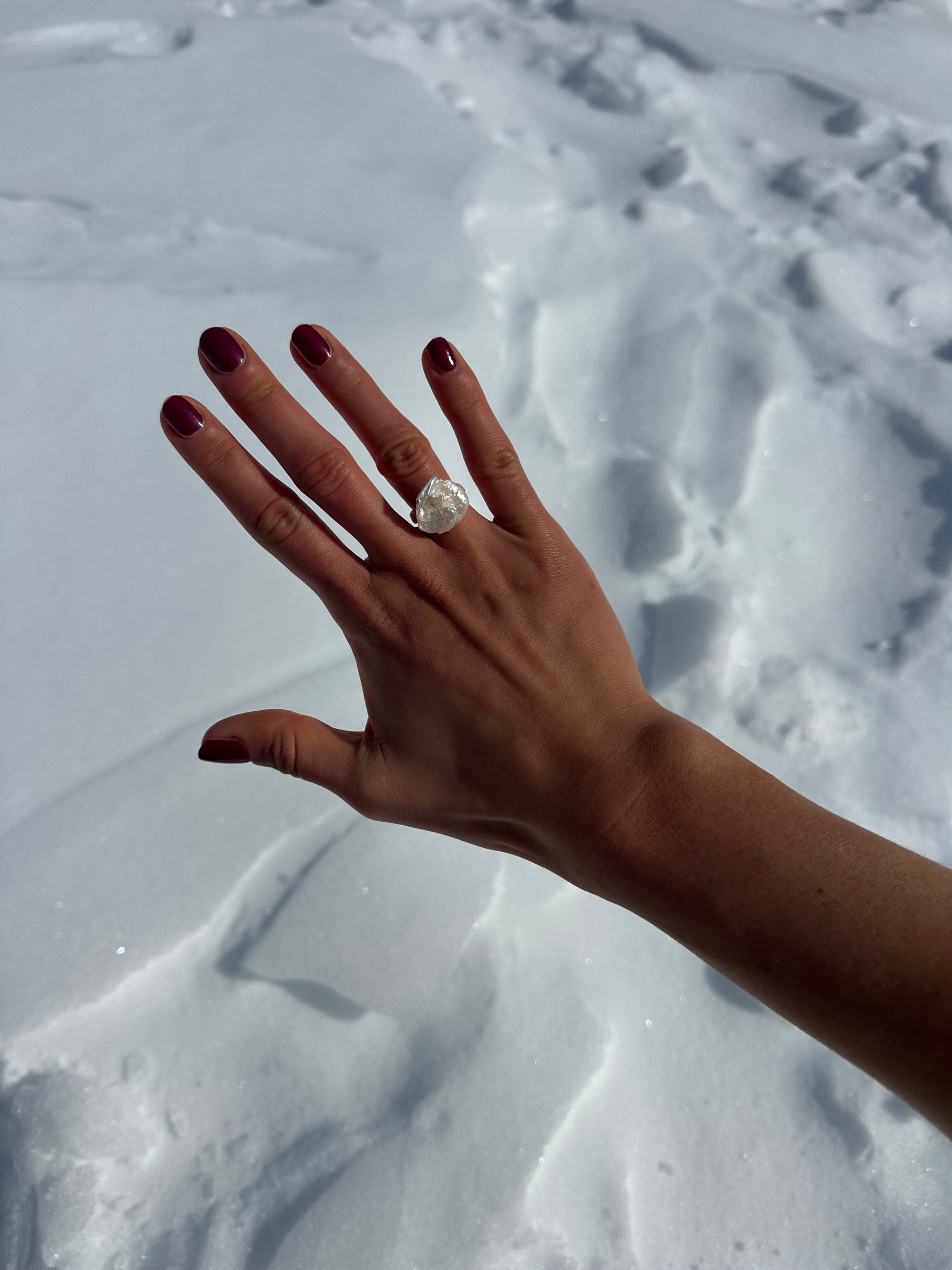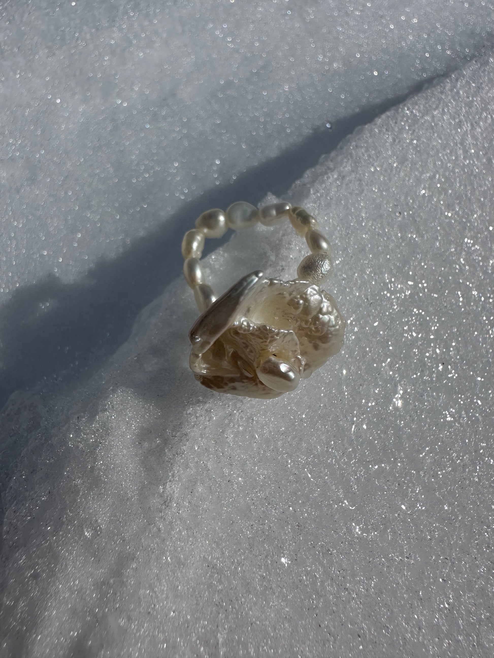 BEGONY · anillo elástico con una perla Keshi de forma floral en el centro, delicadamente adornada por una pequeña perla de agua dulce en su núcleo.