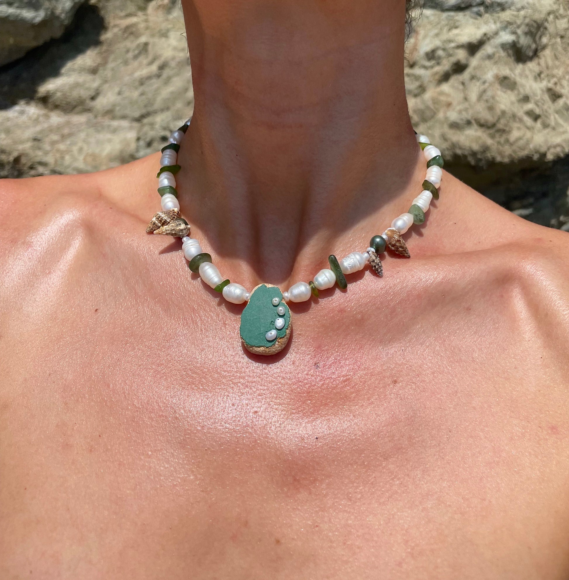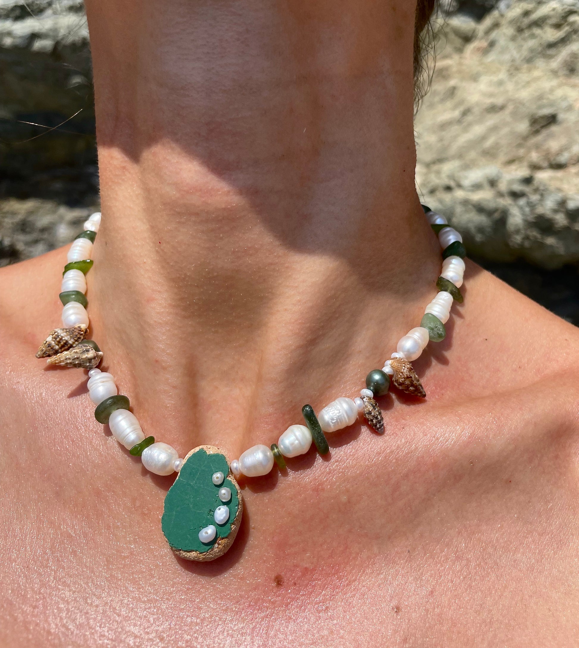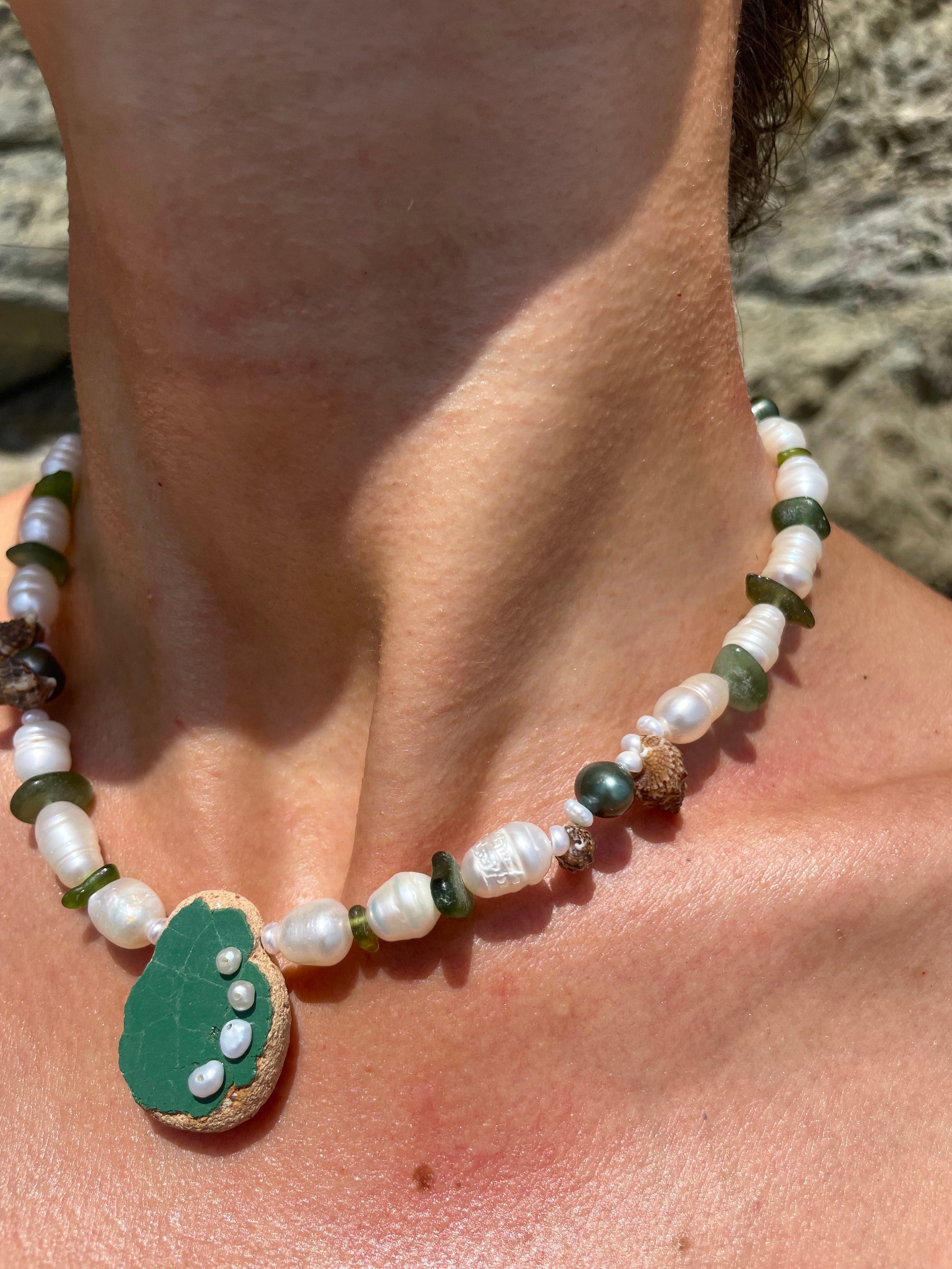 BERND · collar con azulejo porcelánico verde, moldeado por el mar, como pieza central y adornado con delicadas perlas. Rodeado de vidrio marino en tonos verdes, pequeñas caracolas y perlas de agua dulce