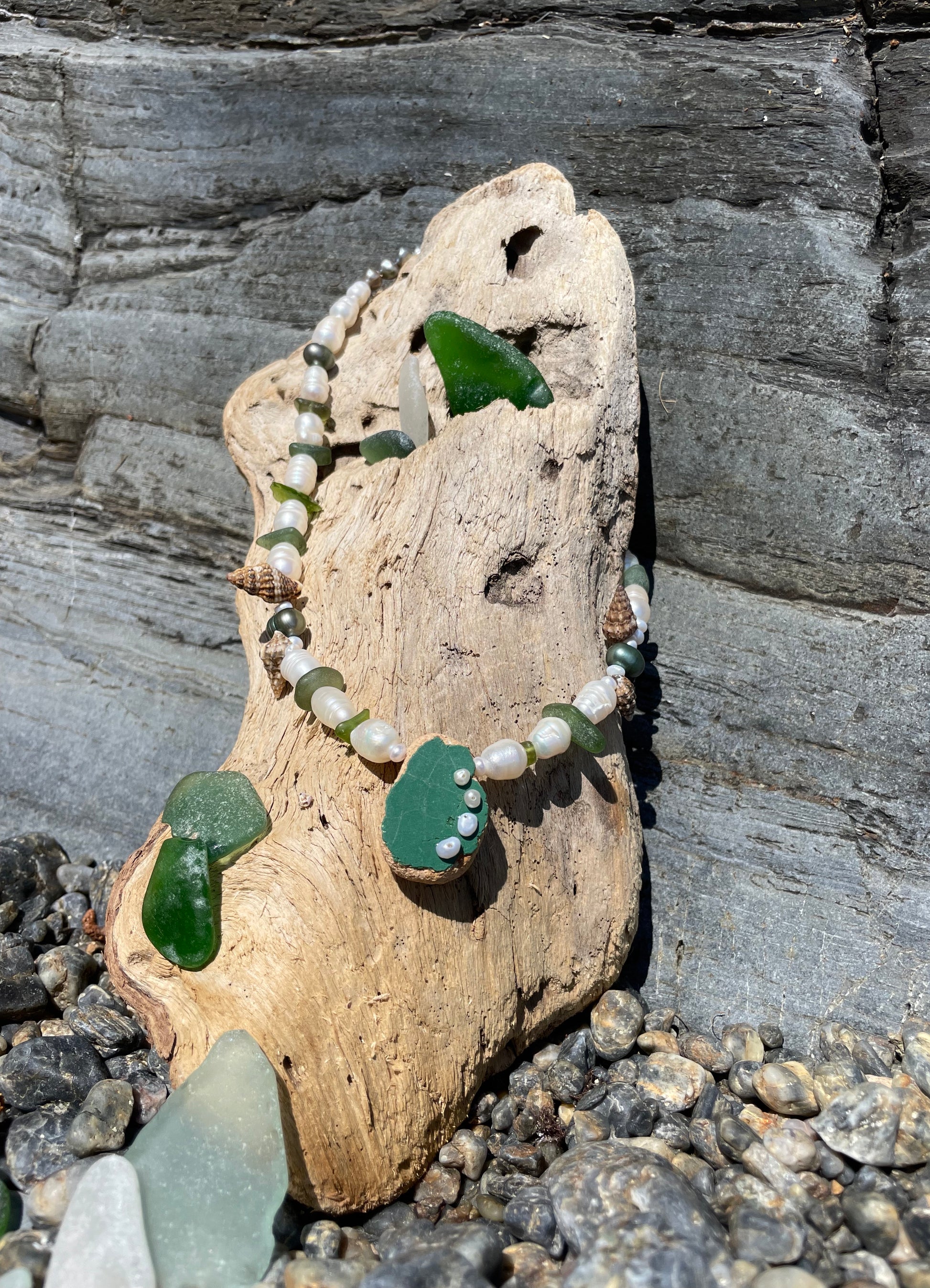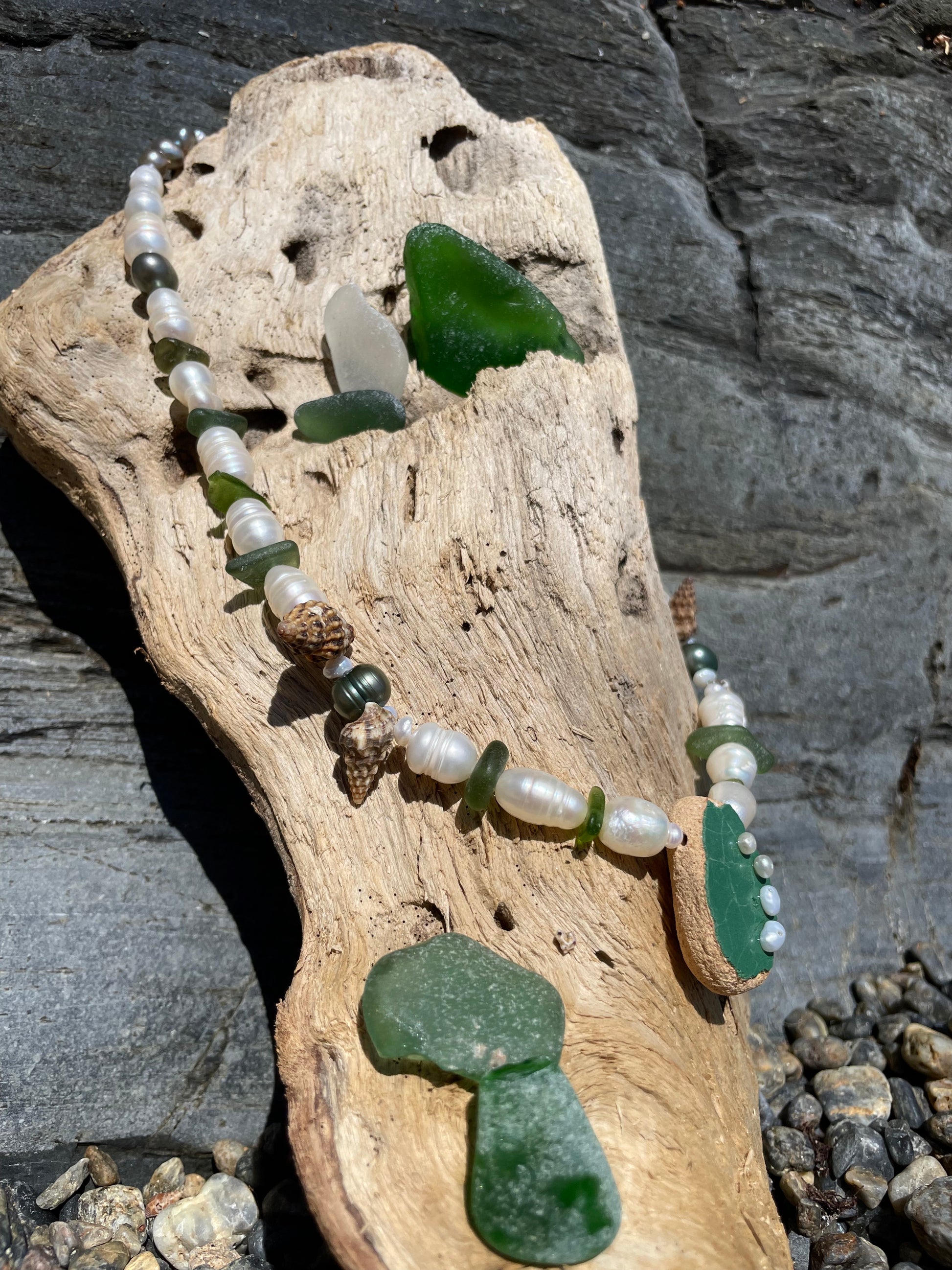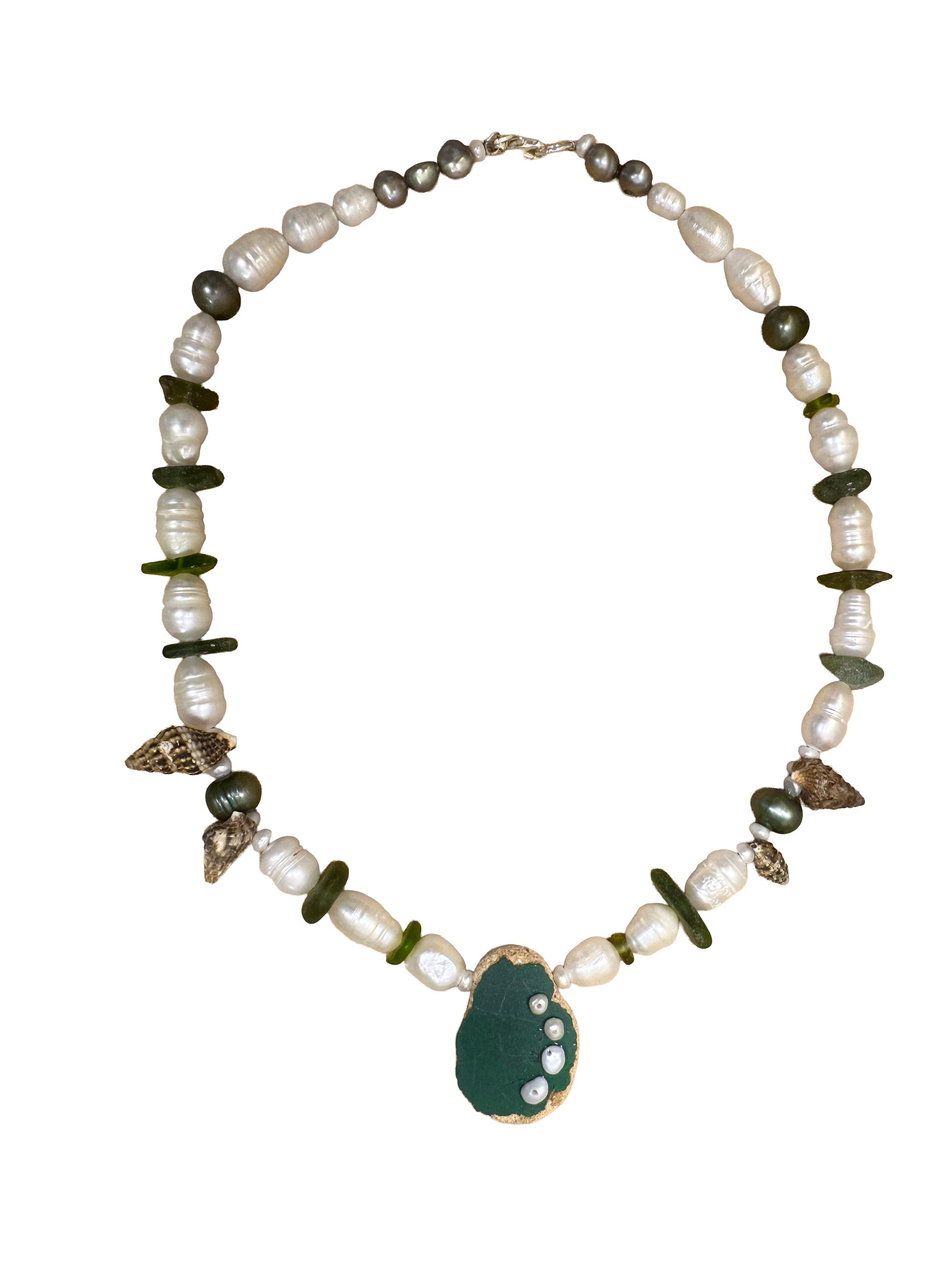 BERND · collar con azulejo porcelánico verde, moldeado por el mar, como pieza central y adornado con delicadas perlas. Rodeado de vidrio marino en tonos verdes, pequeñas caracolas y perlas de agua dulce