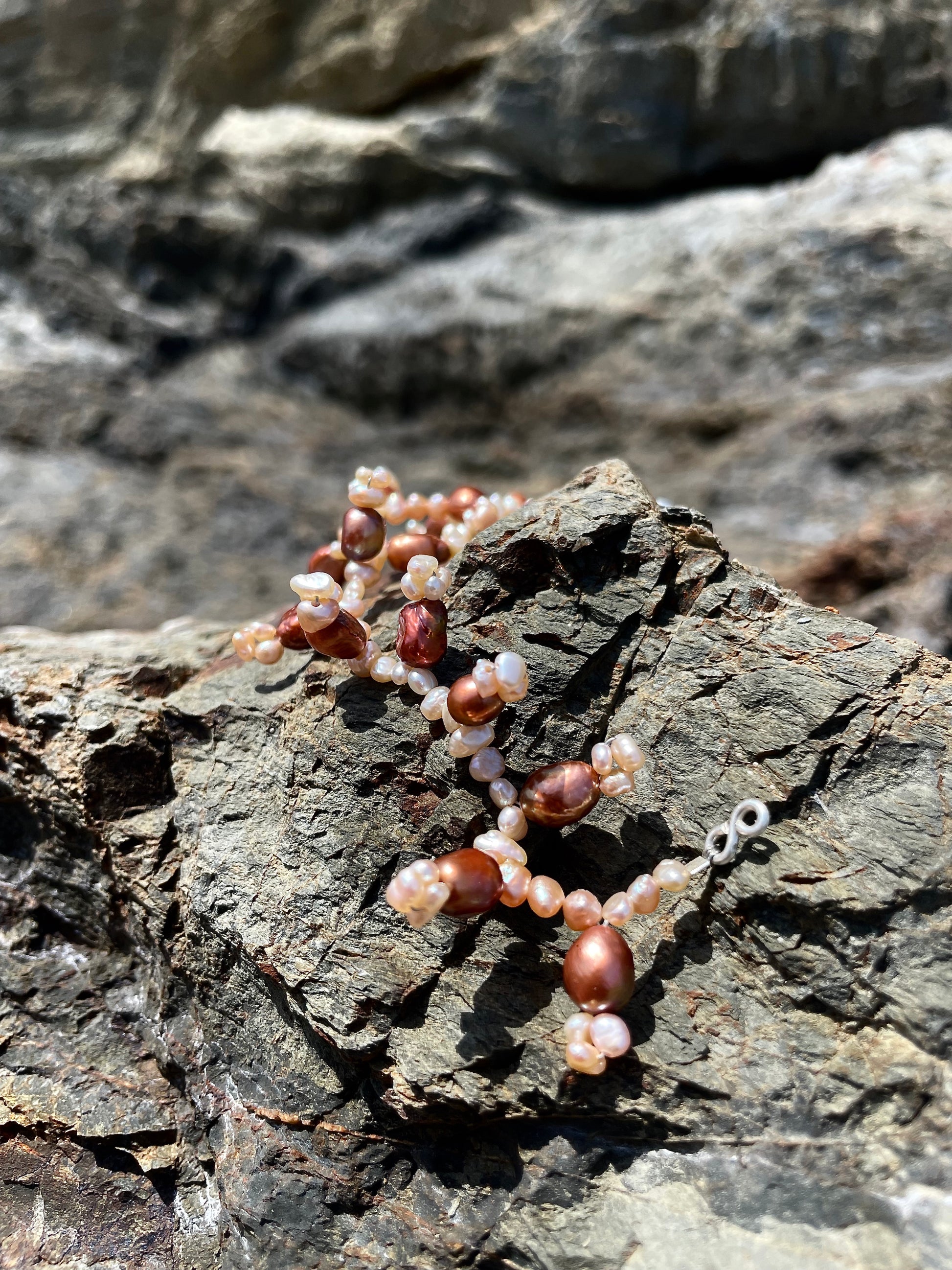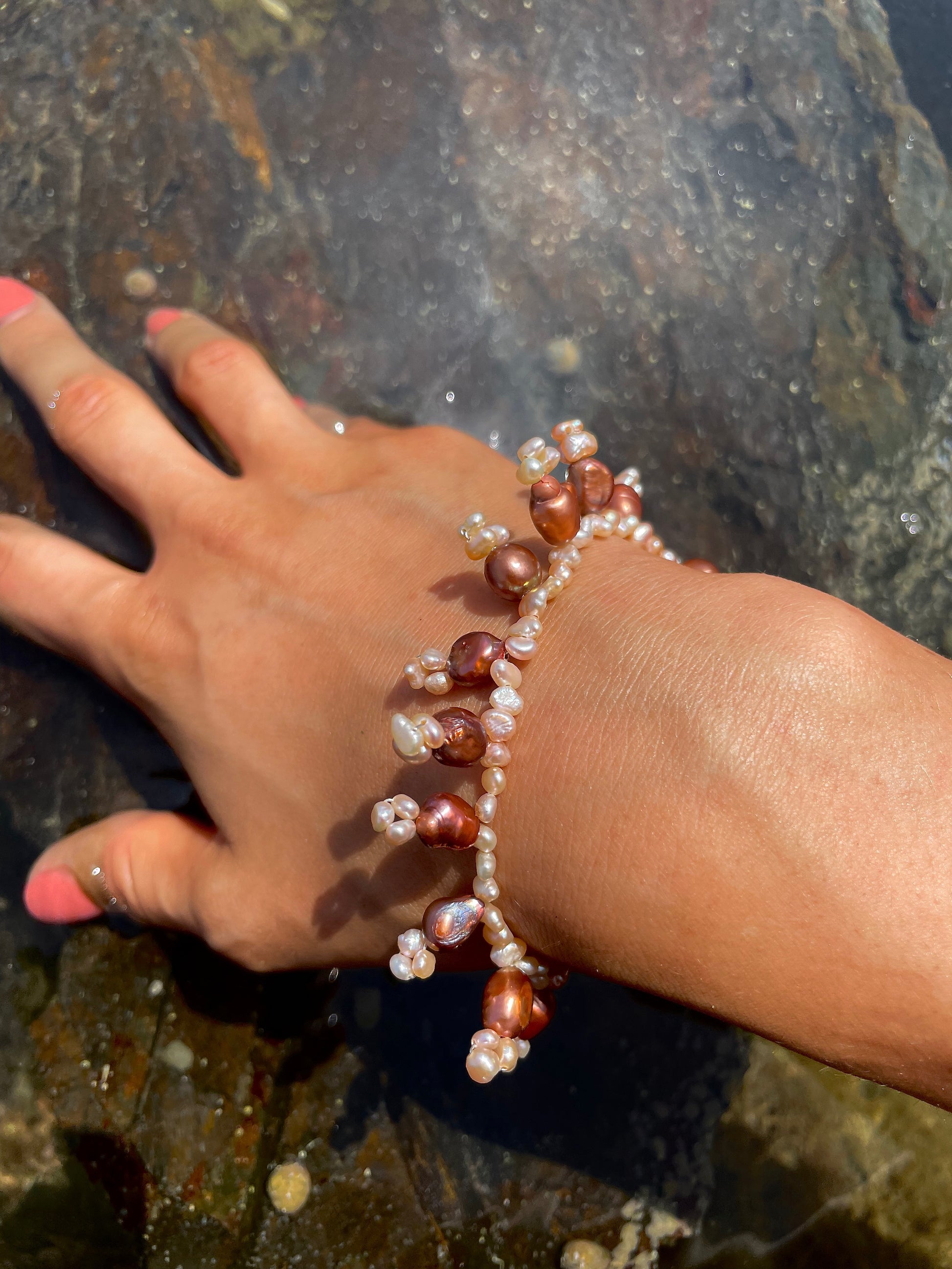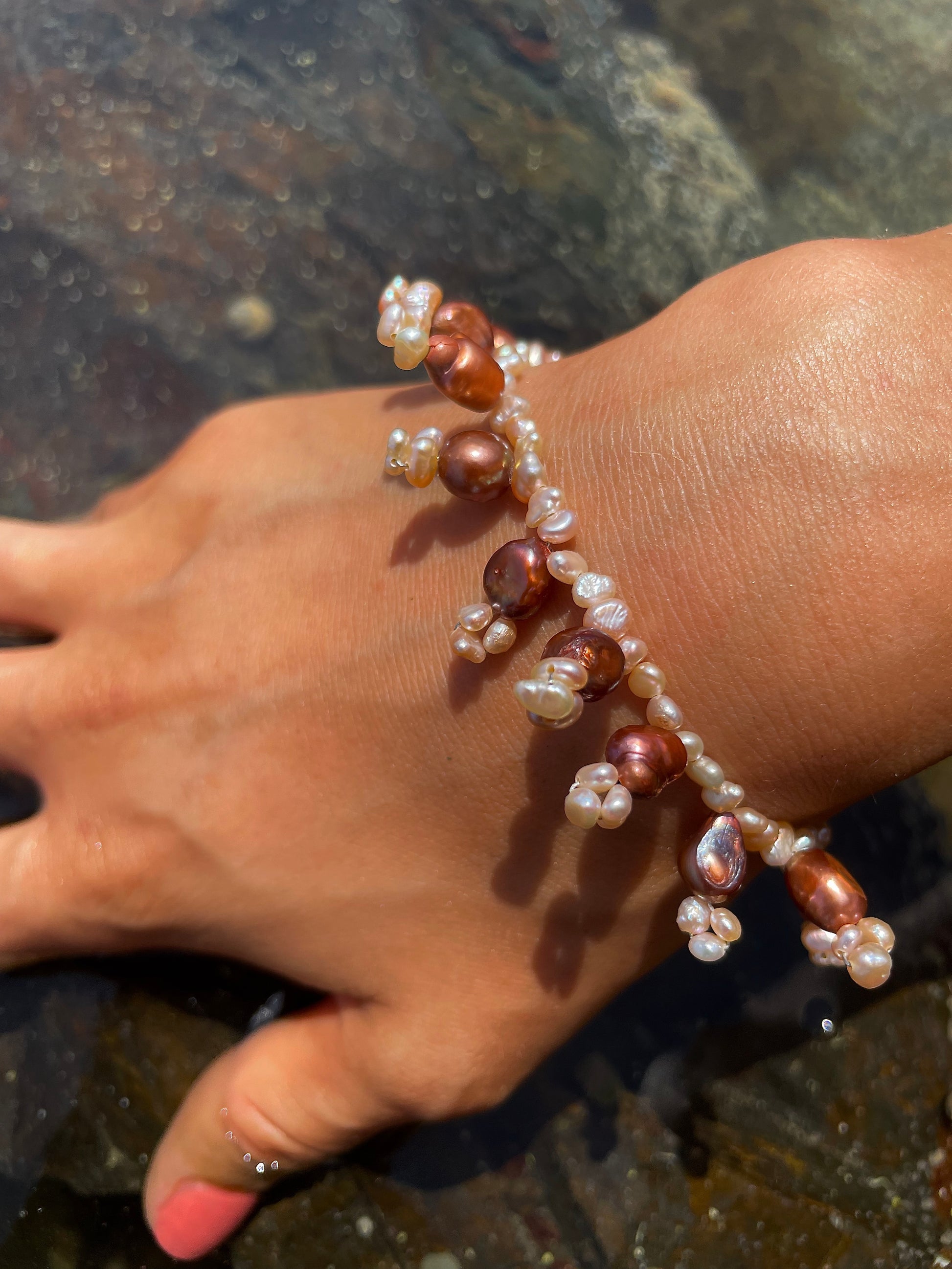 BERTA · pulsera de delicadas perlas de agua dulce en tonos rosados y bronce, trenzadas en pequeñas formas colgantes que apuntan hacia arriba o hacia abajo, dando a la pieza un aire orgánico y salvaje.