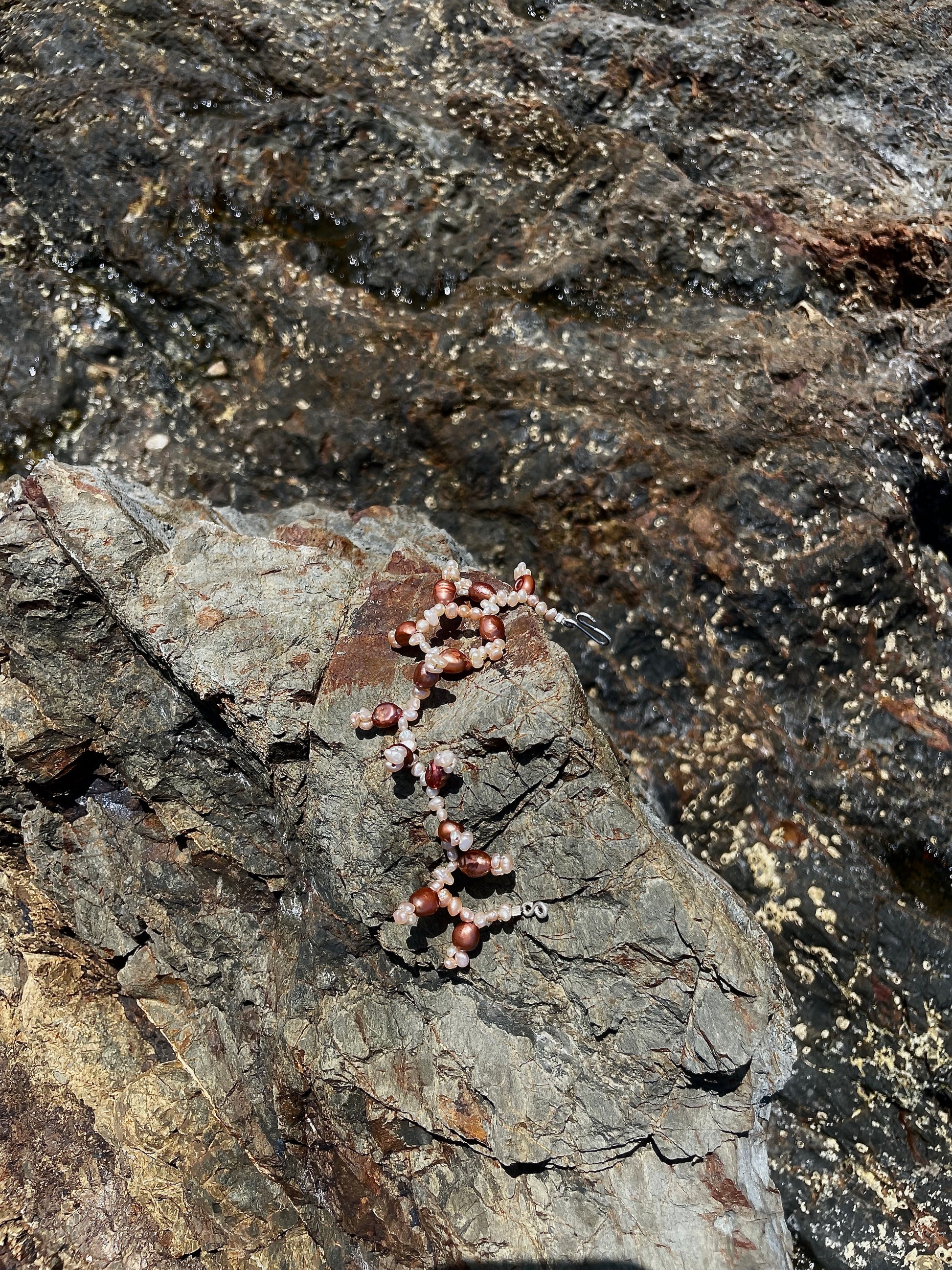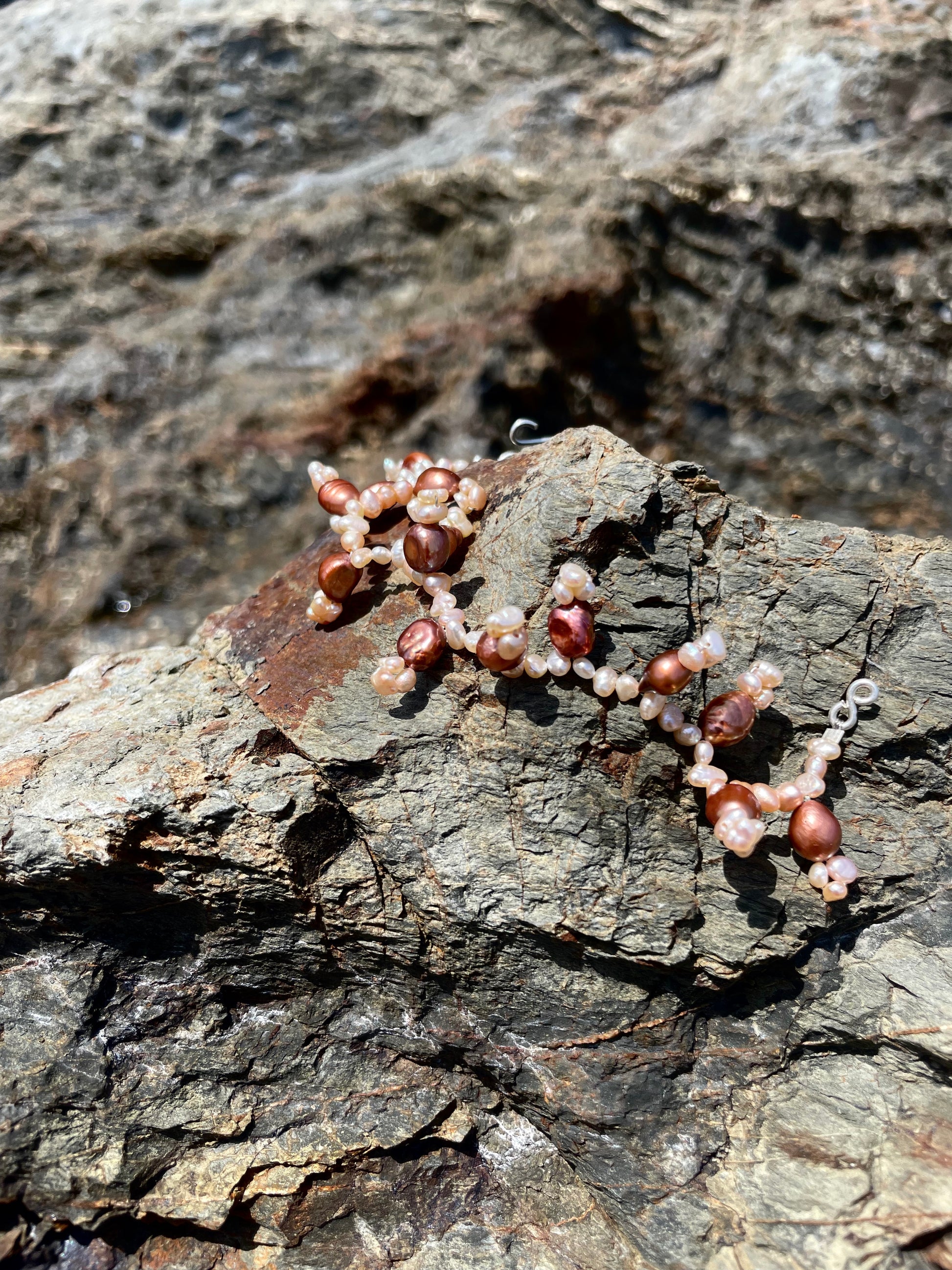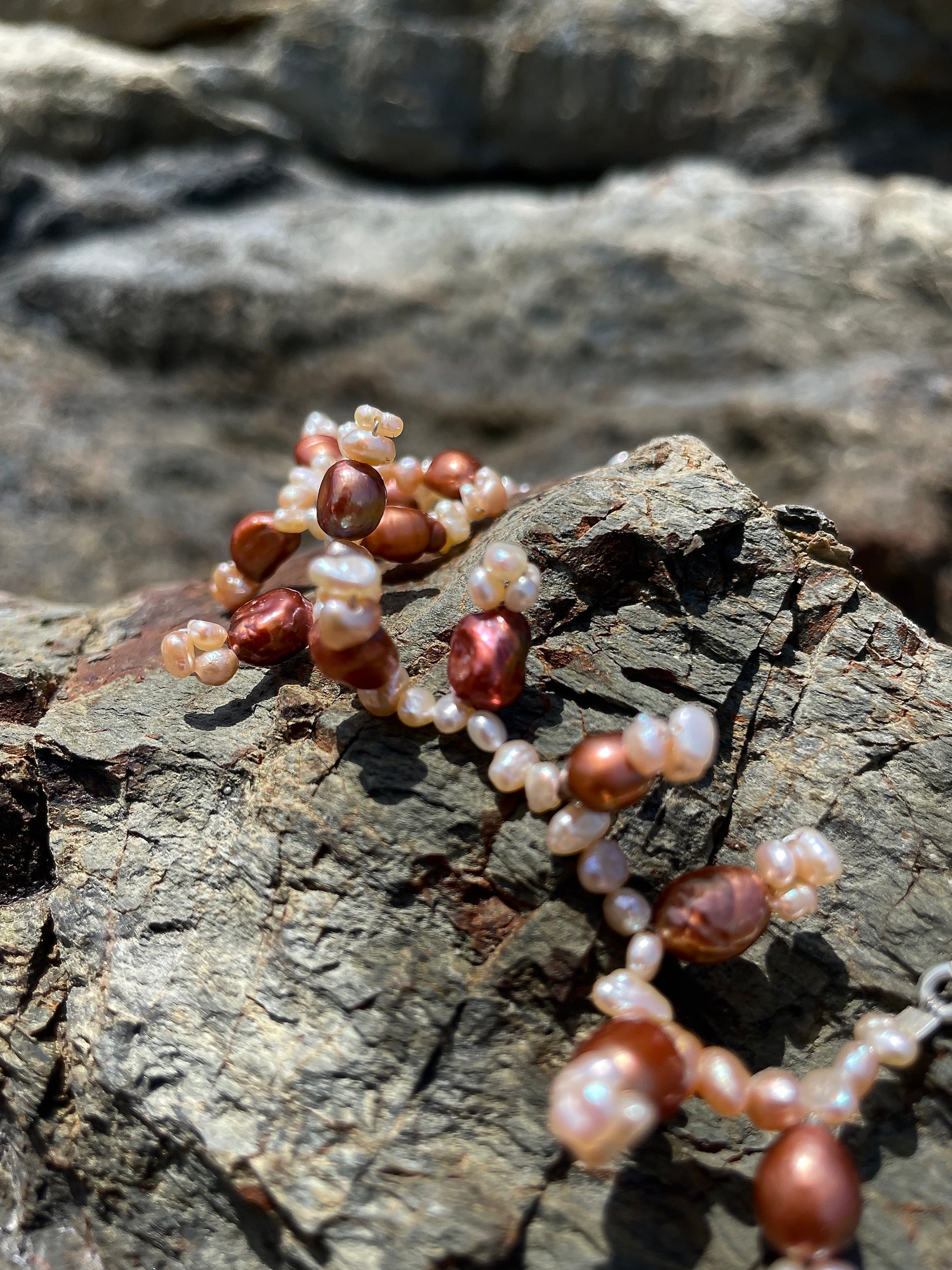 BERTA · pulsera de delicadas perlas de agua dulce en tonos rosados y bronce, trenzadas en pequeñas formas colgantes que apuntan hacia arriba o hacia abajo, dando a la pieza un aire orgánico y salvaje.