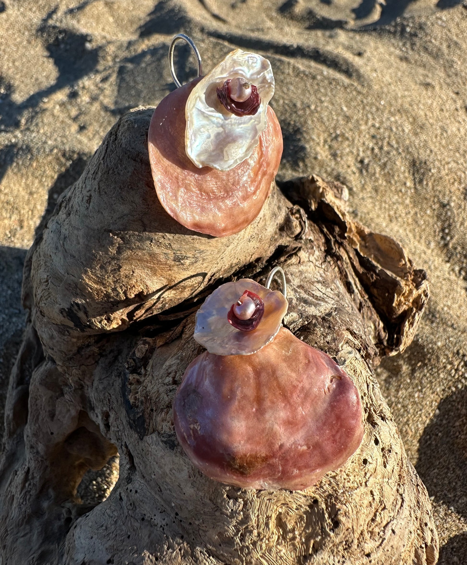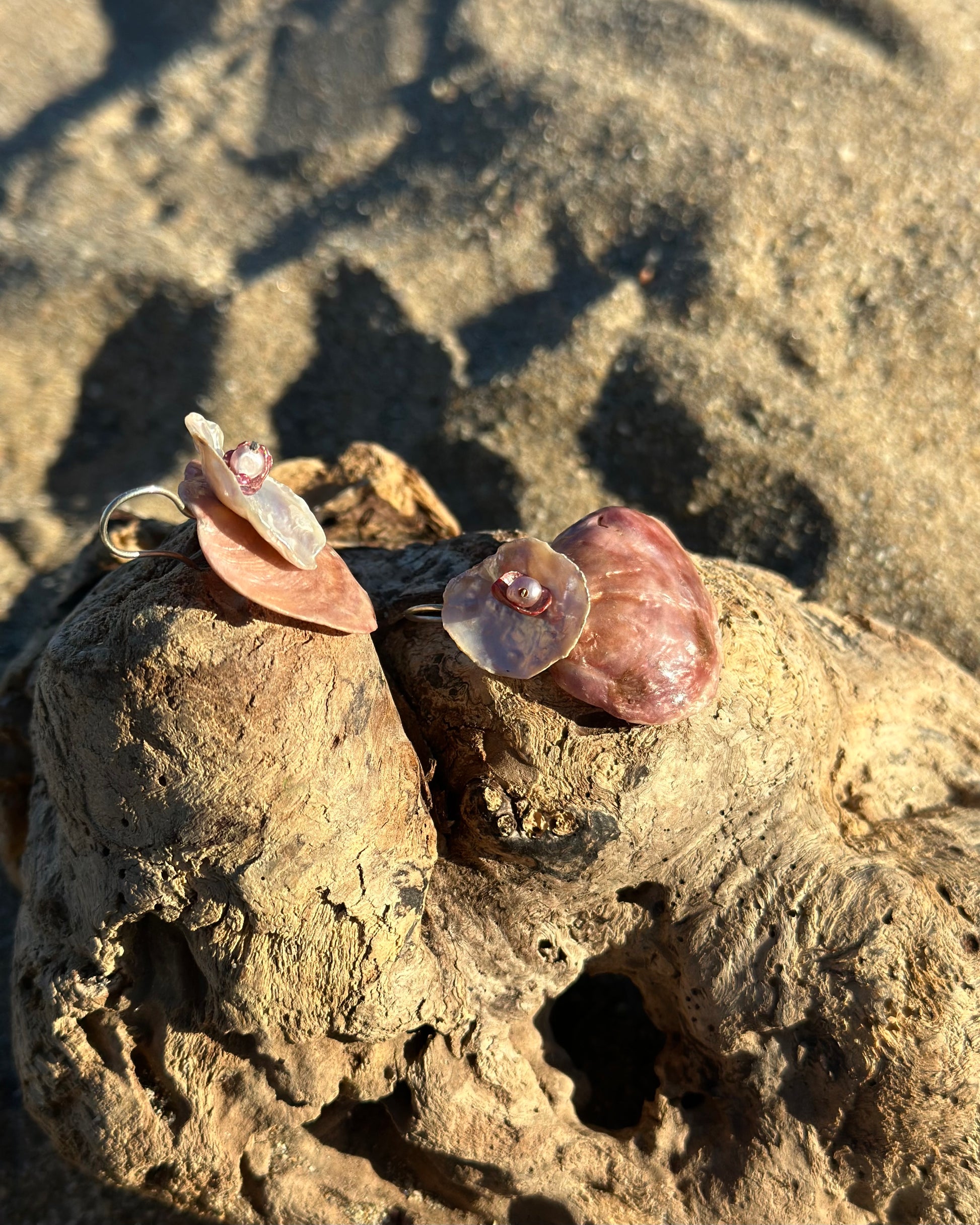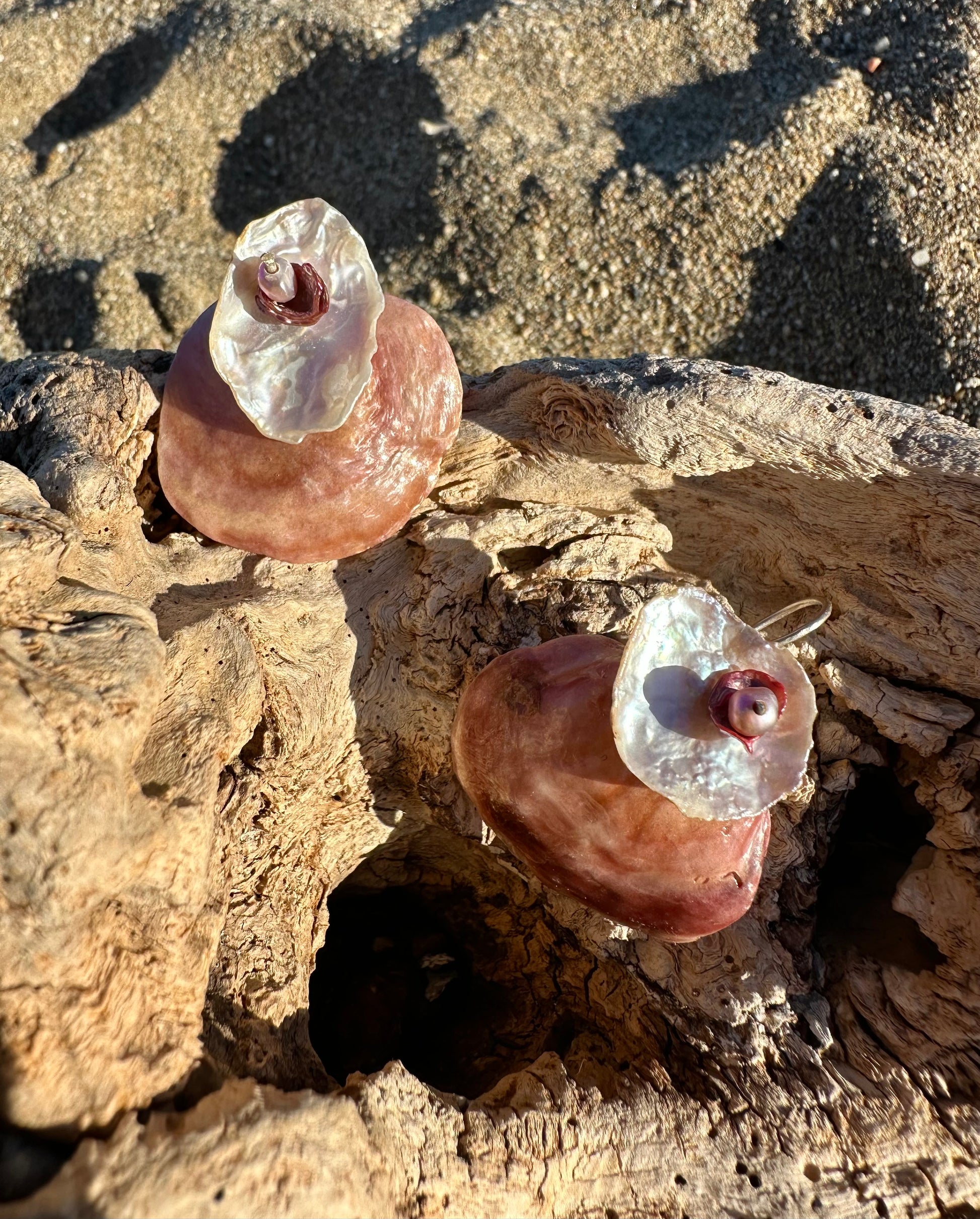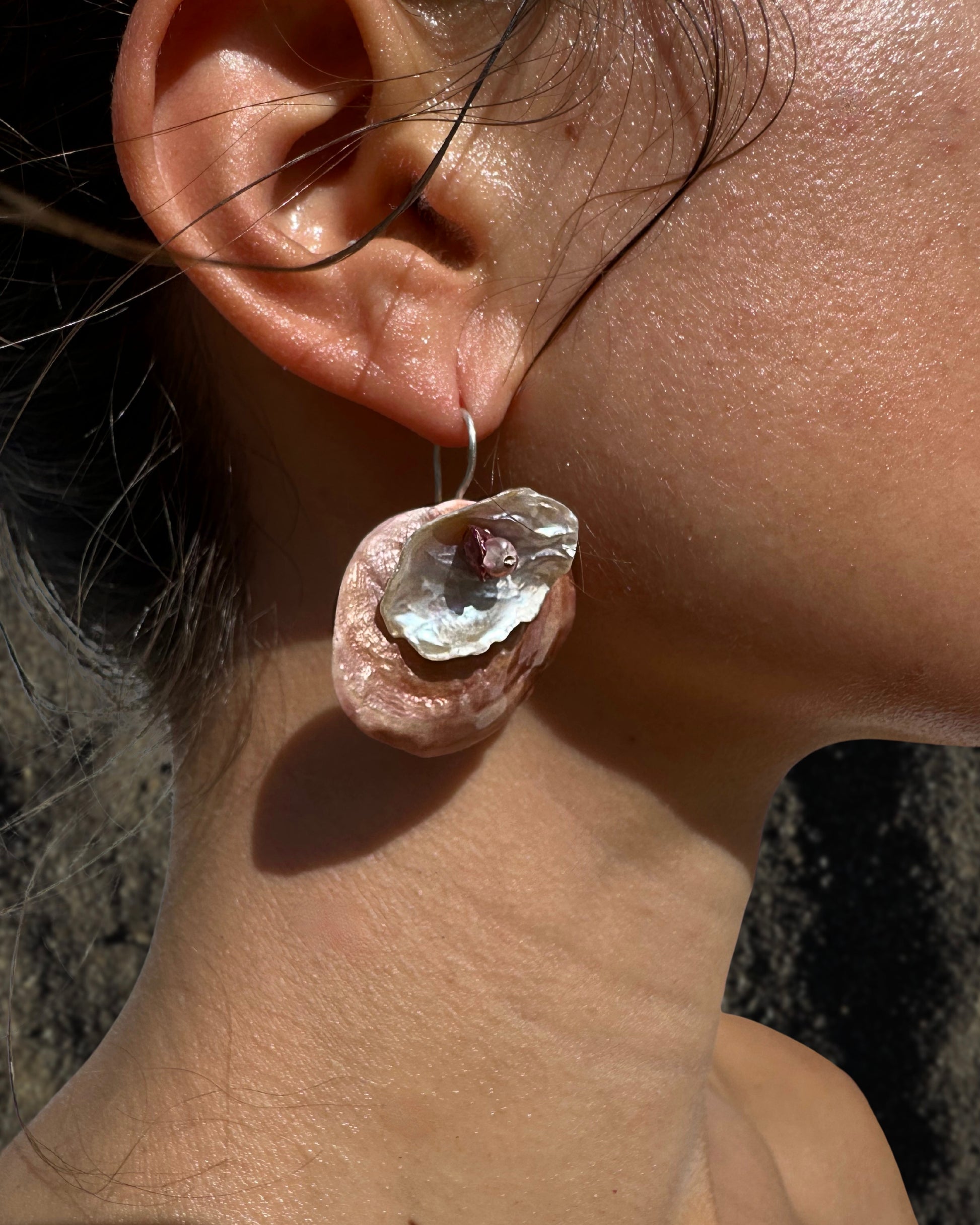 BLOOM · pendientes elaborados con dos grandes conchas que reflejan suaves tonos rosados y nácar. Sobre ellas descansan perlas Keshi de agua salada con brillo perlado, adornadas con una pequeña Keshi rosada y una delicada perla de agua dulce blanca. Todo está montado en ganchos de plata 925, creando una pieza artesanal que combina ligereza y elegancia natural.