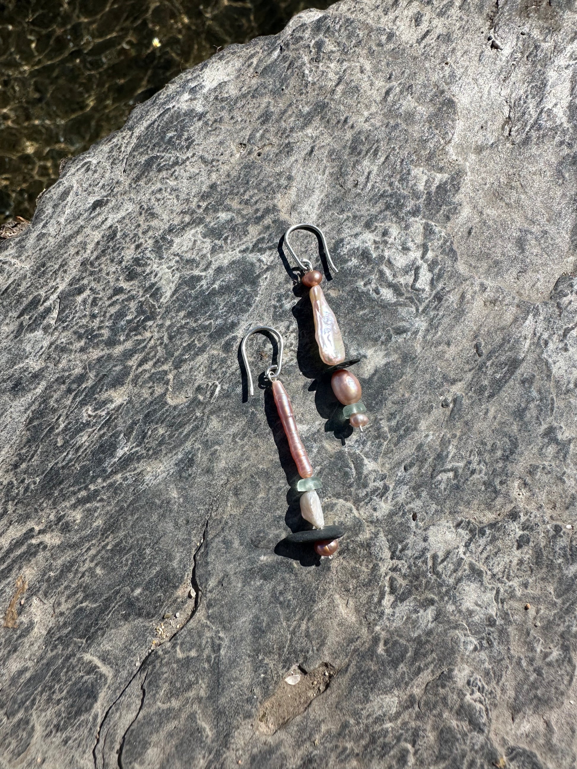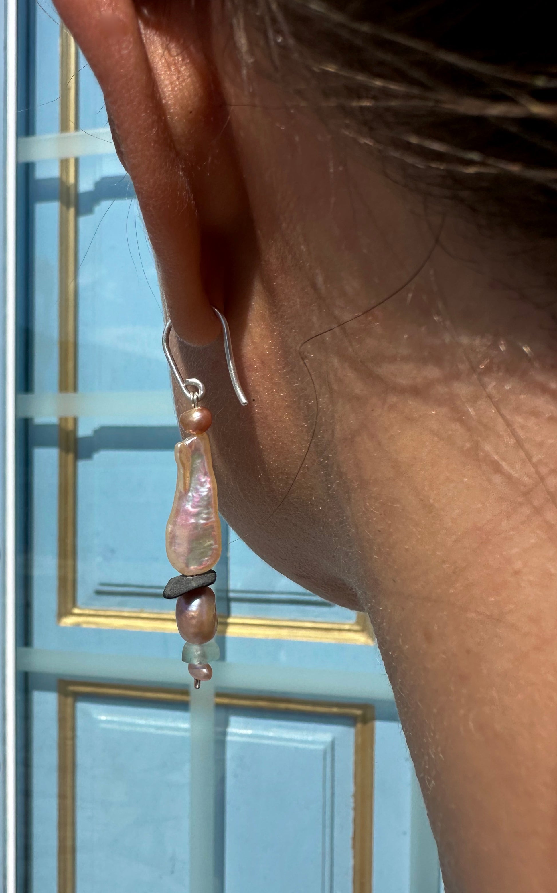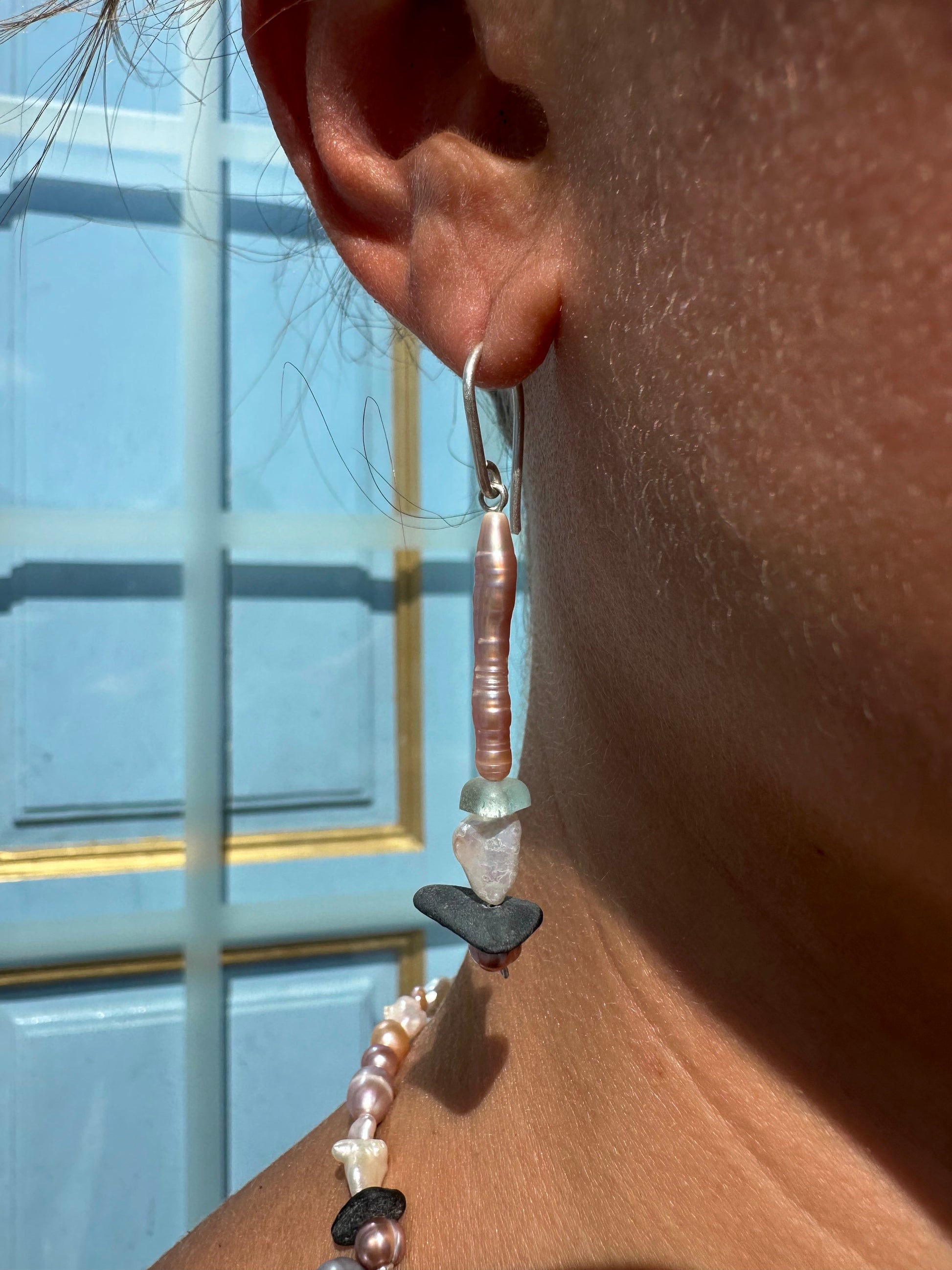 CHARLOTTE · largos pendientes asimétricos compuestos por una perla barroca alargada en tono rosé y otra en blanco, ambas acompañadas de fragmentos de vidrio marino y pequeñas piedras de pizarra, moldeadas por el mar. Detalles de delicadas perlas de agua dulce completan el diseño, creando una pieza única que combina elegancia natural y un espíritu libre.