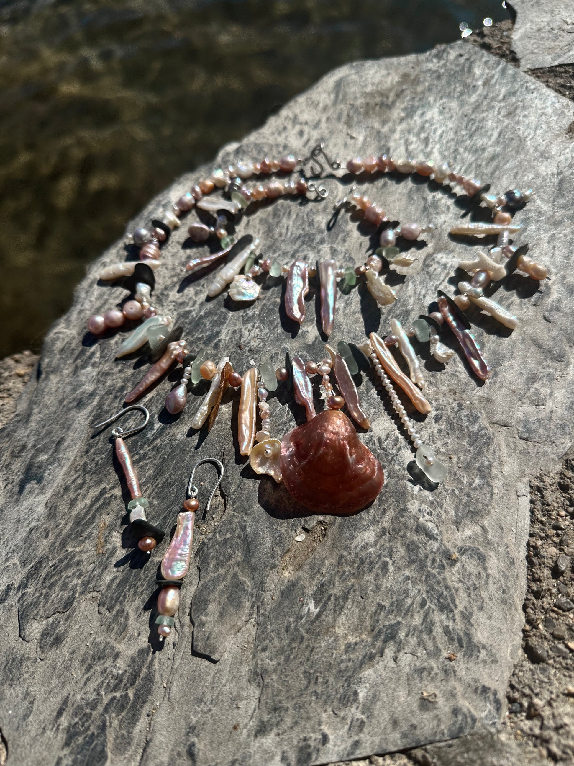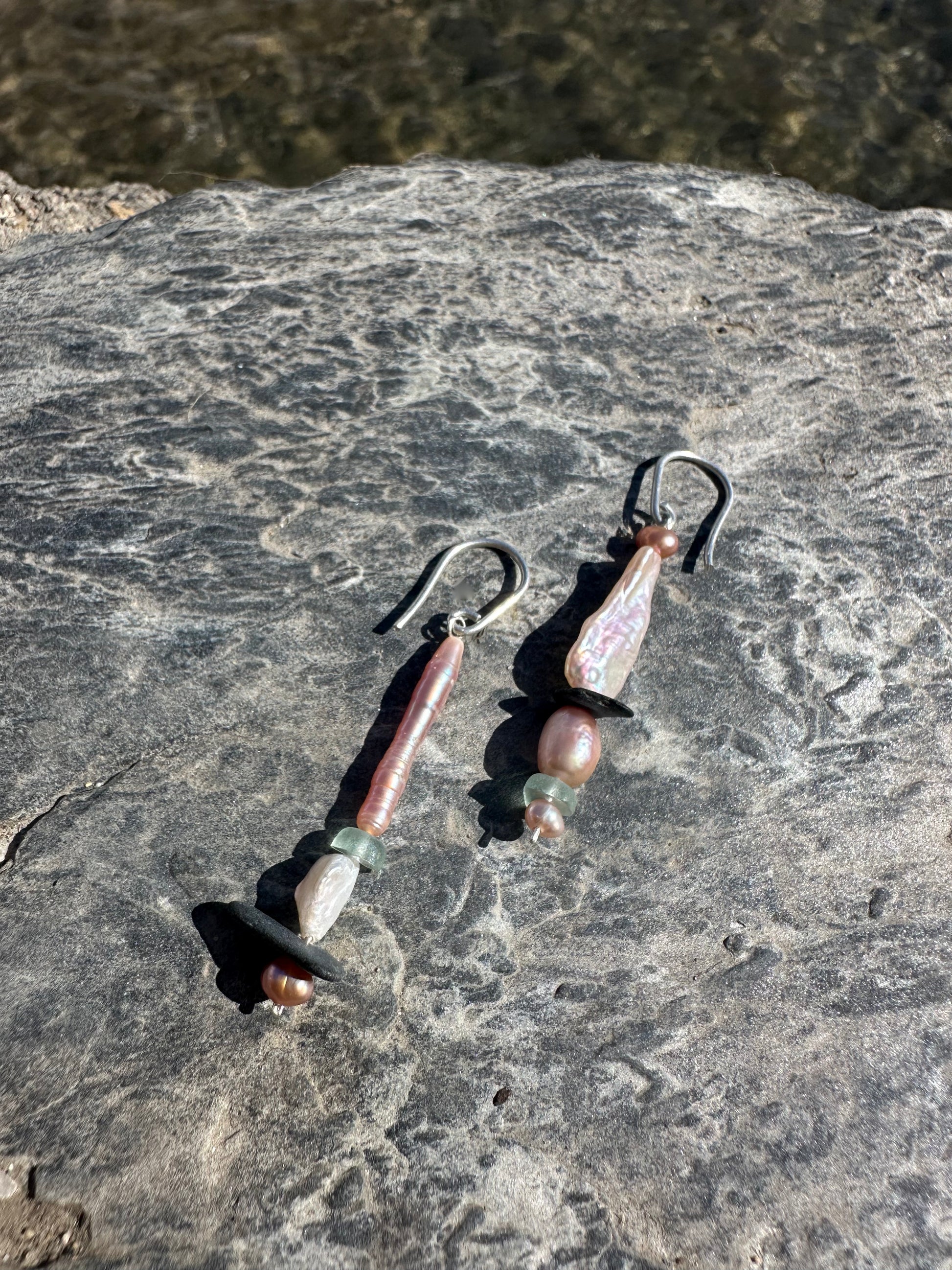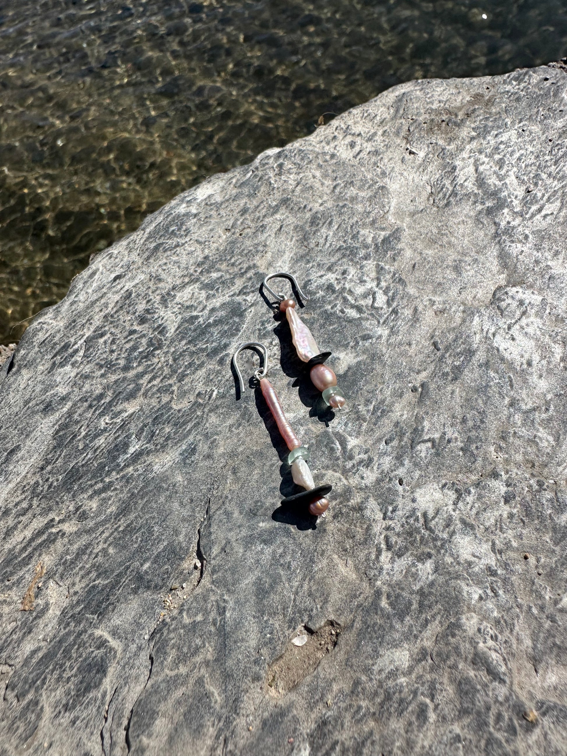 CHARLOTTE · largos pendientes asimétricos compuestos por una perla barroca alargada en tono rosé y otra en blanco, ambas acompañadas de fragmentos de vidrio marino y pequeñas piedras de pizarra, moldeadas por el mar. Detalles de delicadas perlas de agua dulce completan el diseño, creando una pieza única que combina elegancia natural y un espíritu libre.