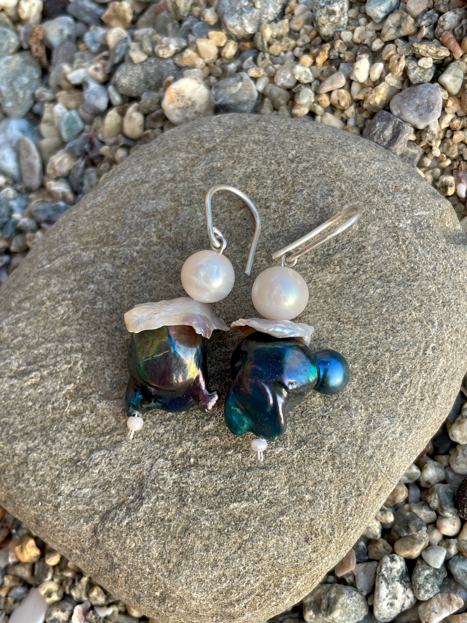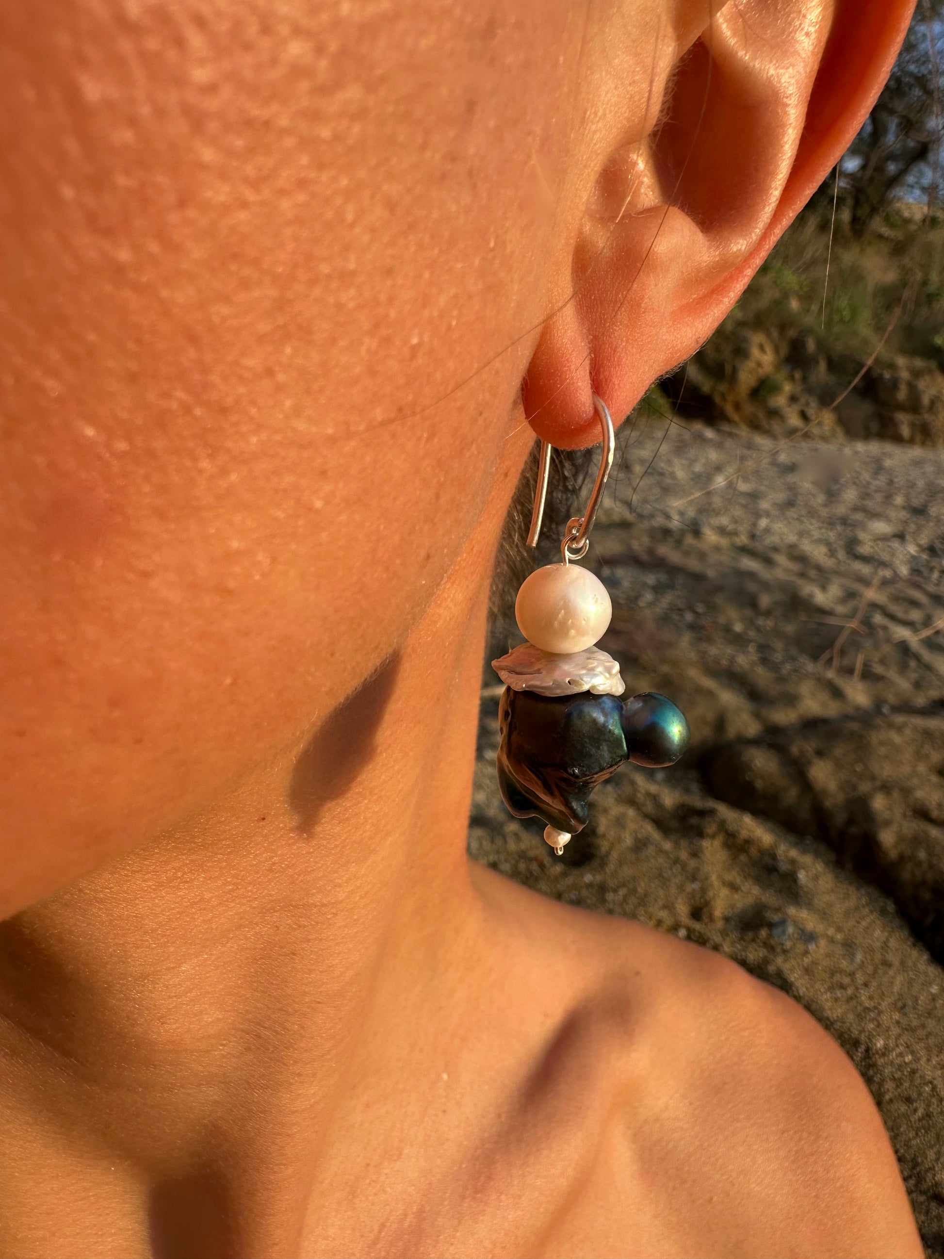 CLOWN · pendientes únicos compuestos por dos perlas barrocas oscuras de formas orgánicas e irrepetibles, que revelan un sutil brillo en tonos azul y verde según la luz. Están acompañadas por delicadas perlas KESHI de agua salada y una perla redonda de agua dulce de calidad A. Todas las piezas cuelgan armoniosamente de ganchos de plata 925, creando un diseño elegante, natural y lleno de carácter.