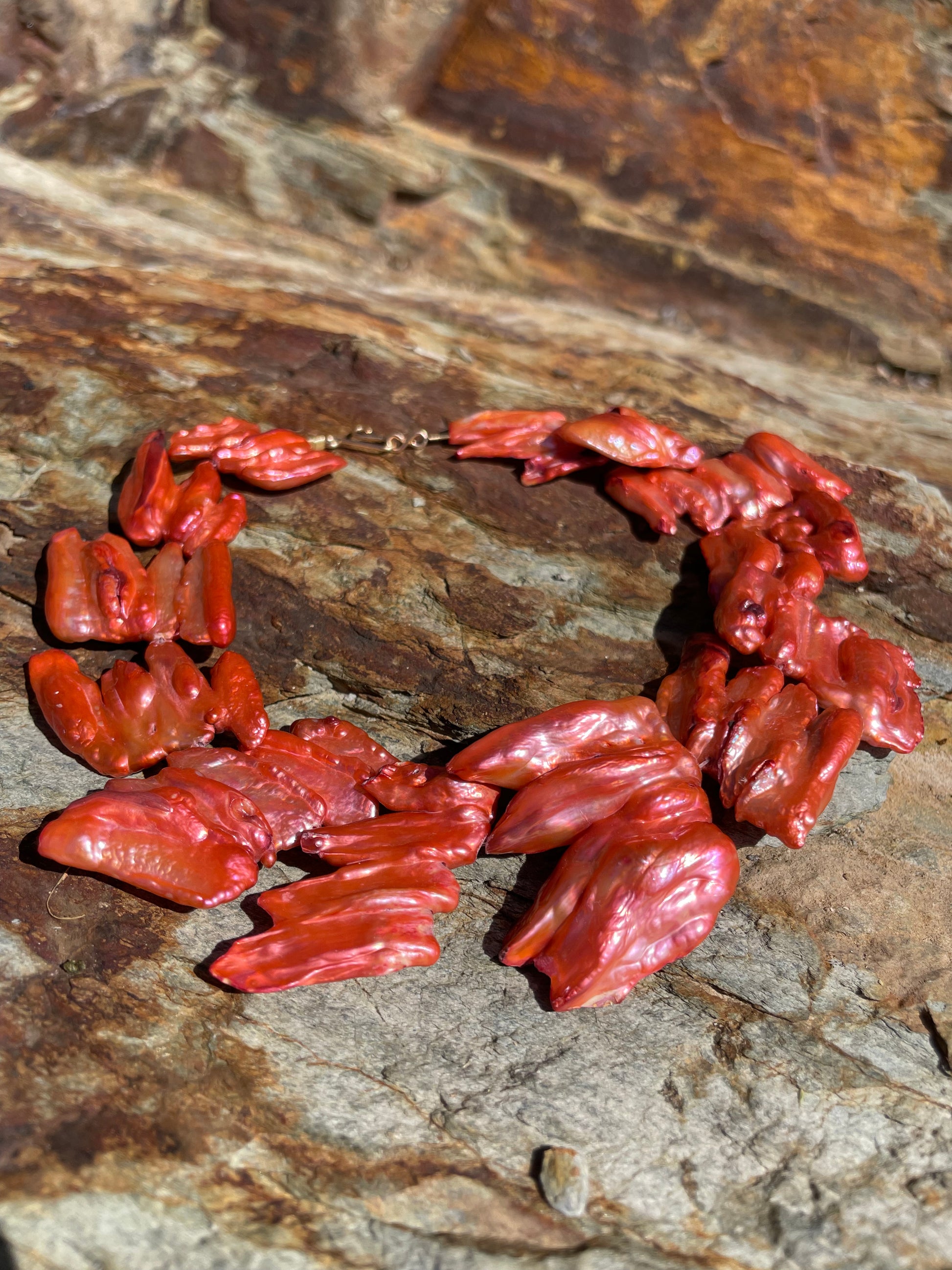 CORAL · este choker destaca por una composición de enormes perlas barrocas en intensos tonos coral-rojizos, cada una con una forma orgánica, salvaje y única. Las superficies irregulares reflejan la luz con matices que van desde el rojo profundo hasta destellos rosados y cobrizos, creando un efecto vibrante y lleno de carácter.
