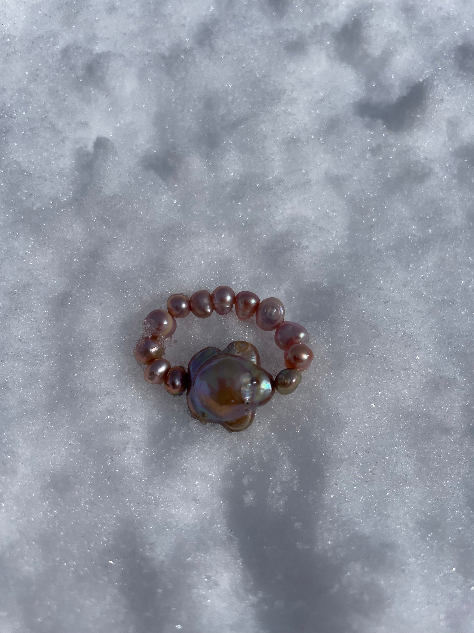 DALIA · anillo elástico con una perla Keshi en el centro, cuya forma recuerda a una flor. Según cómo la luz la acaricia, la perla irradia matices dorados, lilas y azulados, creando un brillo profundo y cambiante.