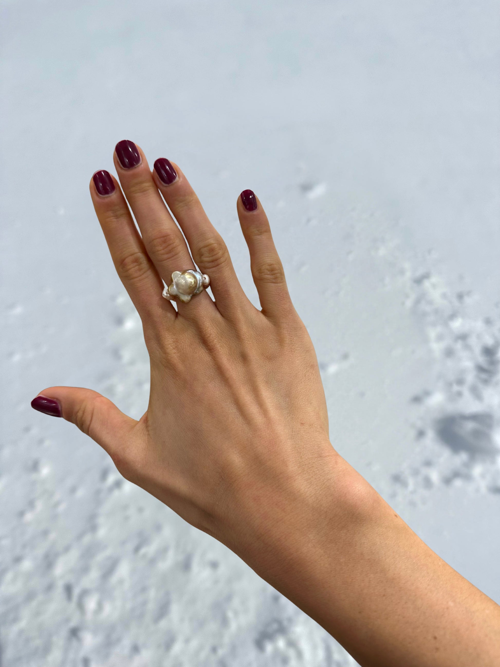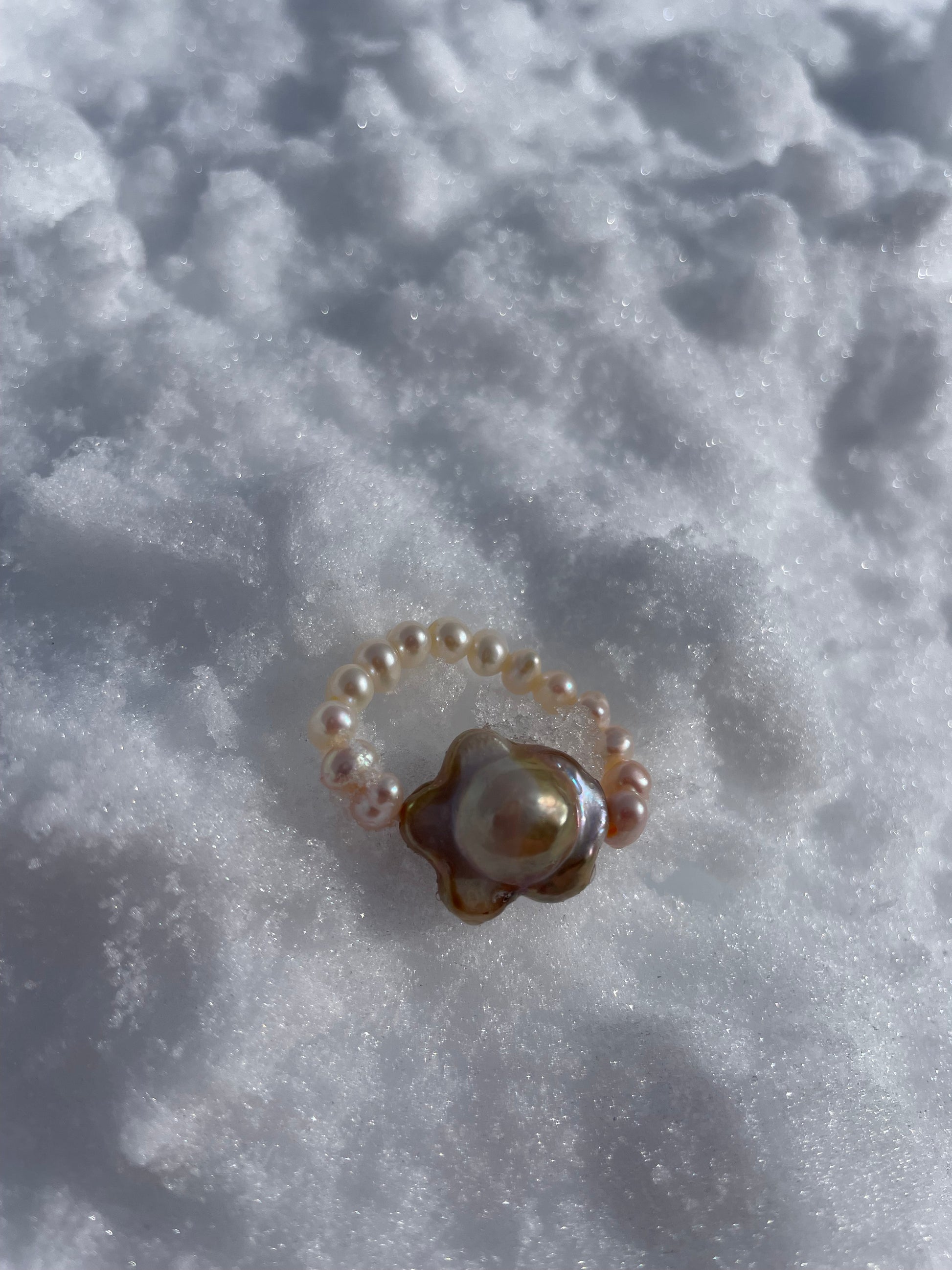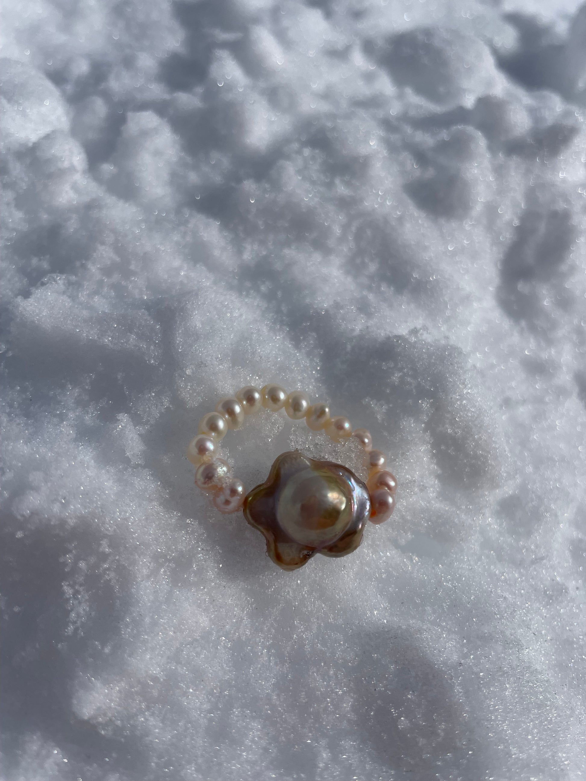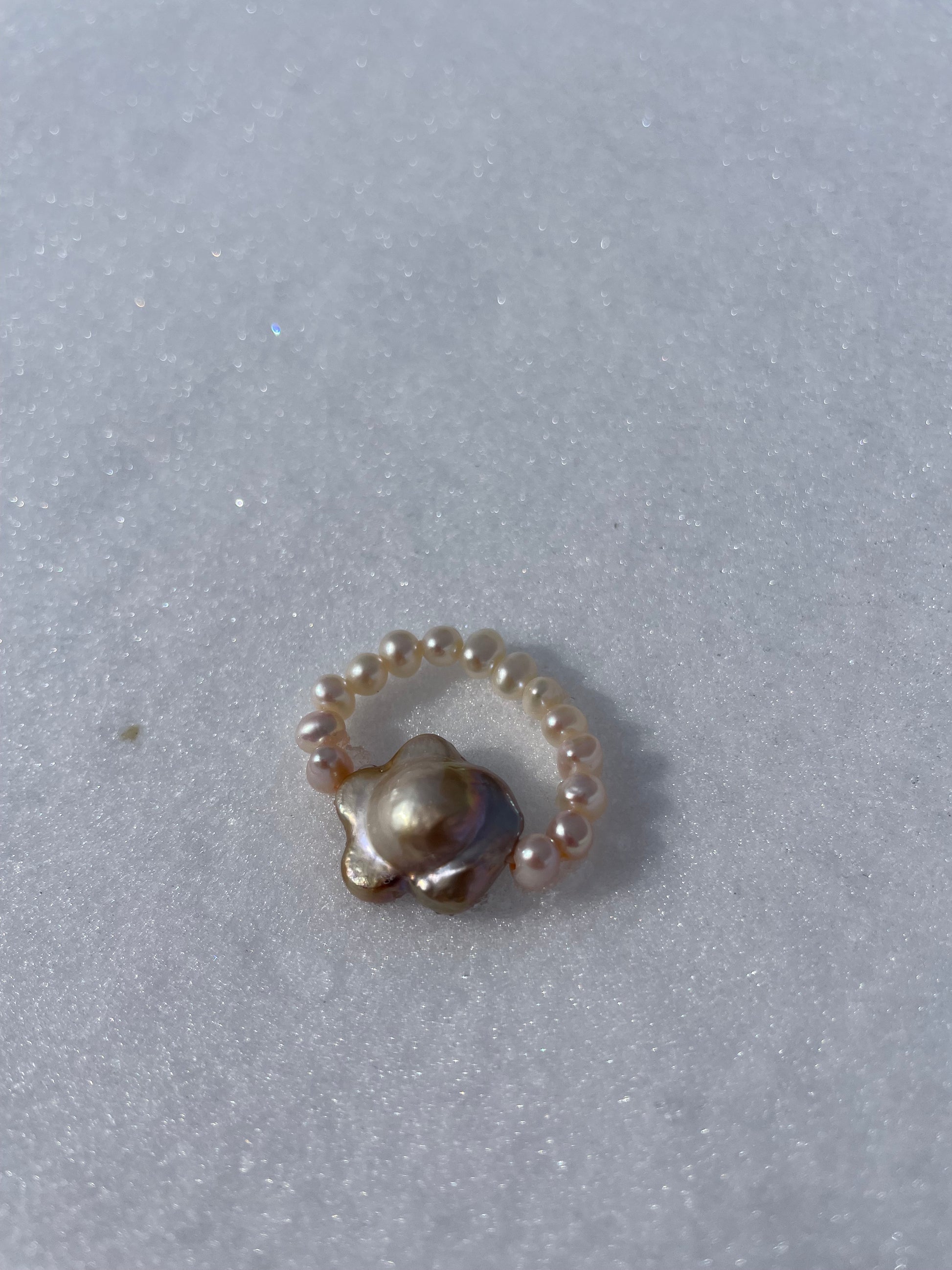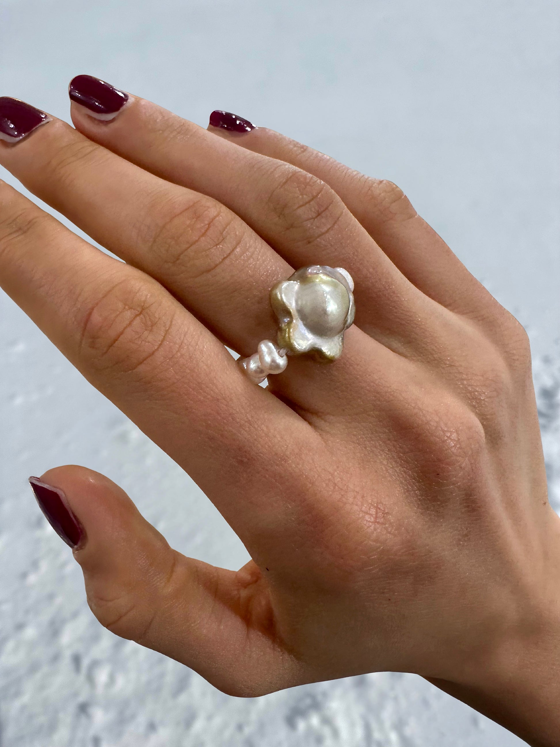 DALIE · anillo elástico con una perla Keshi en el centro, cuya forma evoca la de una flor. Según la incidencia de la luz, la perla irradia delicados matices dorados y rosados, creando un brillo suave y envolvente.