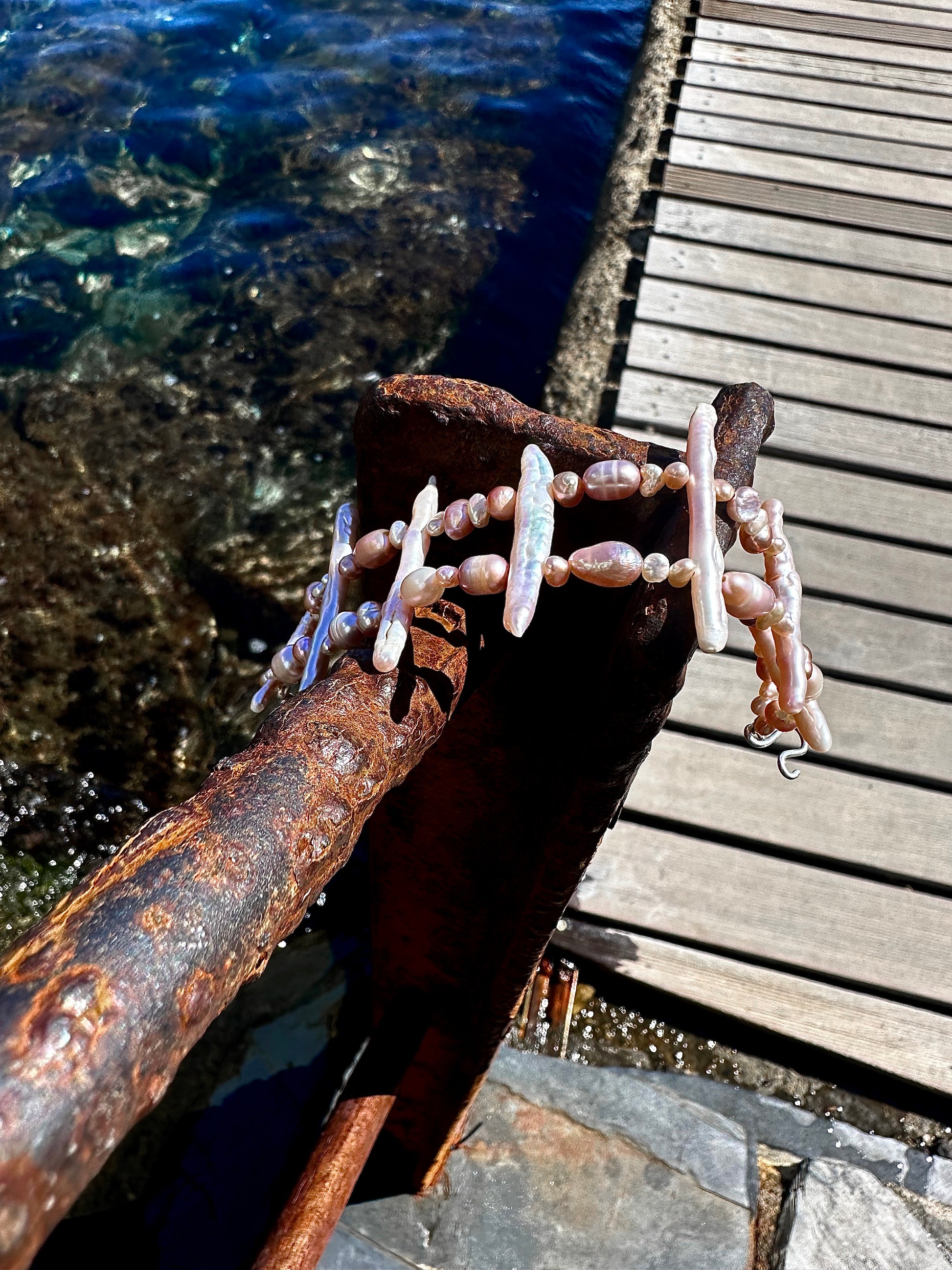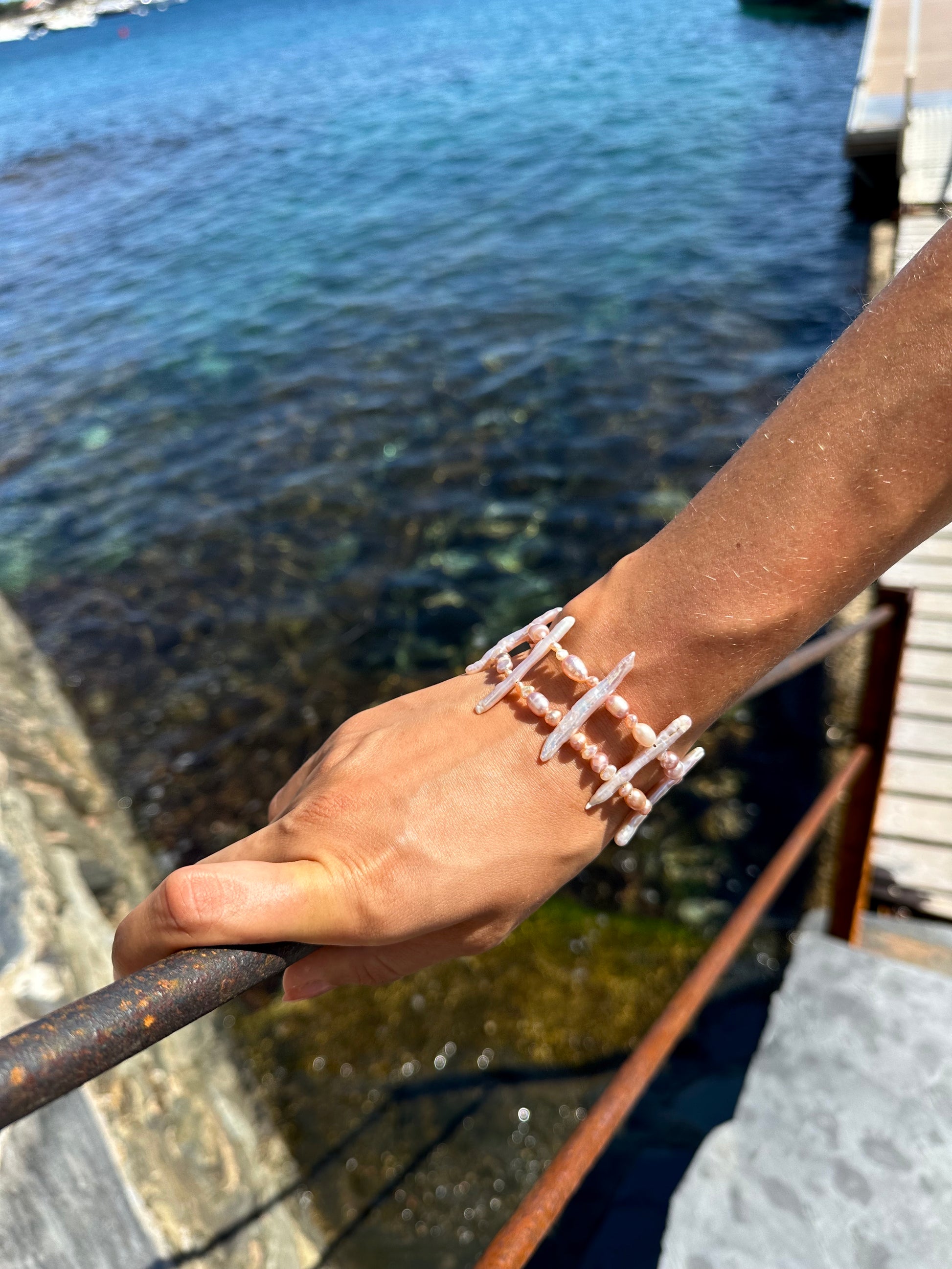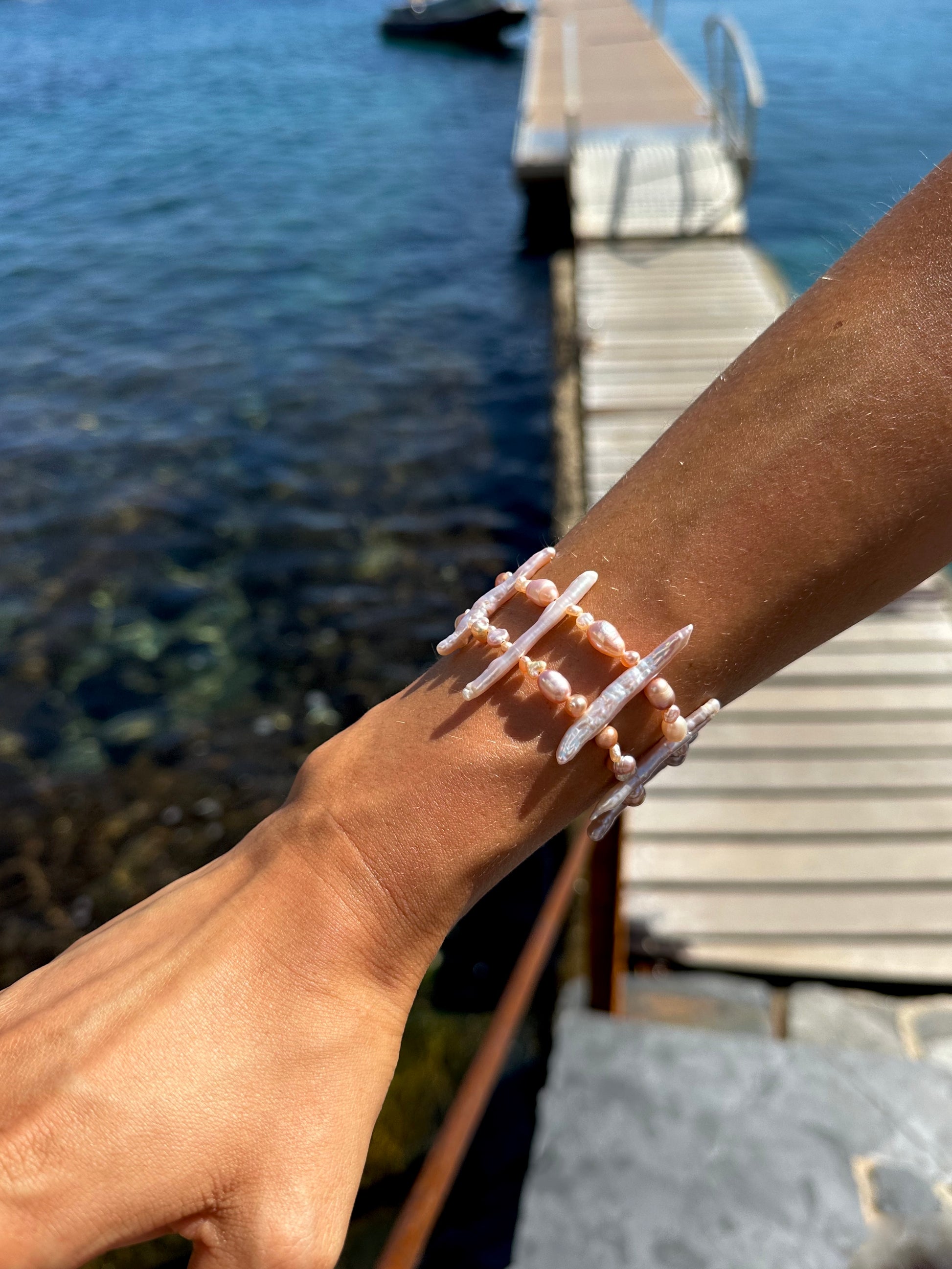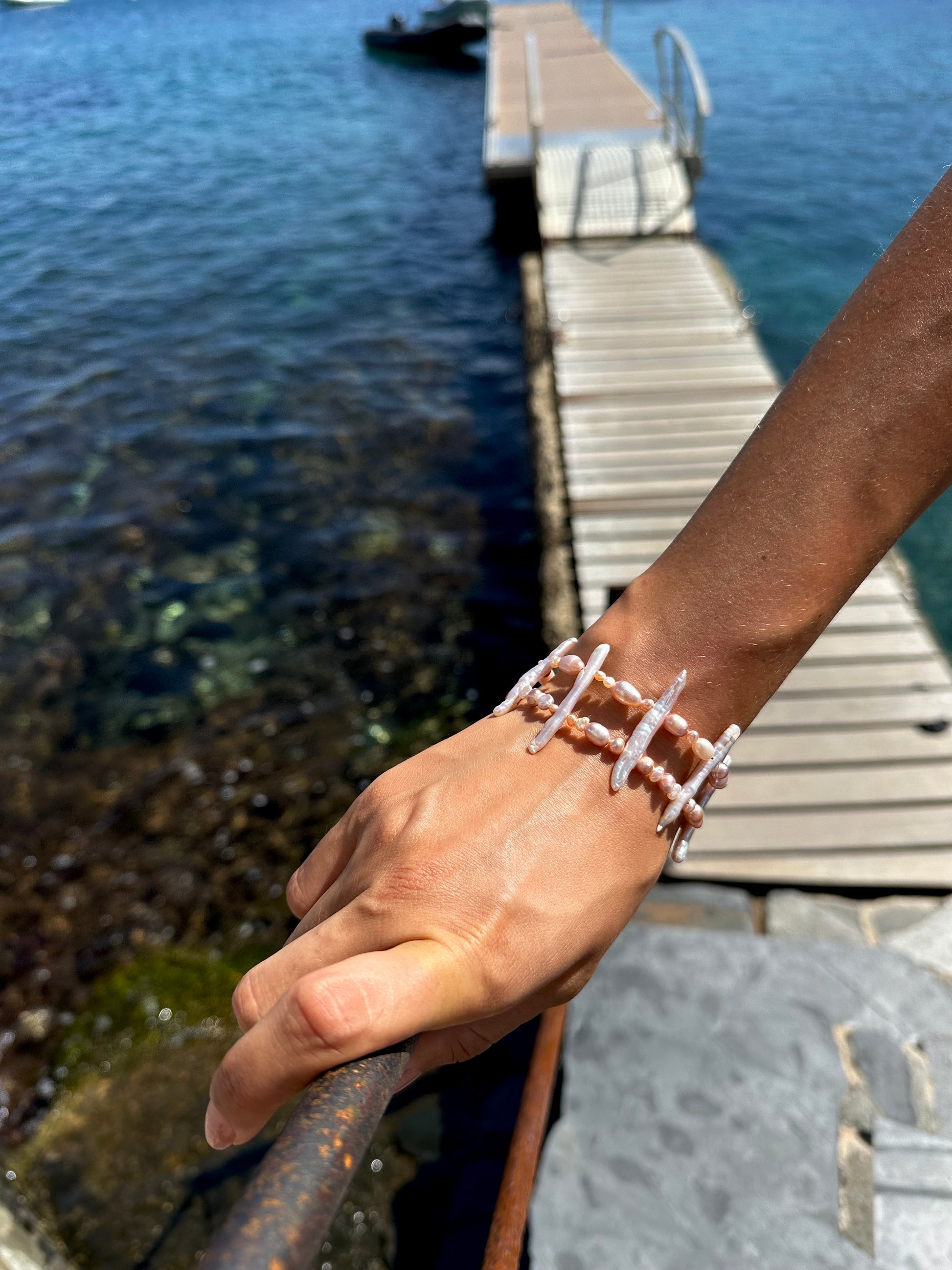 DARIA · pulsera doble cuidadosamente elaborada, separada por alargadas perlas barrocas de agua dulce. Estas piezas centrales están delicadamente rodeadas por perlas de agua dulce en suaves tonos rosados y de diferentes tamaños, que aportan un aire femenino y armonioso al diseño.