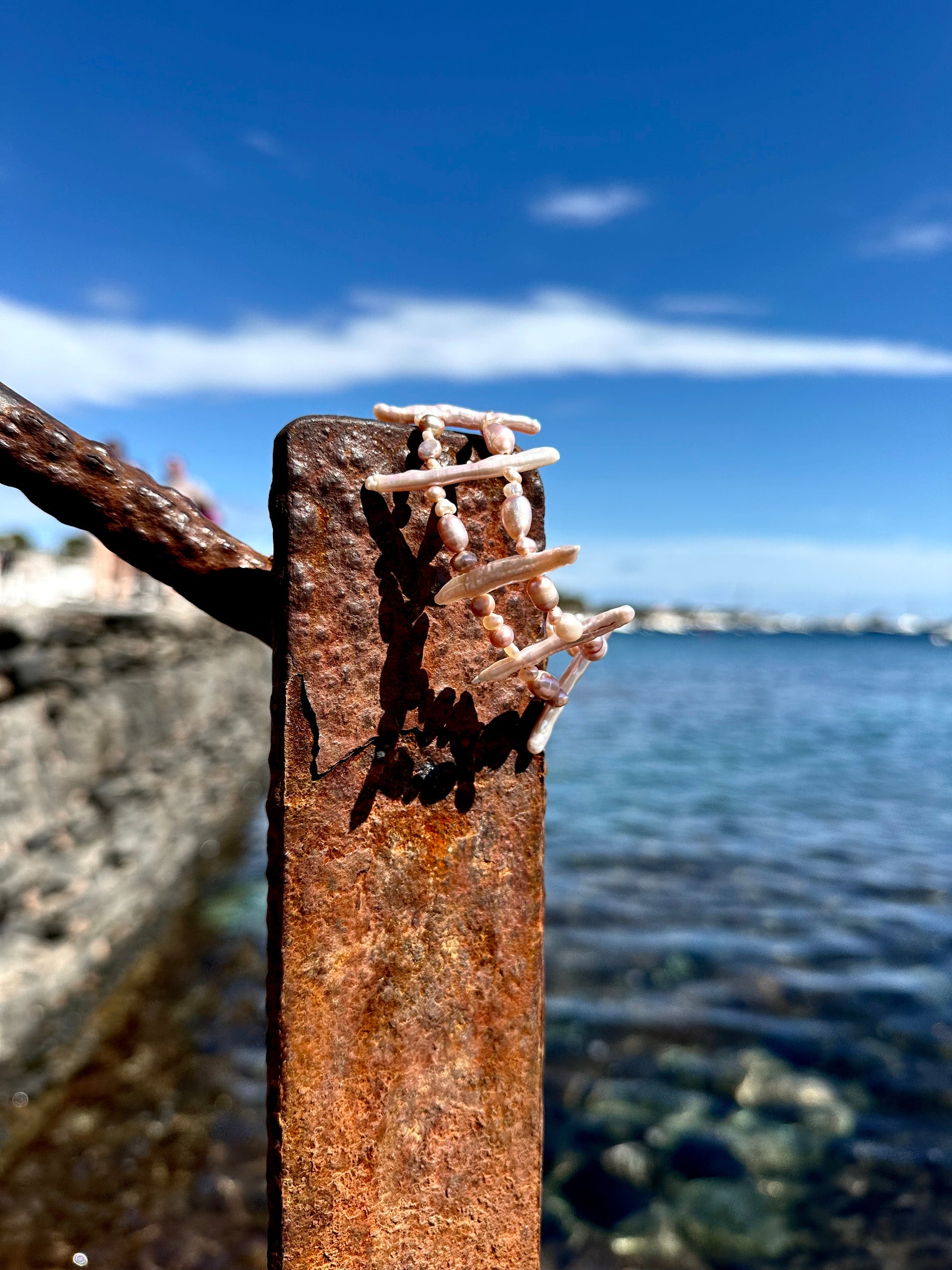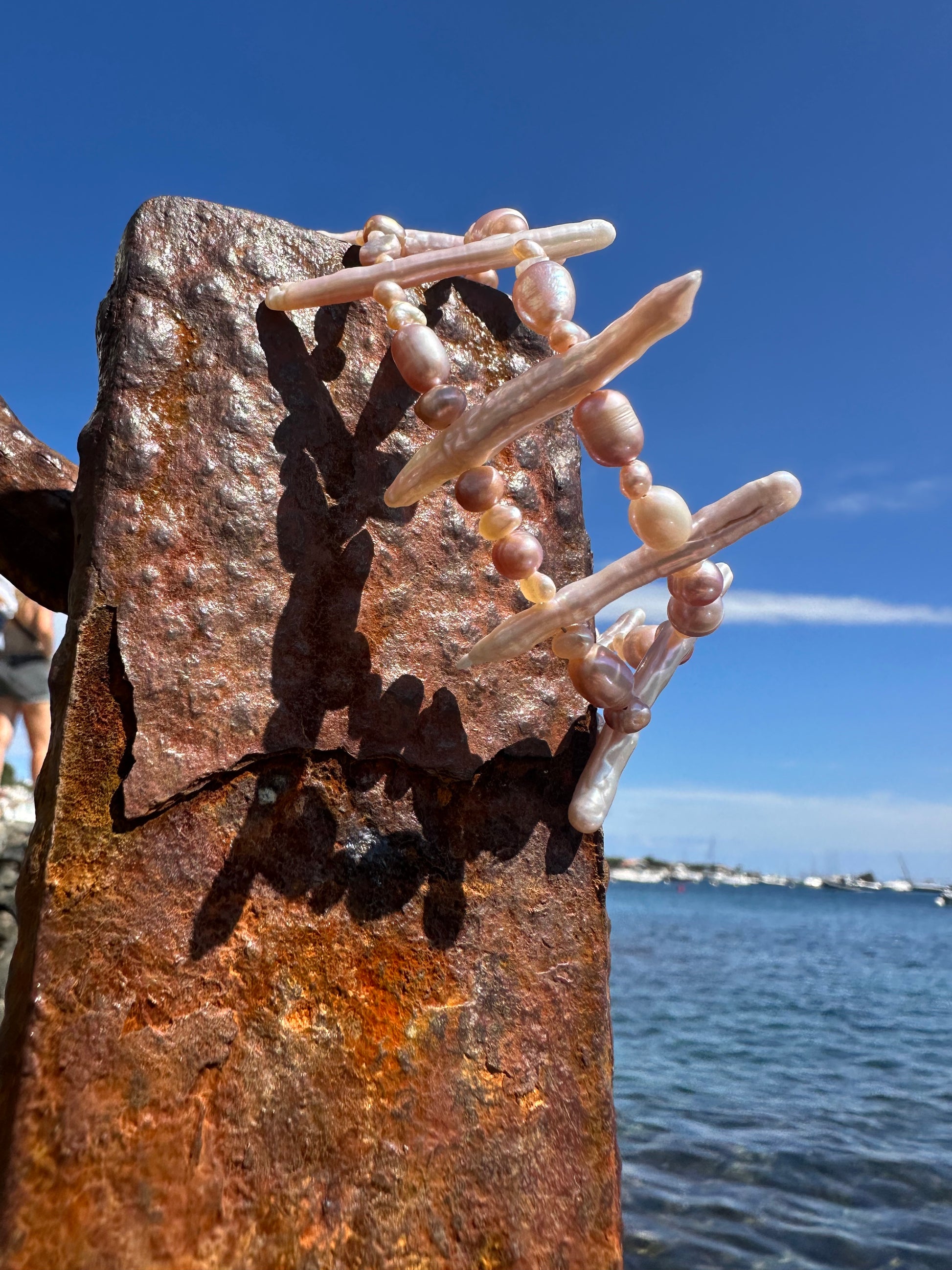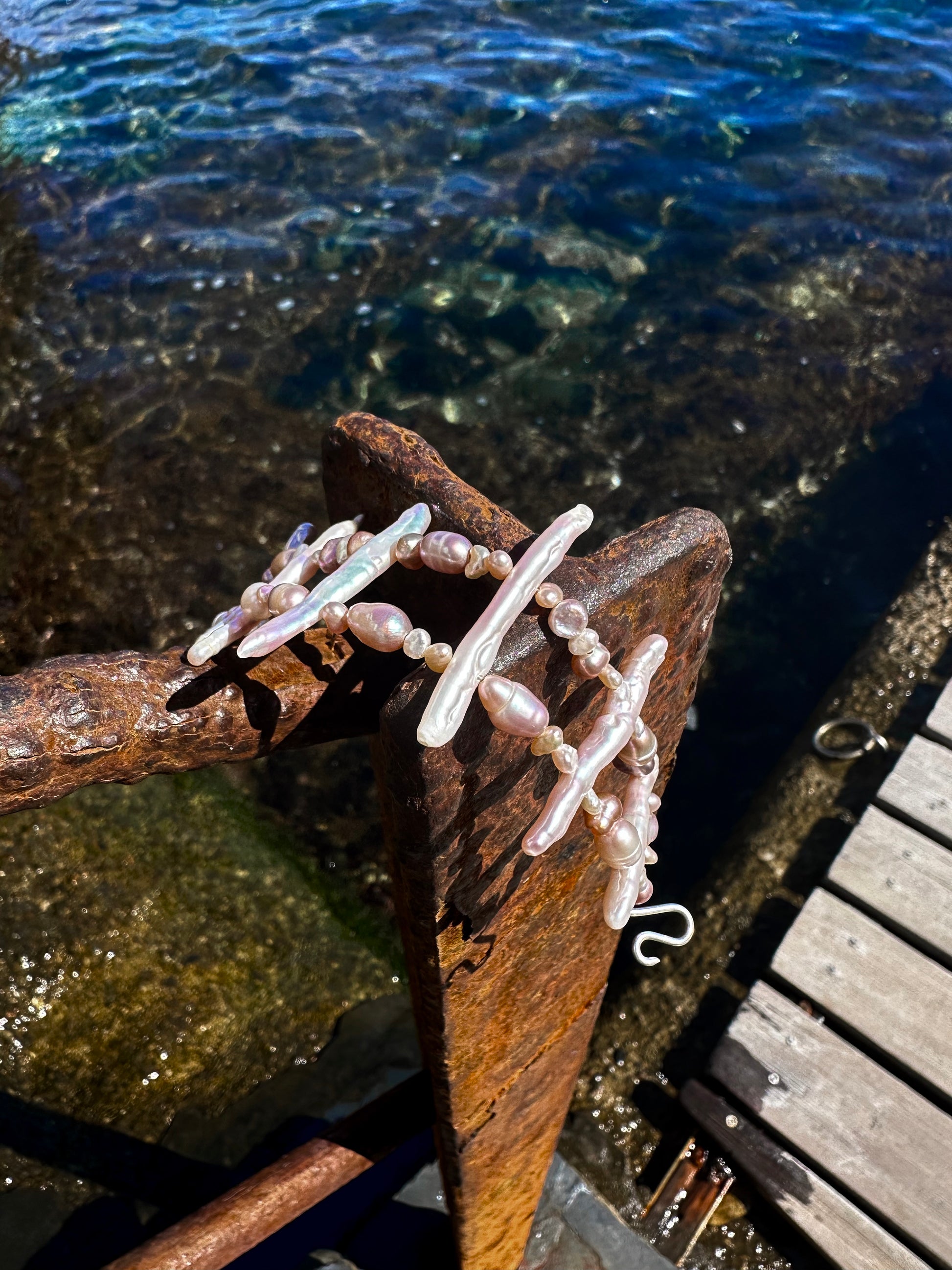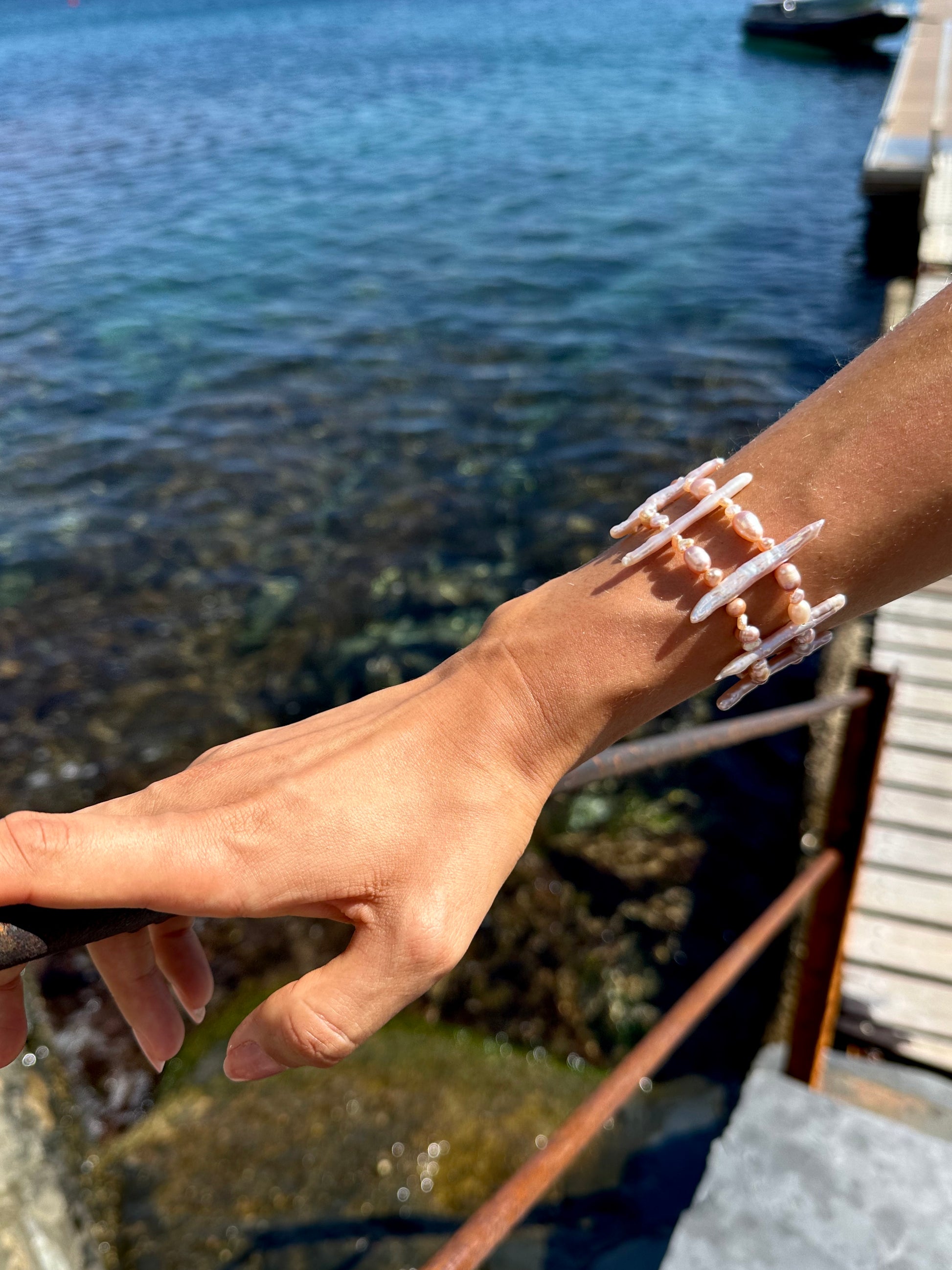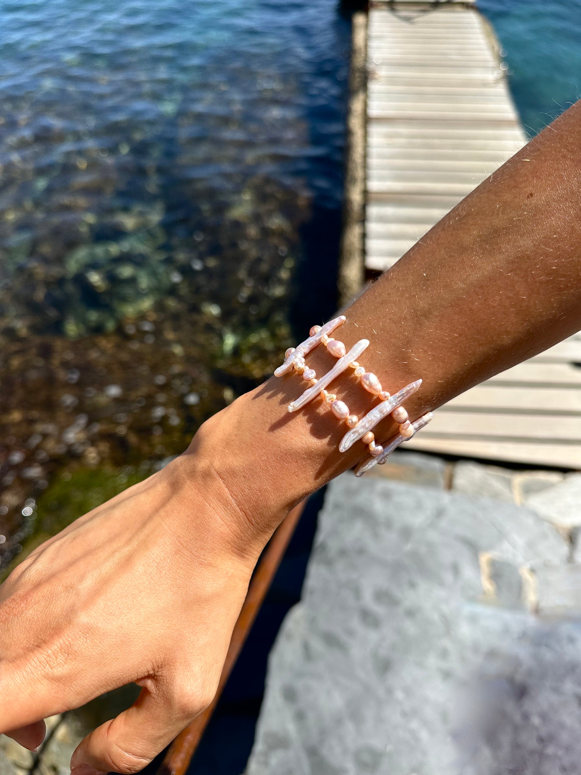 DARIA · pulsera doble cuidadosamente elaborada, separada por alargadas perlas barrocas de agua dulce. Estas piezas centrales están delicadamente rodeadas por perlas de agua dulce en suaves tonos rosados y de diferentes tamaños, que aportan un aire femenino y armonioso al diseño.