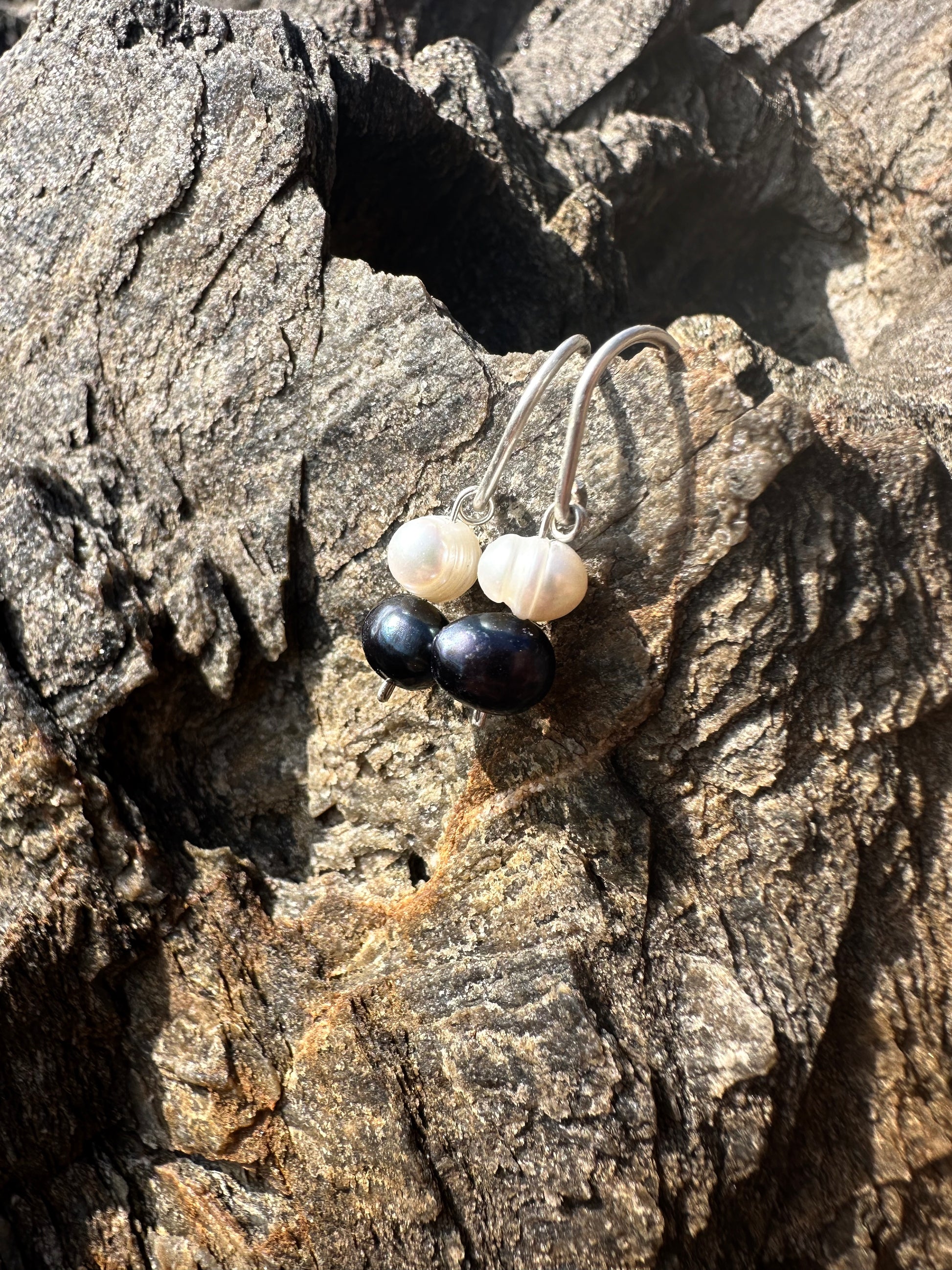 DRE · pendientes delicados con dos pequeñas perlas cultivadas de agua dulce: una blanca y otra oscura, que revela matices iridiscentes según la luz del sol.
