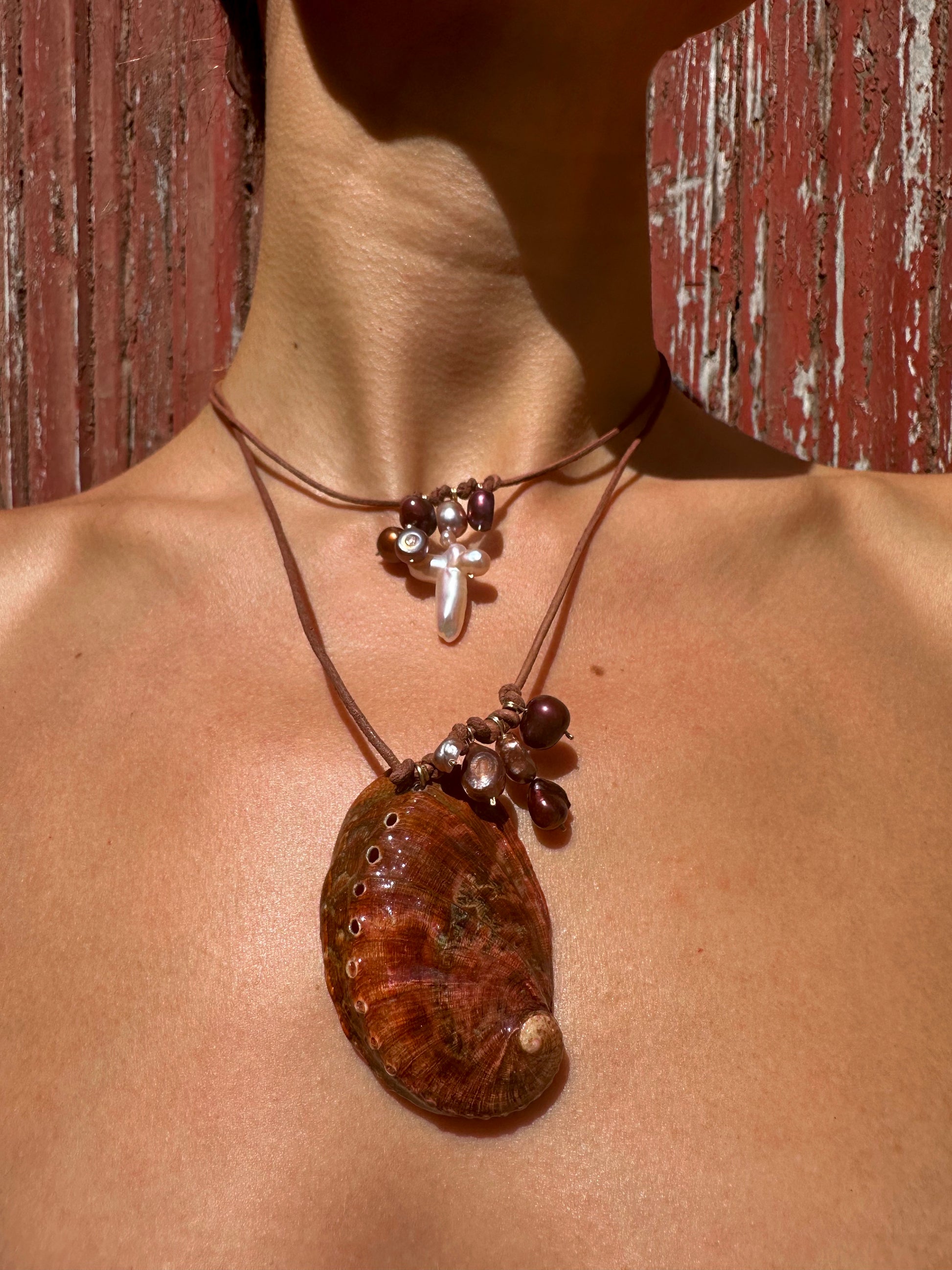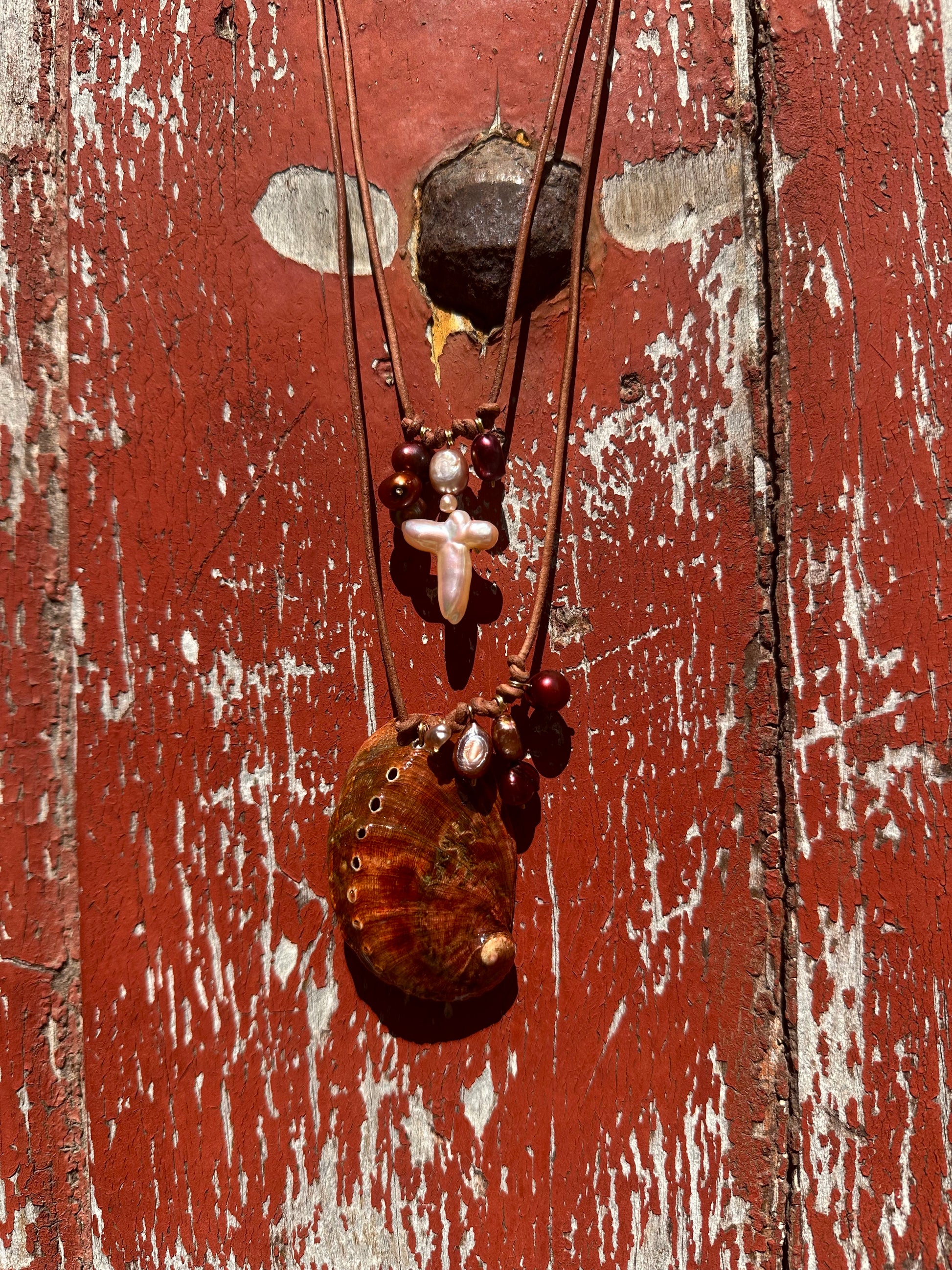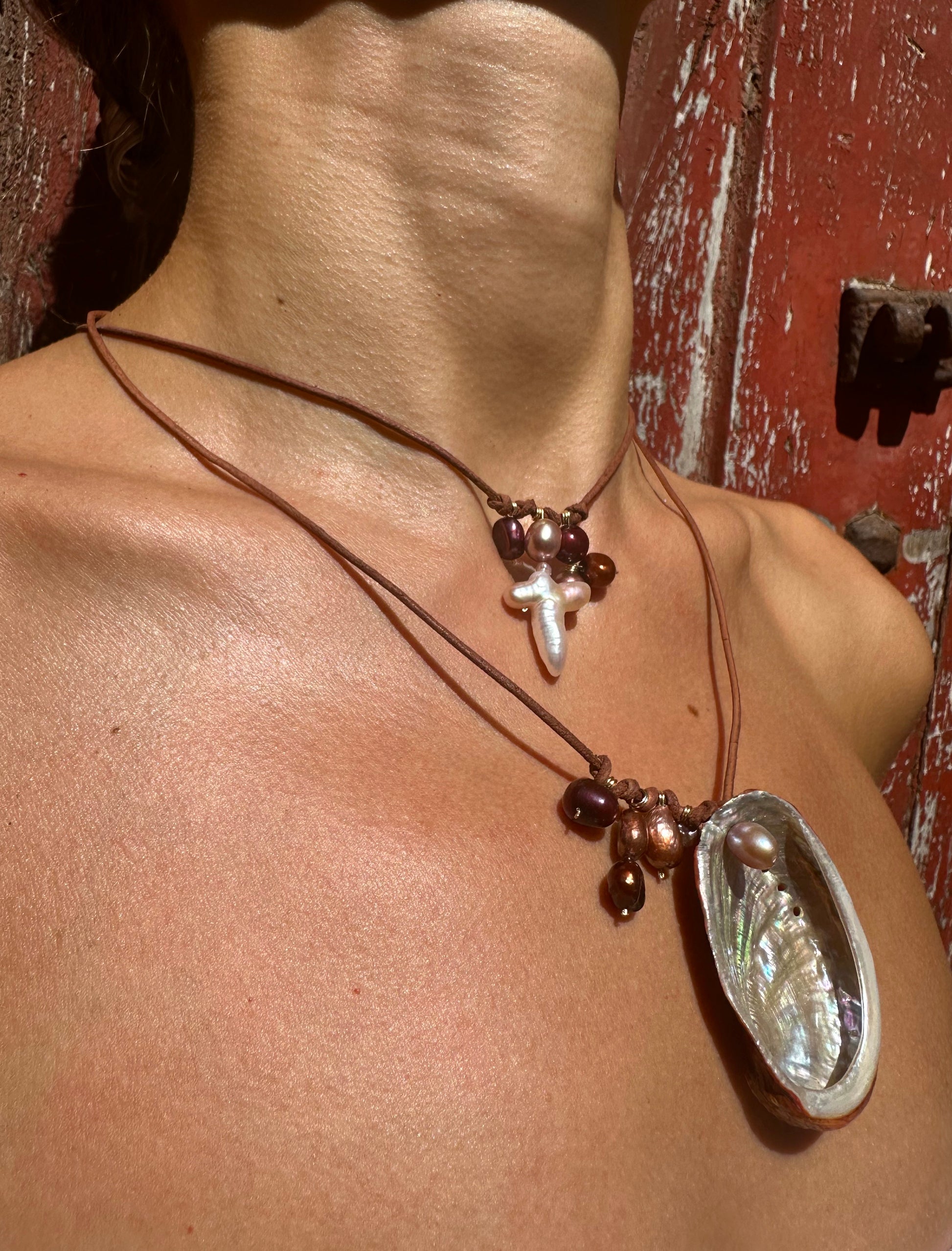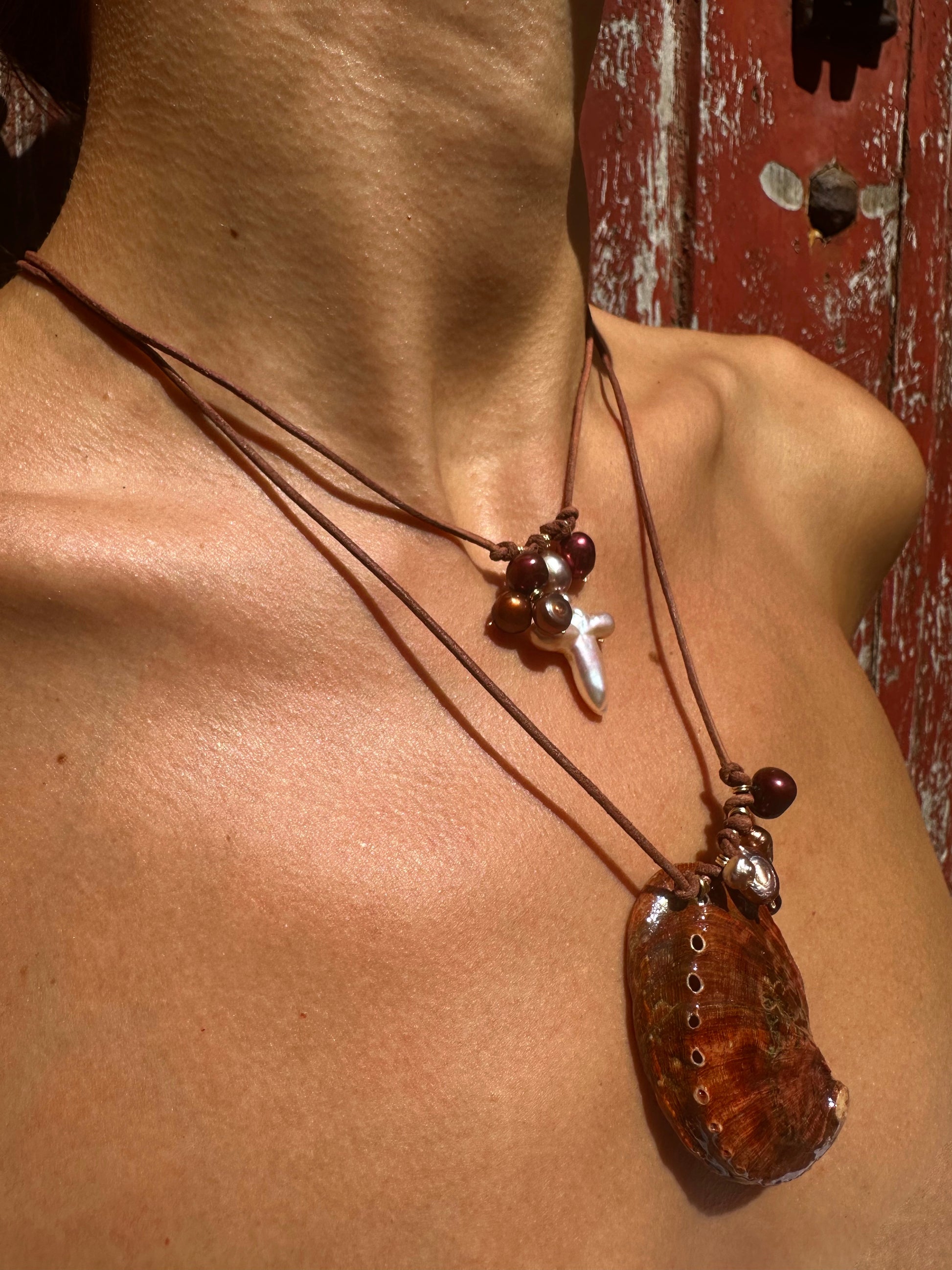 EDDA · este collar doble combina cuero natural con elementos marinos de gran belleza. La cadena corta lleva una perla barroca de agua dulce en forma de cruz, rodeada por perlas en tonalidades rojizas y bronce. En la cadena más larga cuelga una impresionante concha de abulón en tonos rojizos, también adornada con perlas colgantes en matices cálidos de bronce.