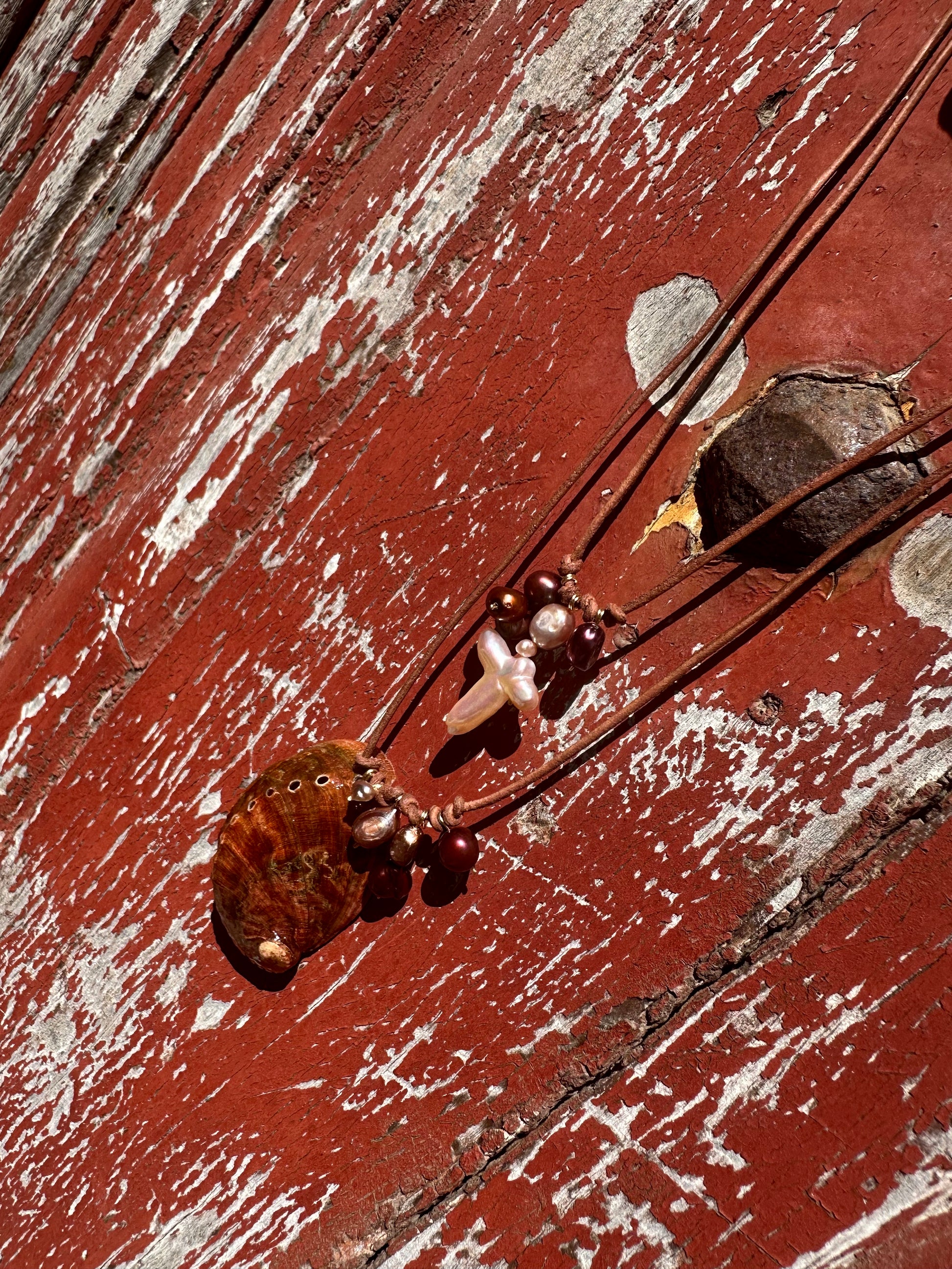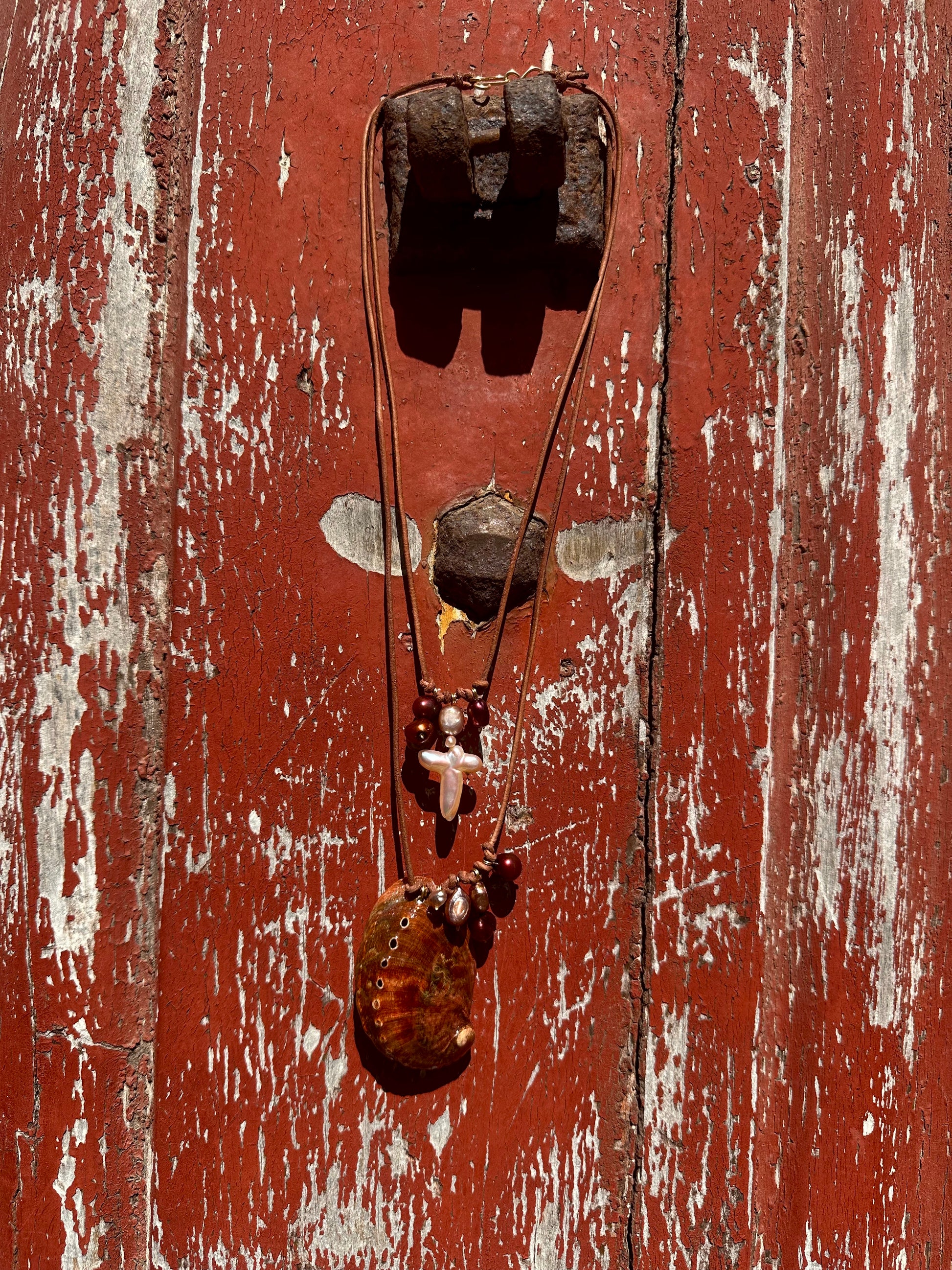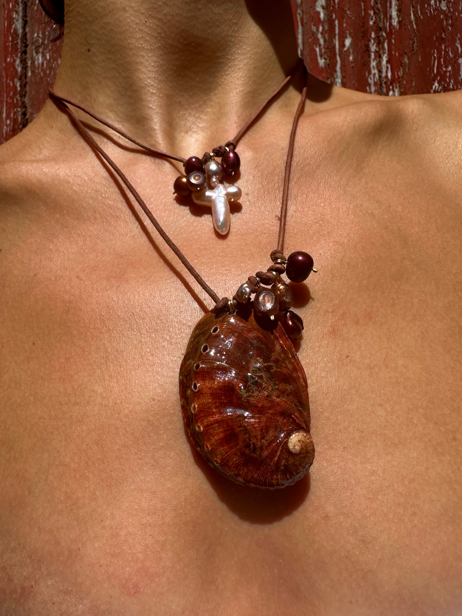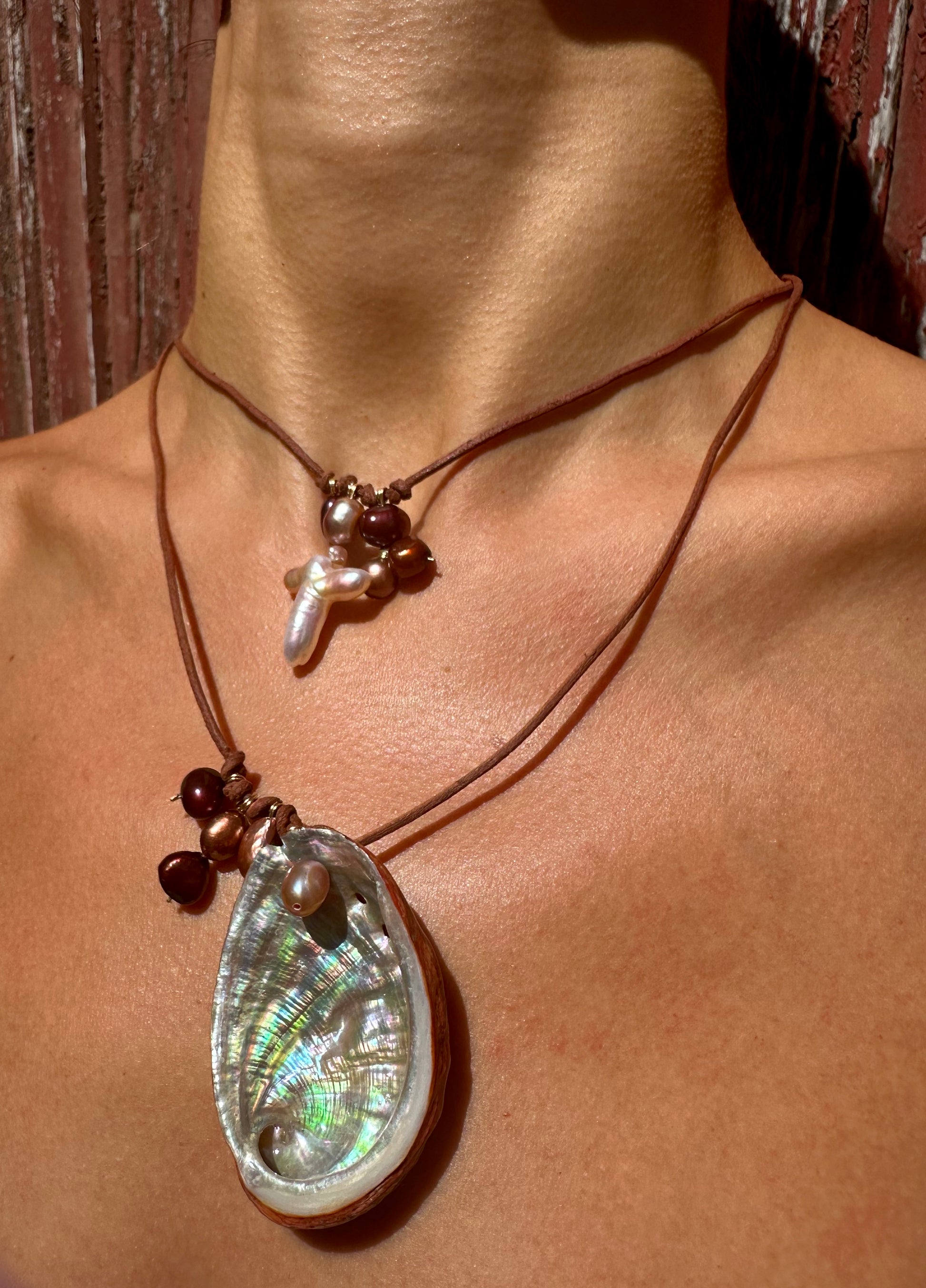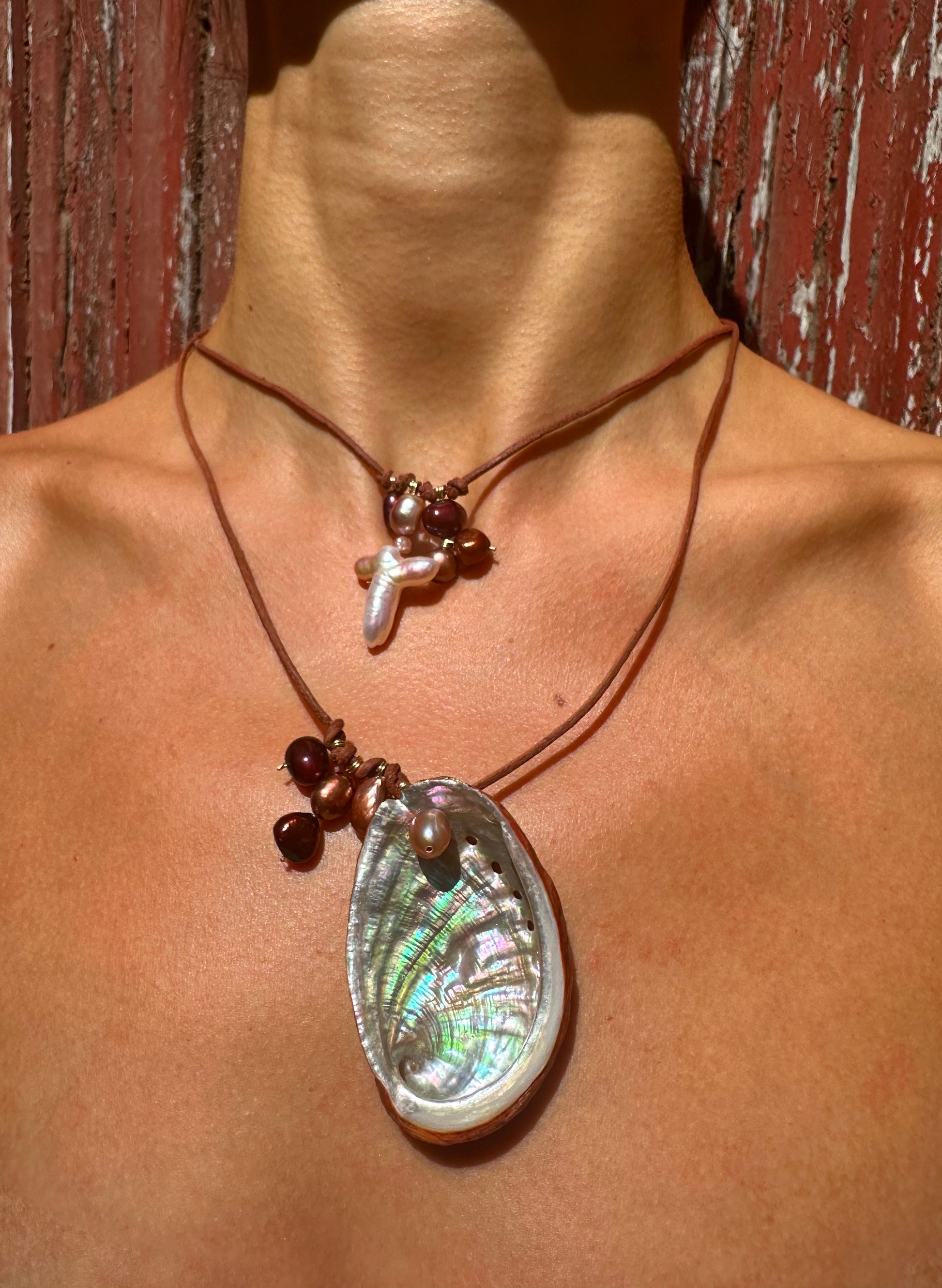 EDDA · este collar doble combina cuero natural con elementos marinos de gran belleza. La cadena corta lleva una perla barroca de agua dulce en forma de cruz, rodeada por perlas en tonalidades rojizas y bronce. En la cadena más larga cuelga una impresionante concha de abulón en tonos rojizos, también adornada con perlas colgantes en matices cálidos de bronce.