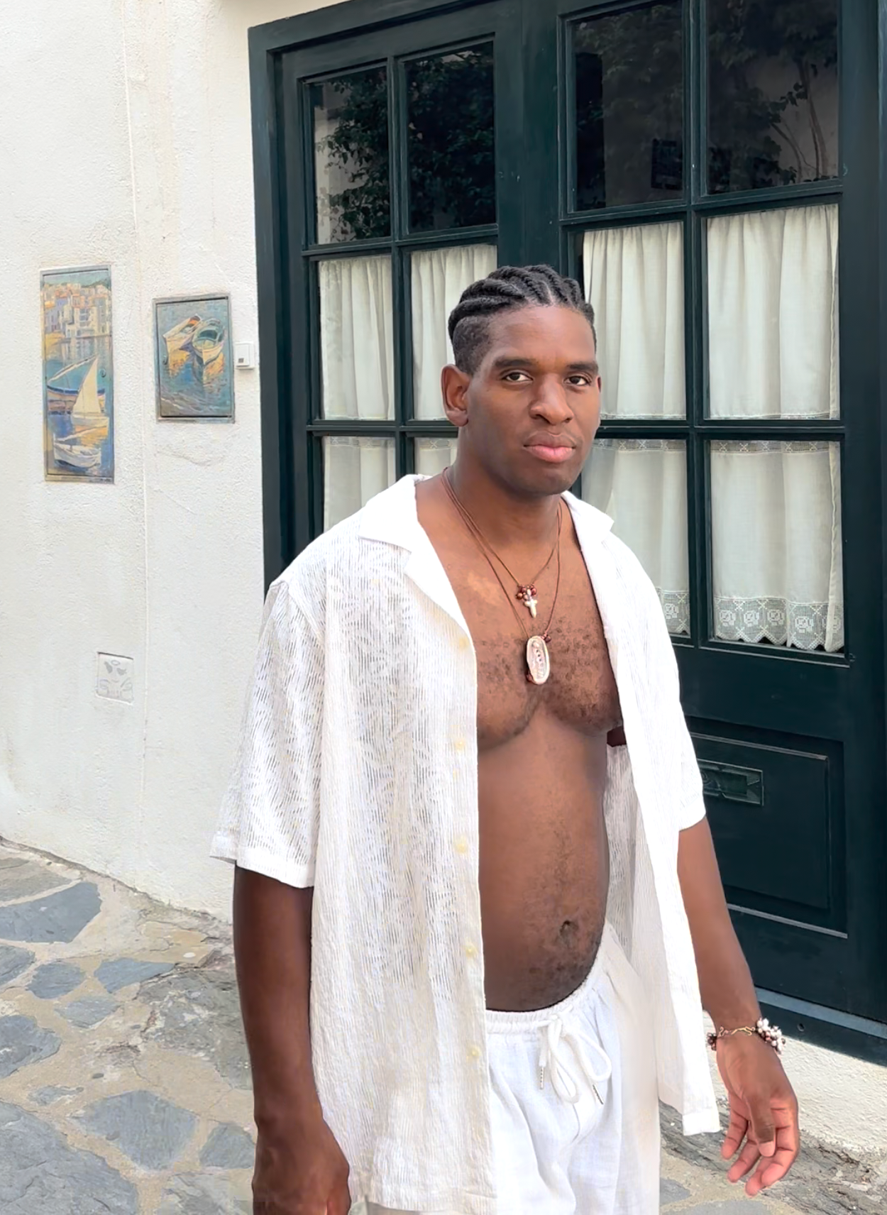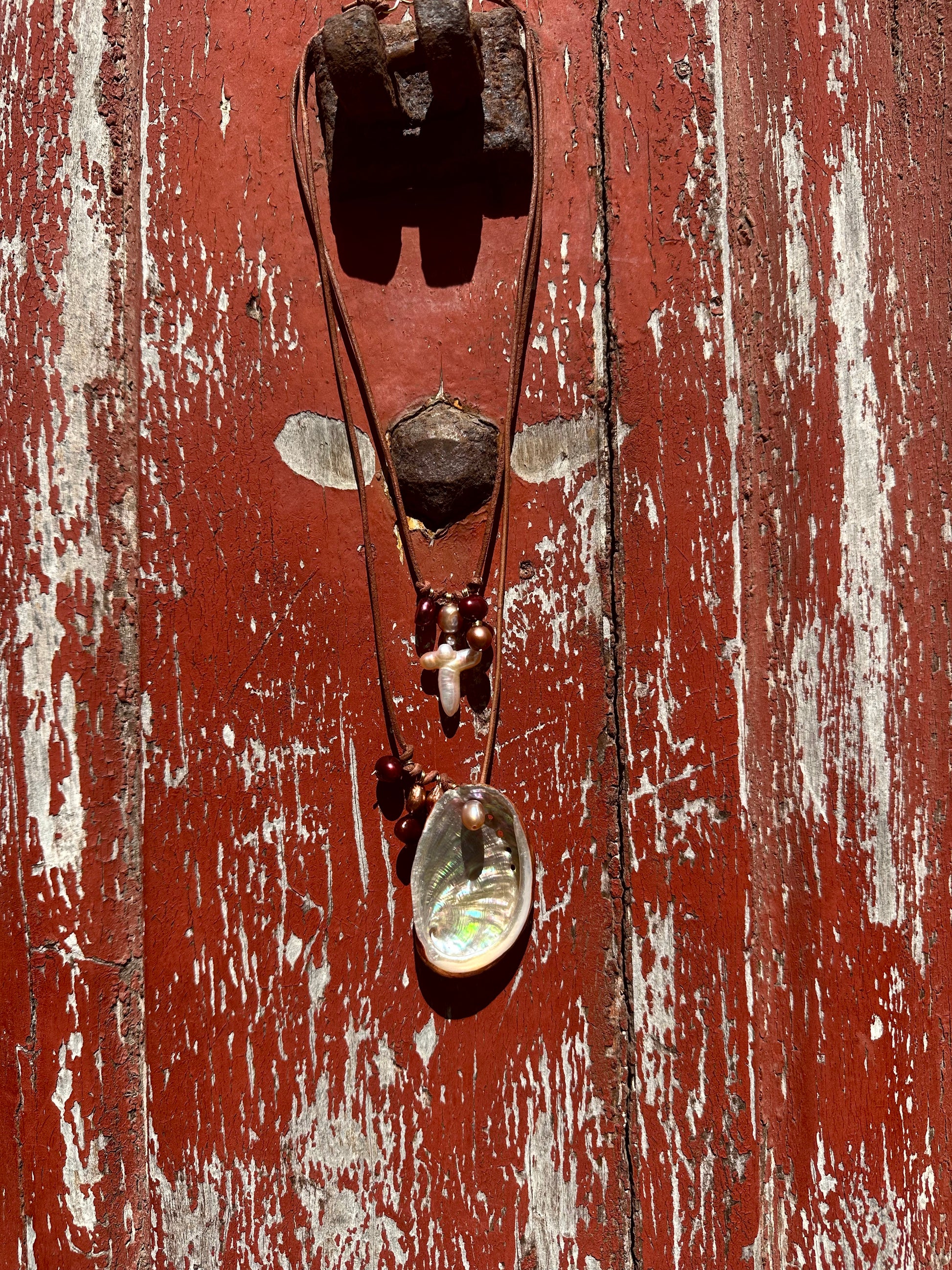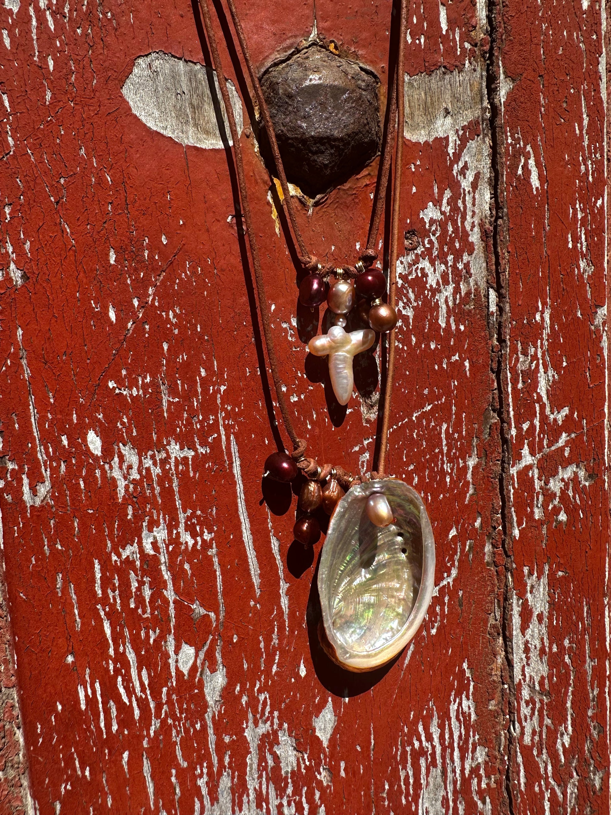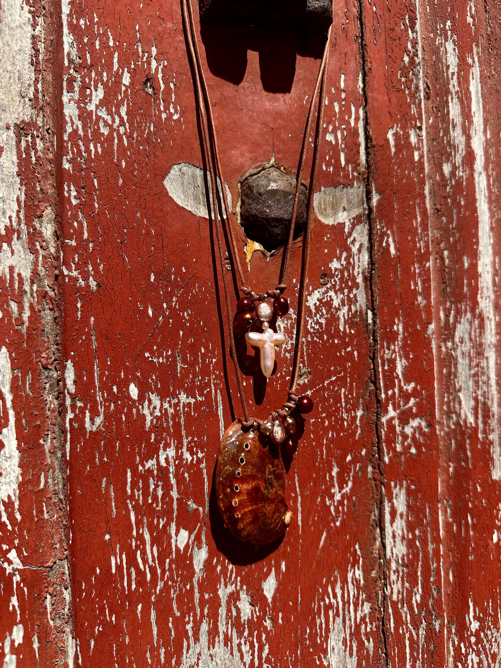 EDDA · este collar doble combina cuero natural con elementos marinos de gran belleza. La cadena corta lleva una perla barroca de agua dulce en forma de cruz, rodeada por perlas en tonalidades rojizas y bronce. En la cadena más larga cuelga una impresionante concha de abulón en tonos rojizos, también adornada con perlas colgantes en matices cálidos de bronce.