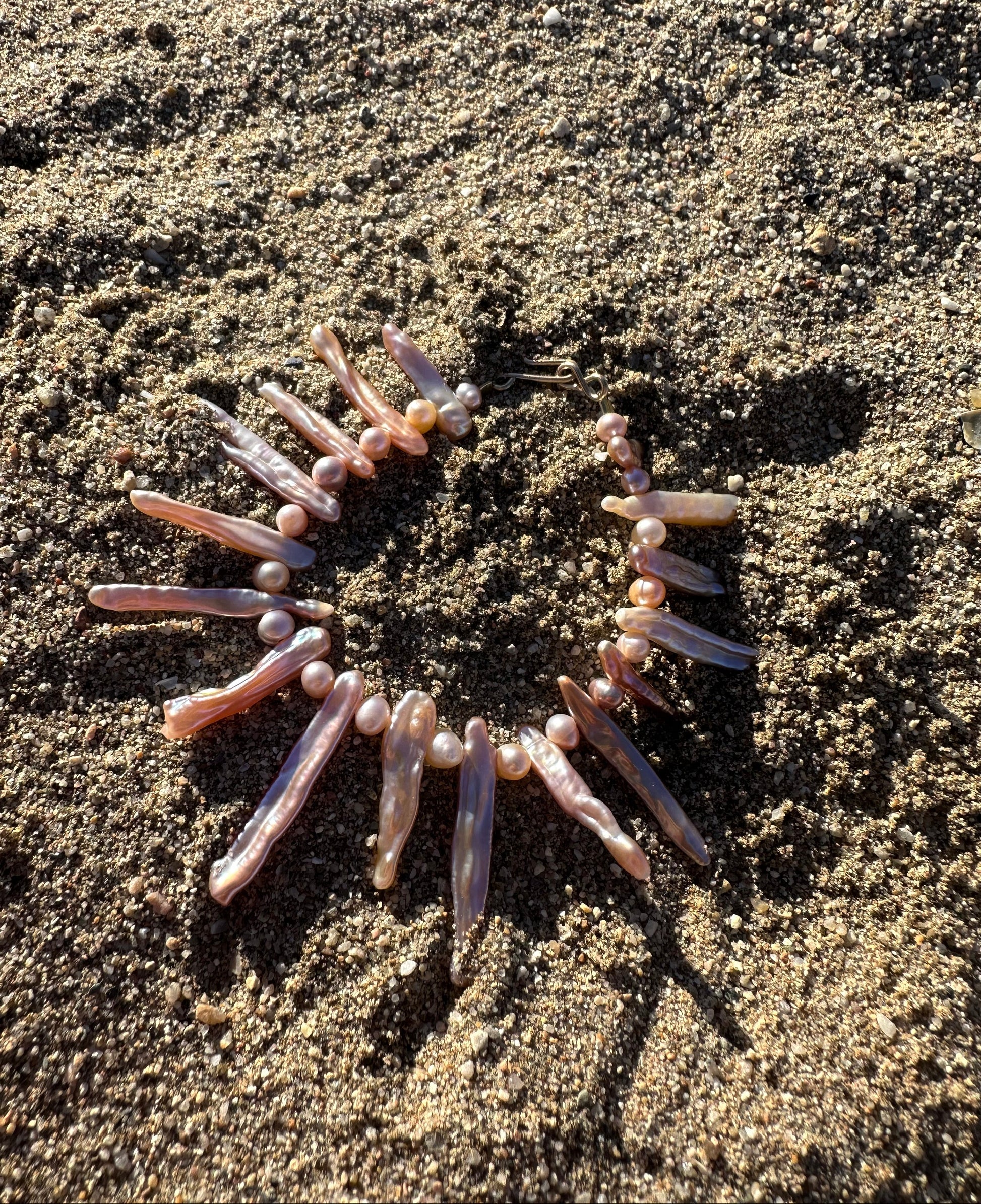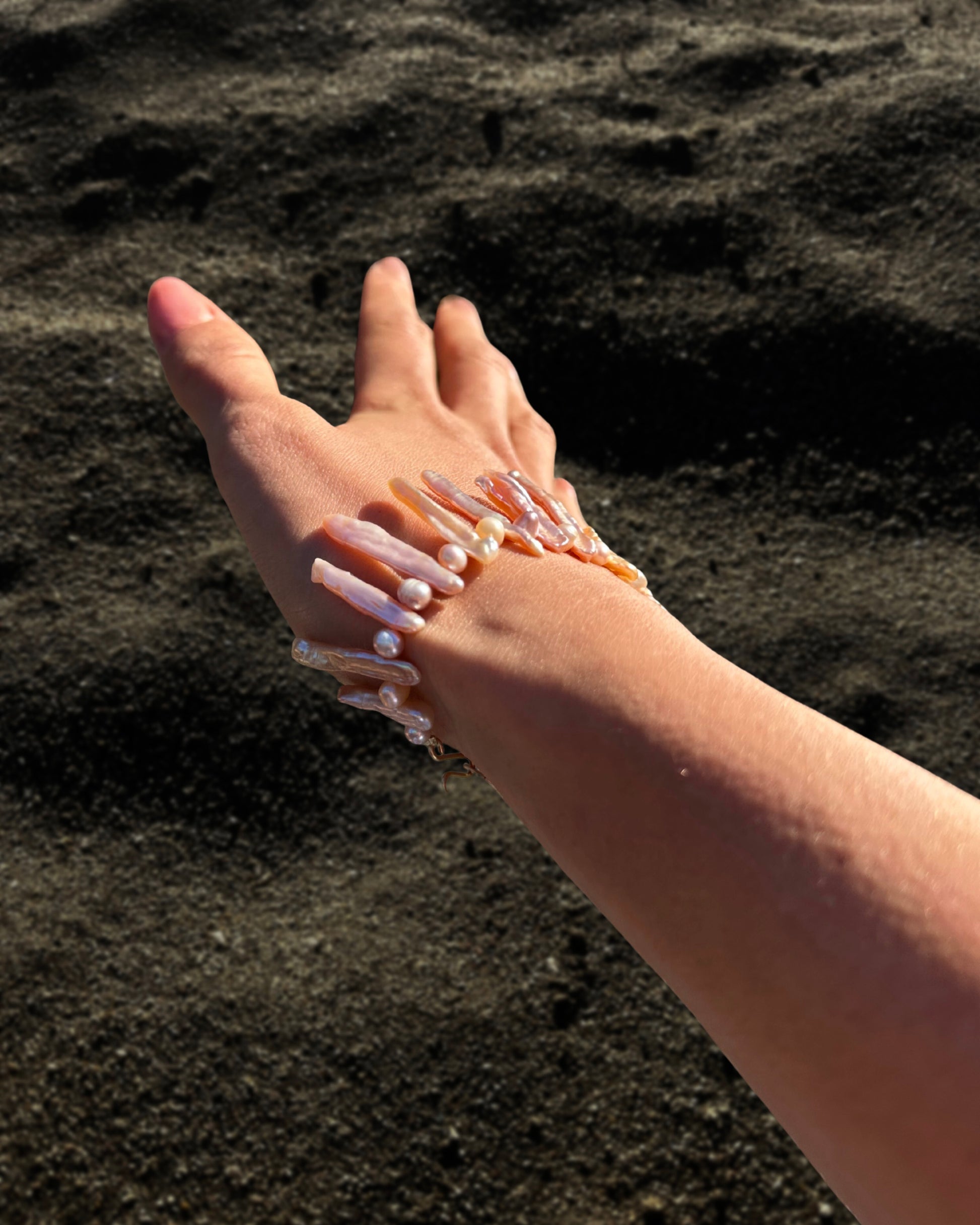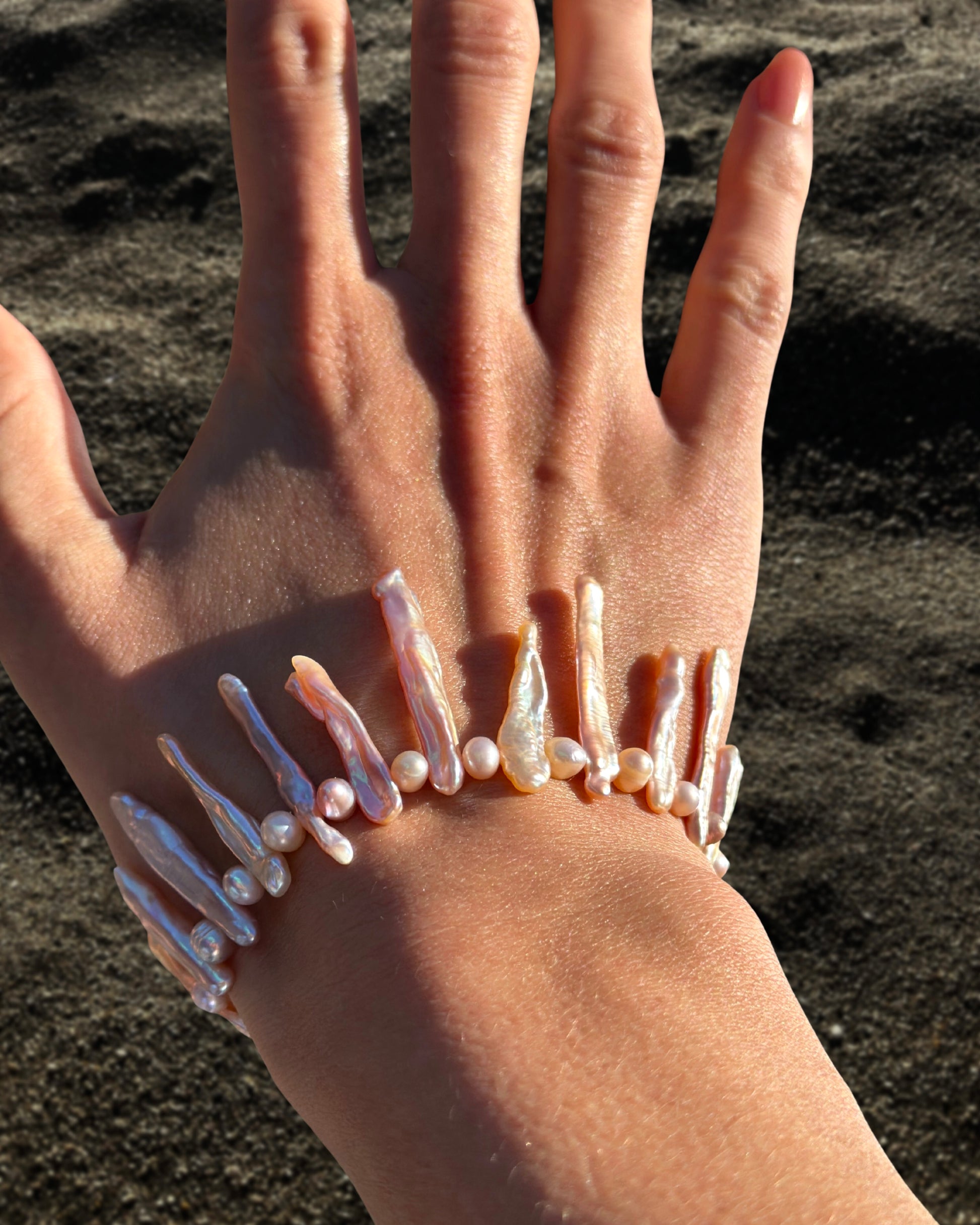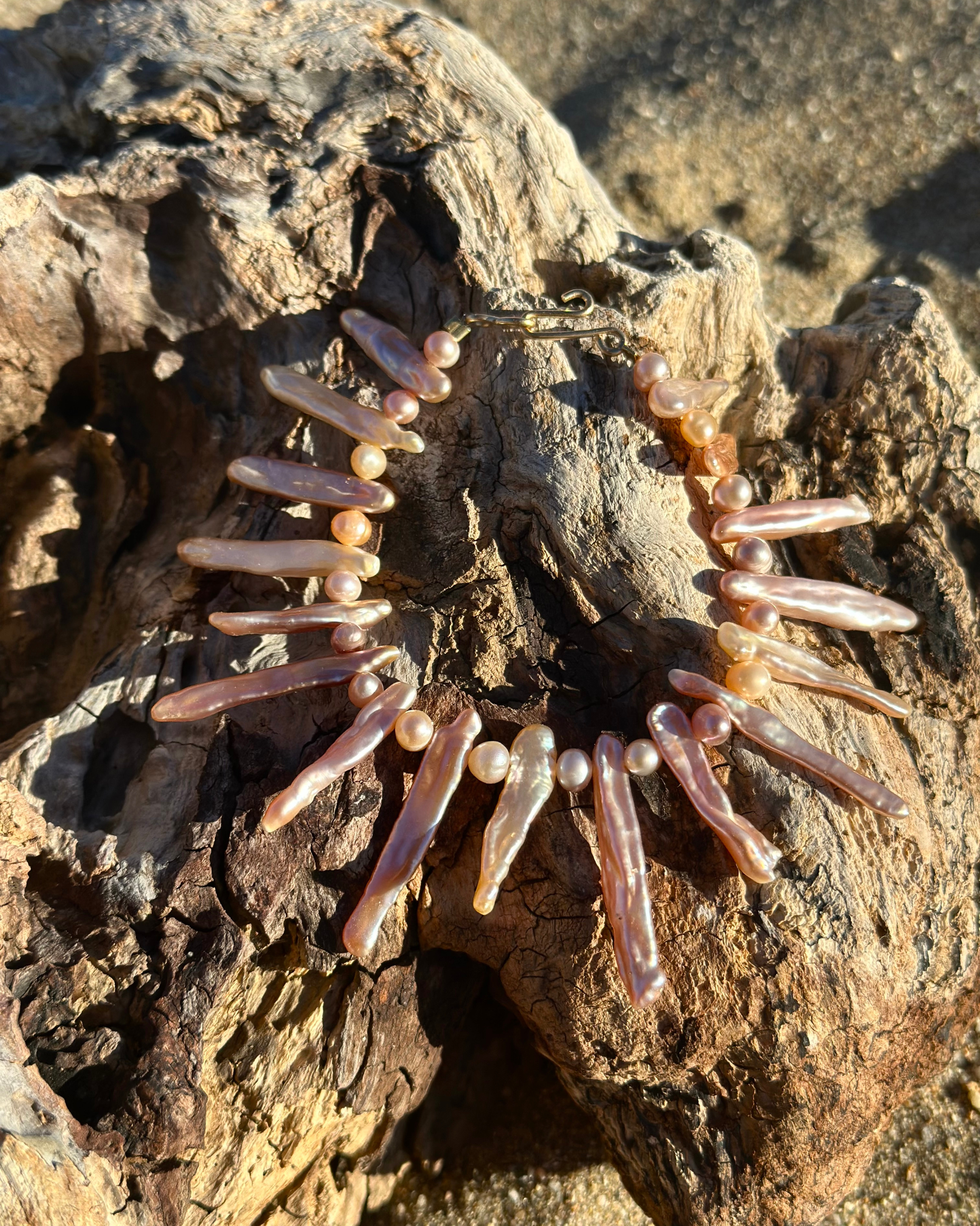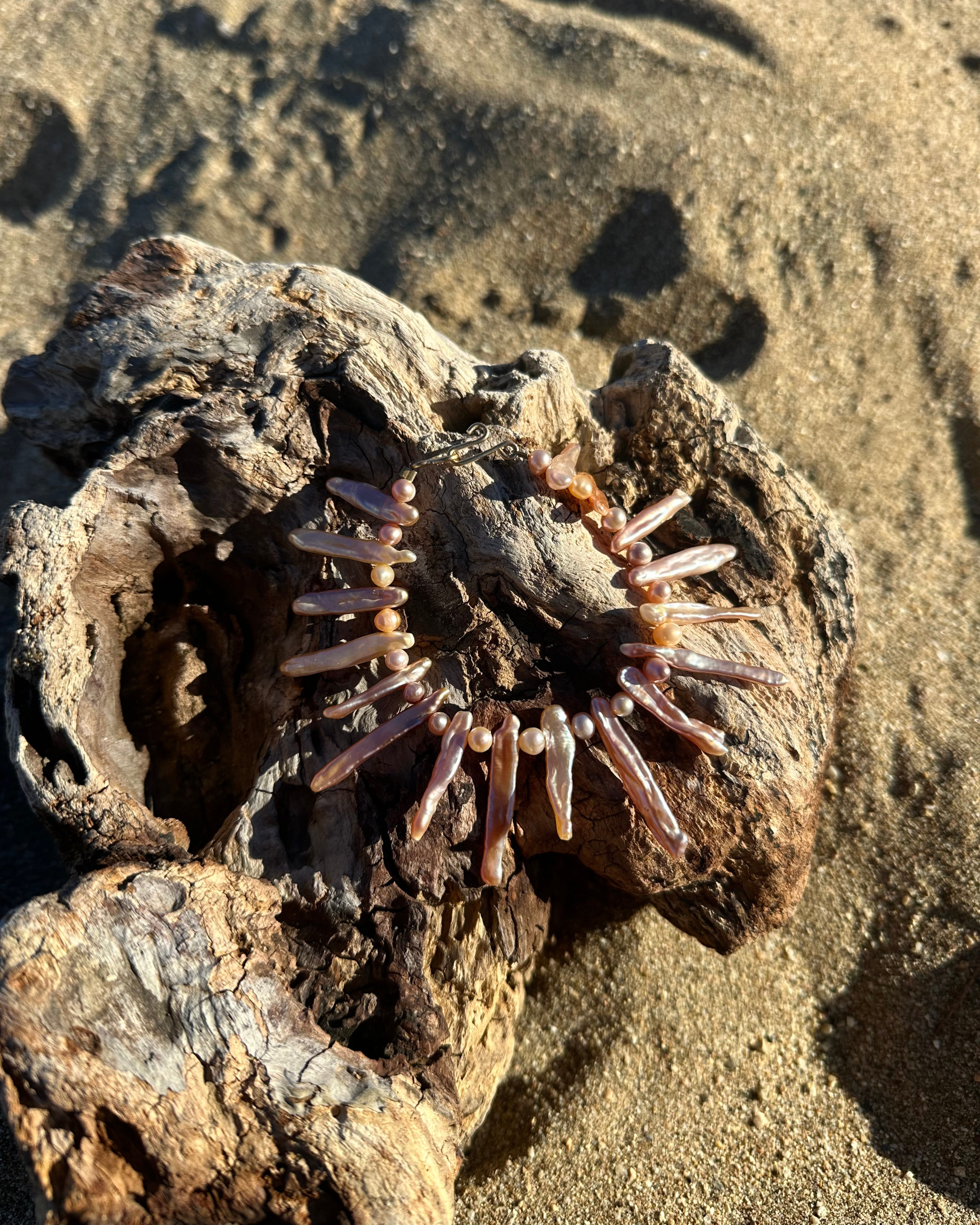 EMILIA · pulsera elaborada con perlas Keshi alargadas en suaves tonos dorados y rosados, combinadas con pequeñas perlas de agua dulce en matices armoniosos. El brillo sutil de las perlas crea un juego de luz que resalta la delicadeza artesanal y la belleza natural de cada pieza.