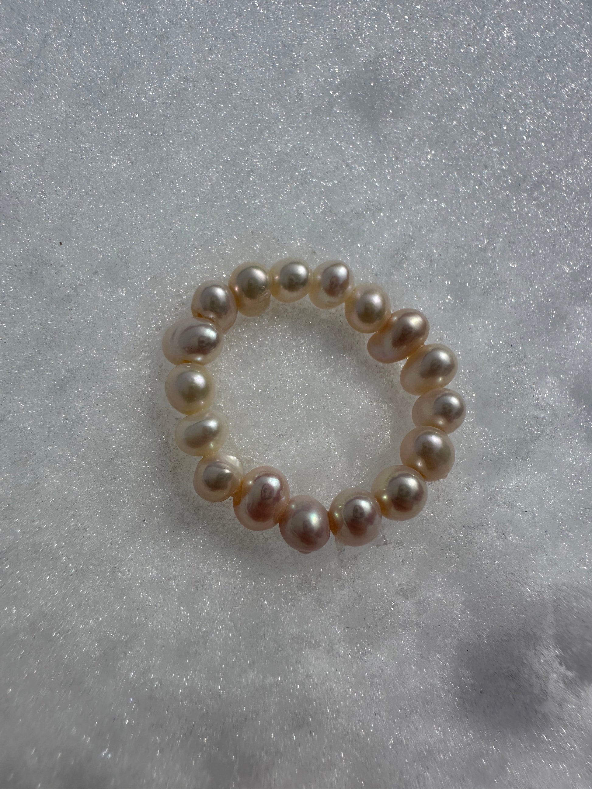 ETERNIS · anillo elástico compuesto por pequeñas perlas de agua dulce en forma potato, de tono crema que, según la incidencia de la luz, reflejan sutiles matices dorado-rosé.
