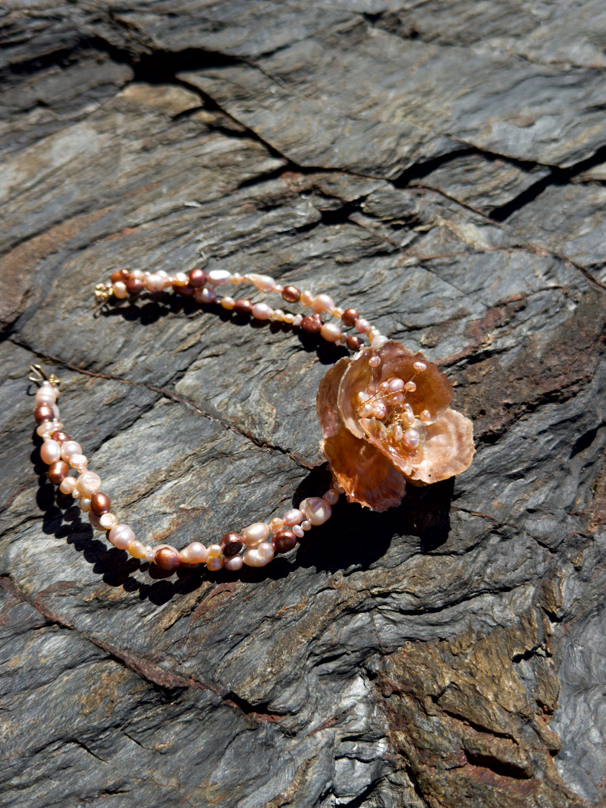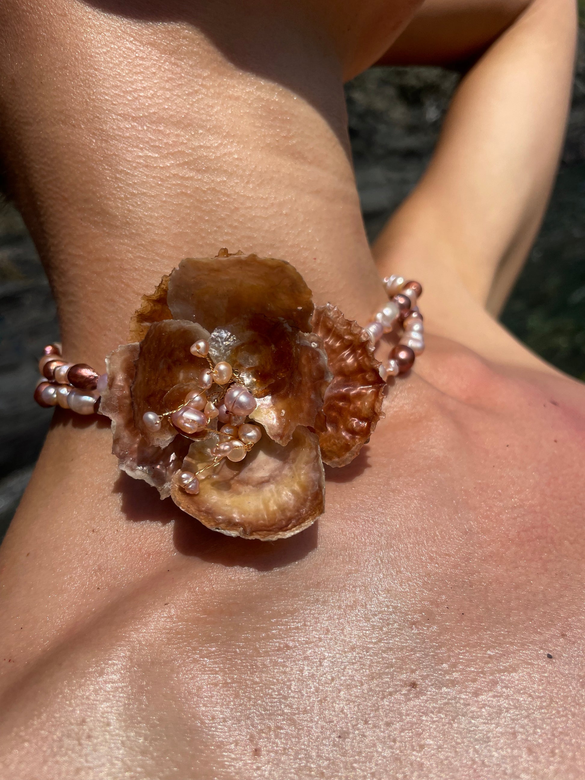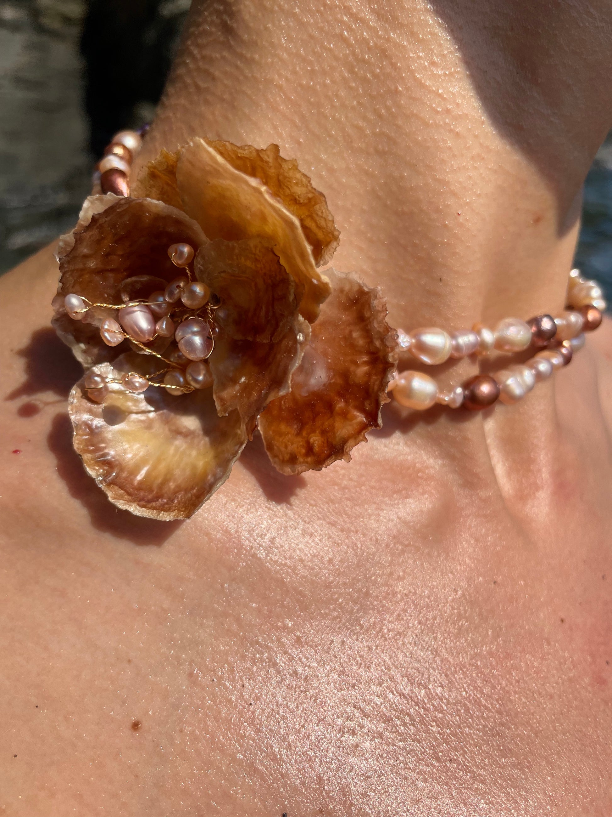 FLORA · choker delicado con una flor nacarada en tonos bronce, formada por varias conchas y adornada con perlas de agua dulce que evocan estambres, entrelazadas en fino hilo de oro laminado. Rodeada de perlas en matices bronce y rosé.
