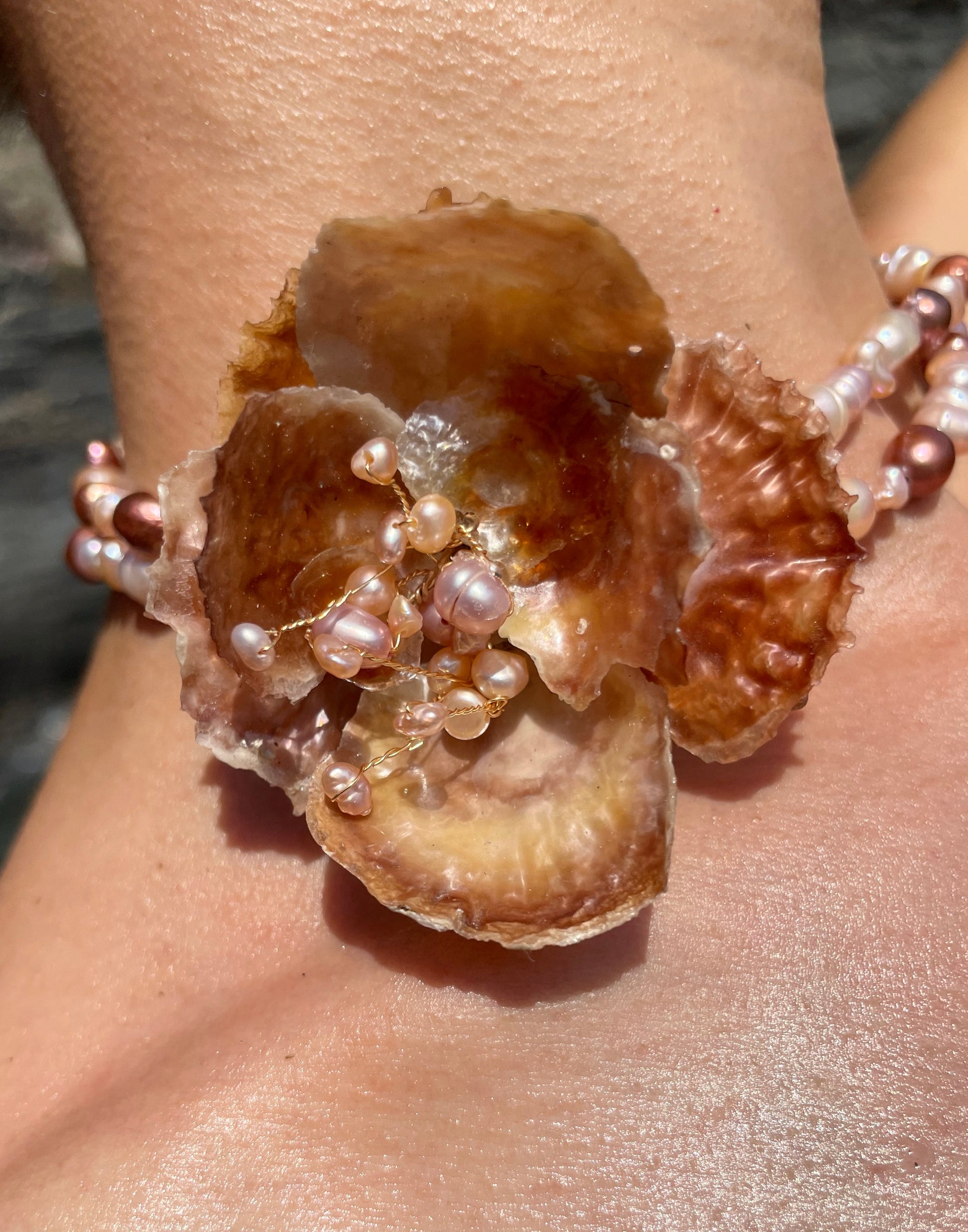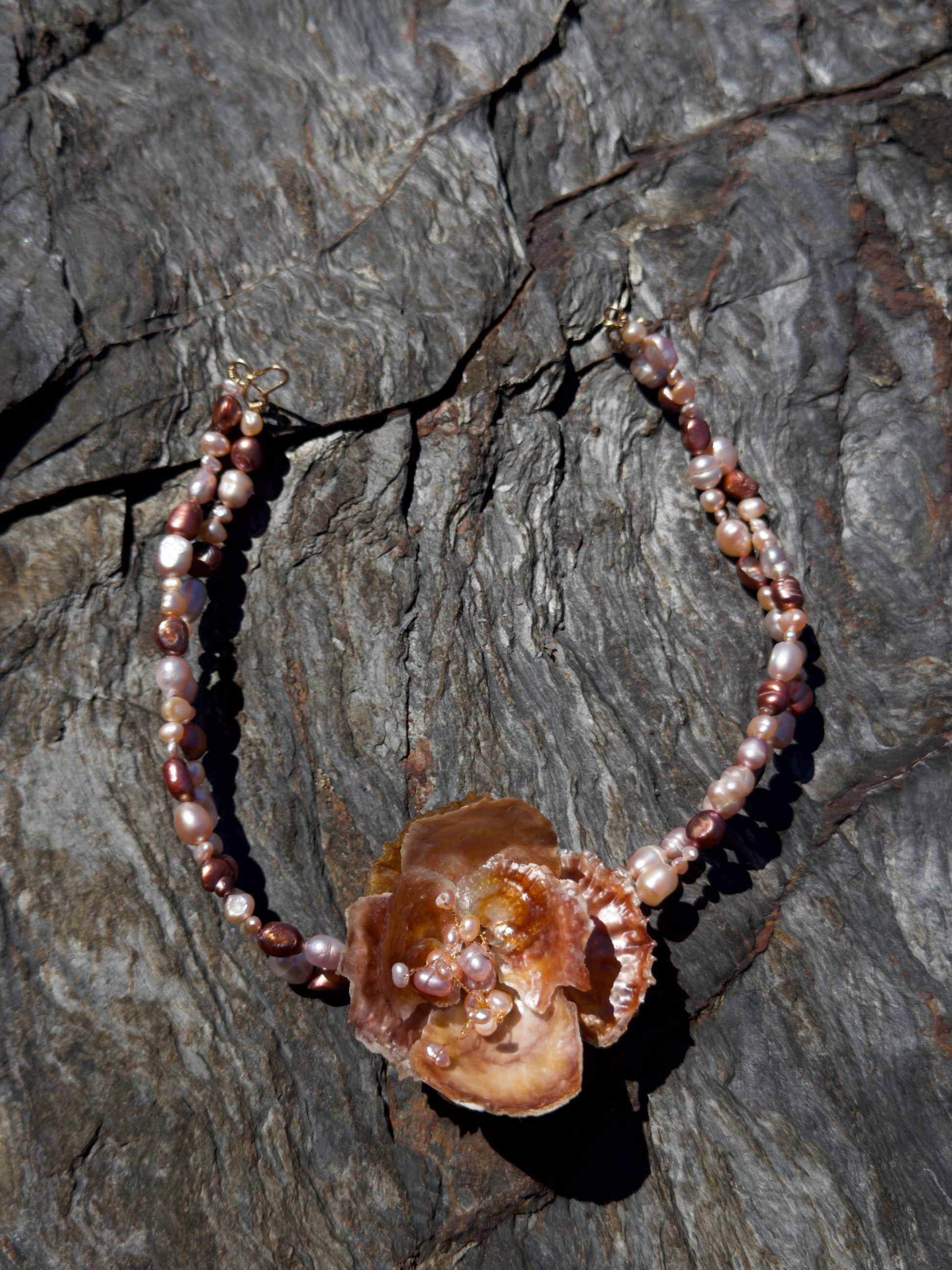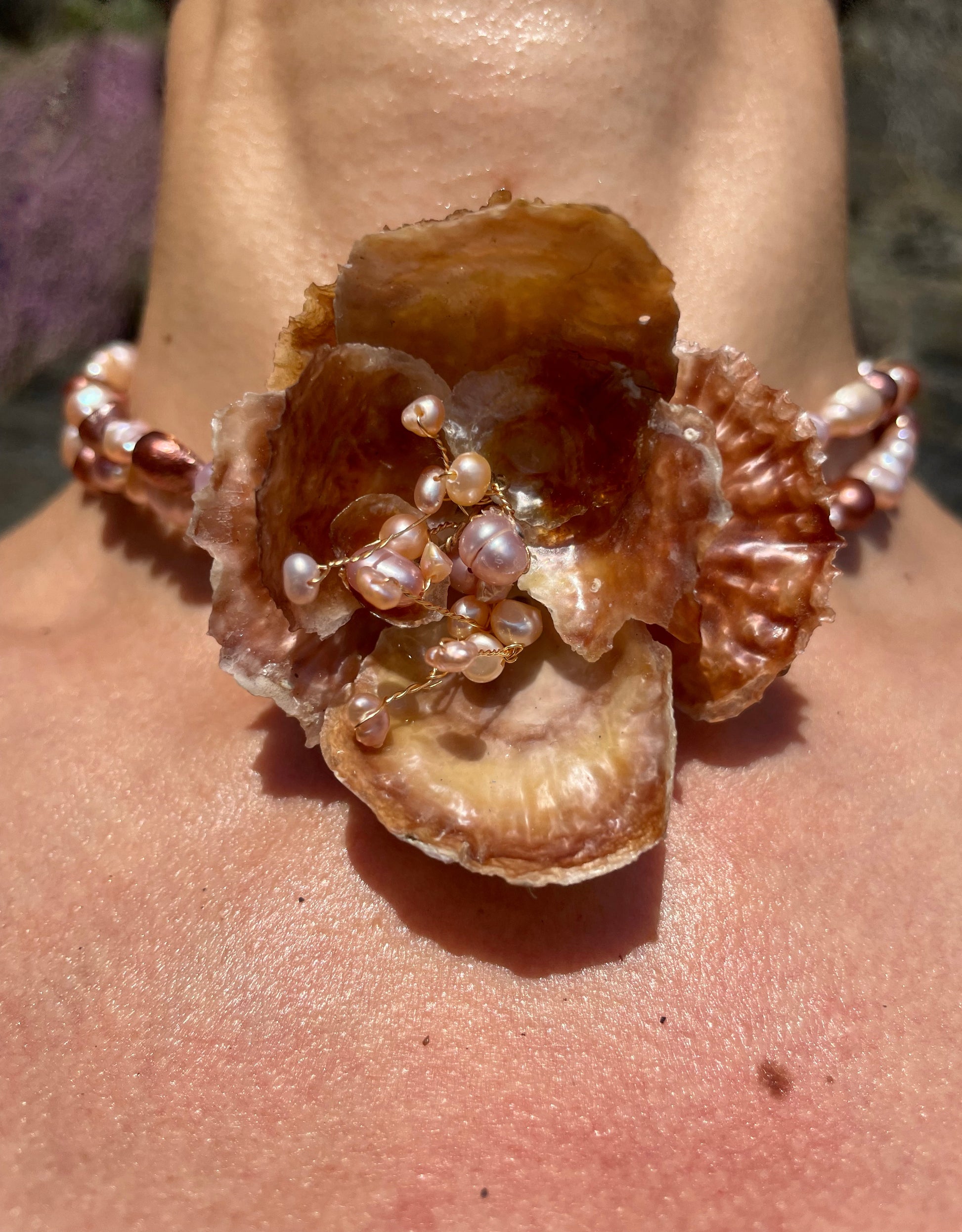 FLORA · choker delicado con una flor nacarada en tonos bronce, formada por varias conchas y adornada con perlas de agua dulce que evocan estambres, entrelazadas en fino hilo de oro laminado. Rodeada de perlas en matices bronce y rosé.