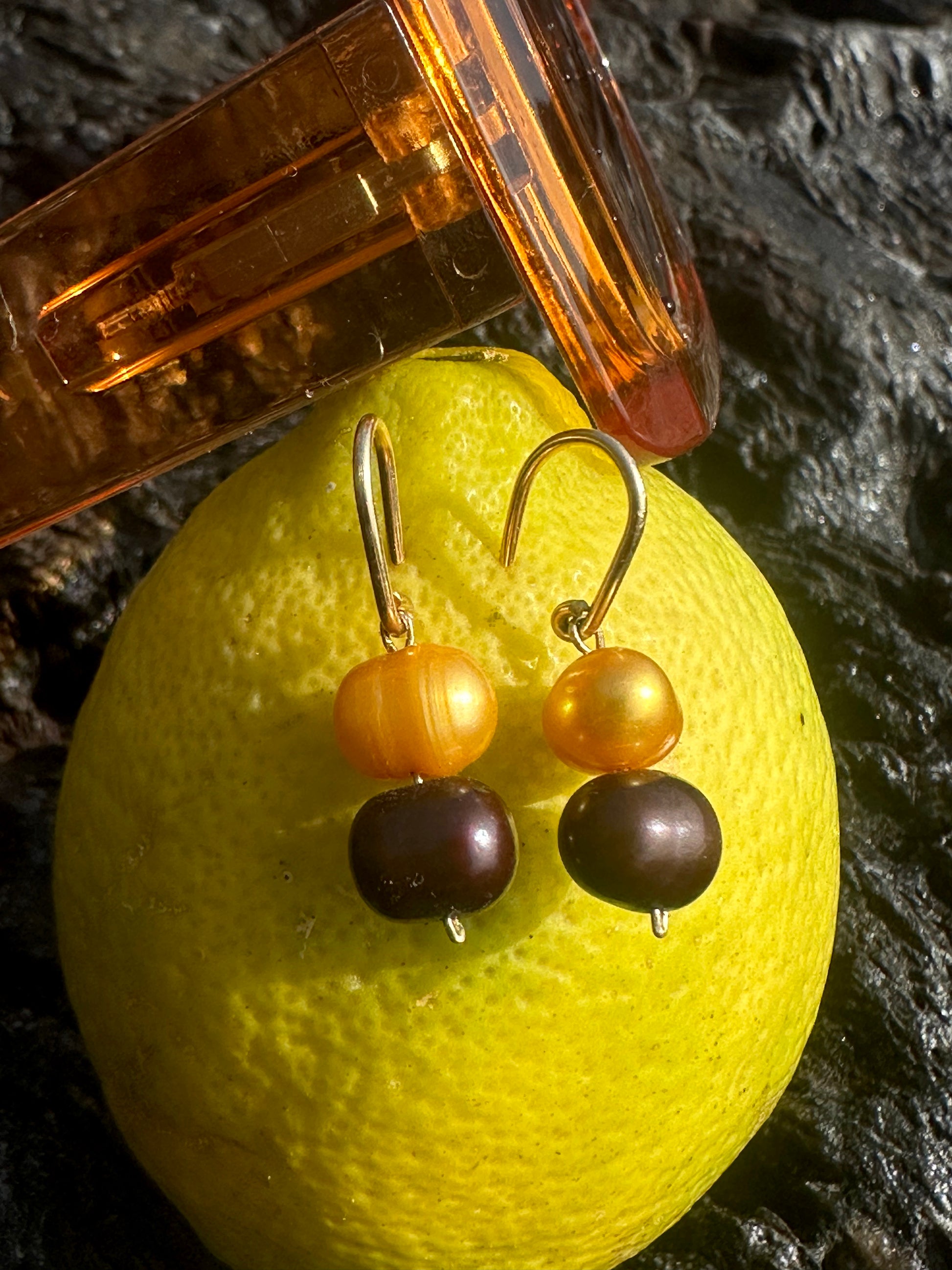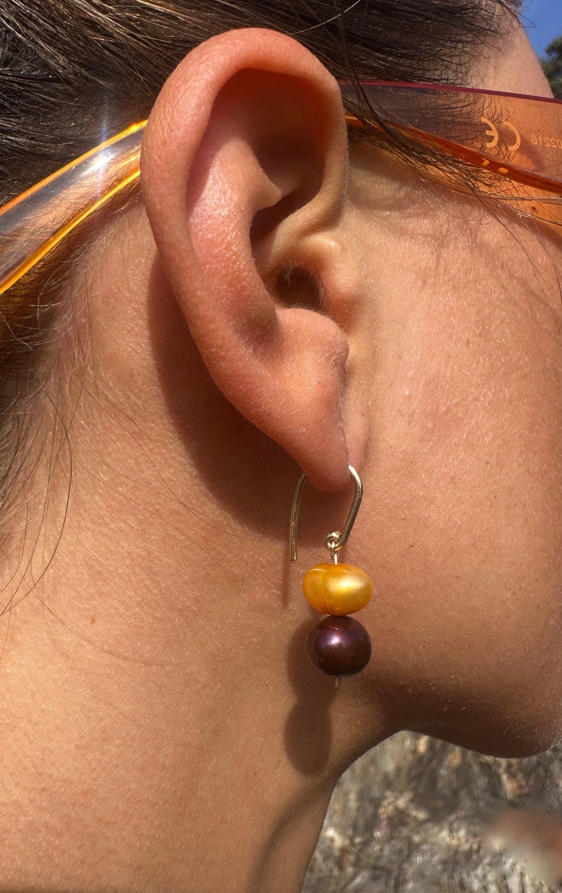 FUEGO · pendientes compuestos por perlas de agua dulce en tonos dorados y rojo oscuro, todo colgado de un bonito gancho de oro relleno de 14k.