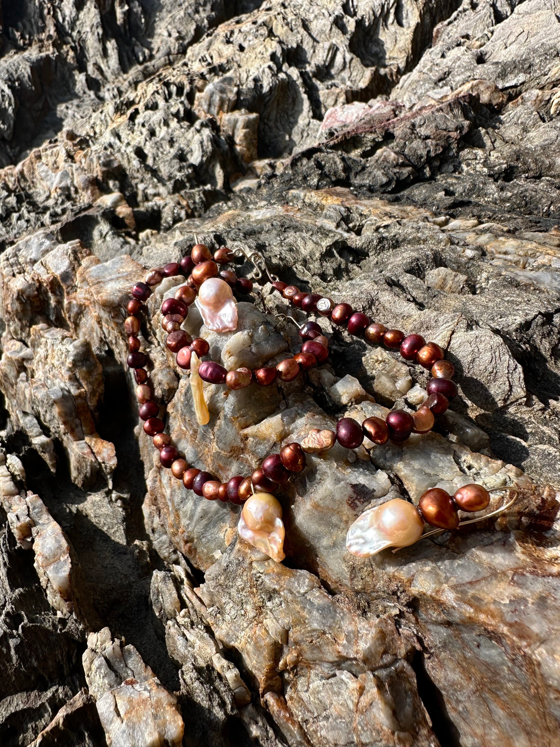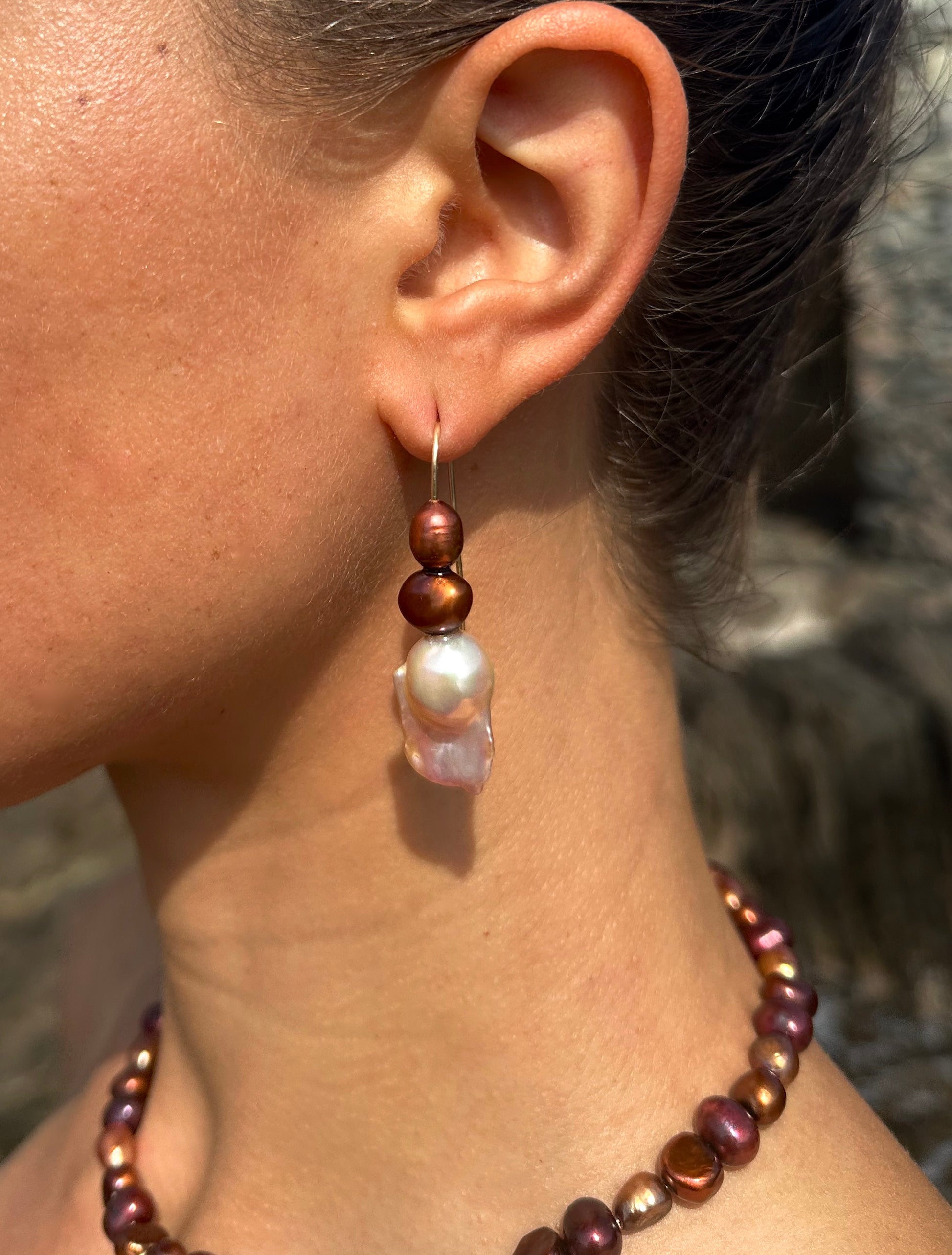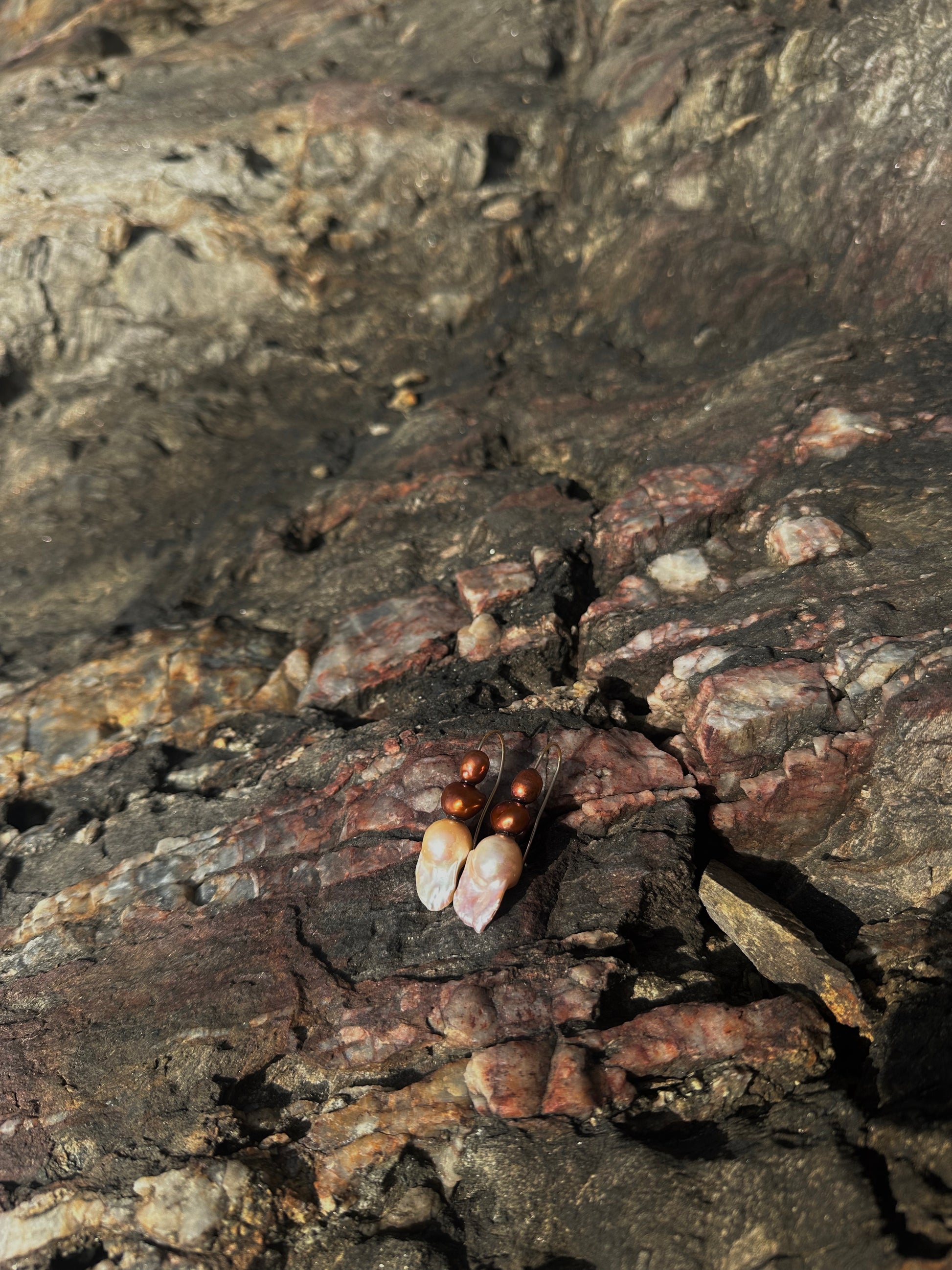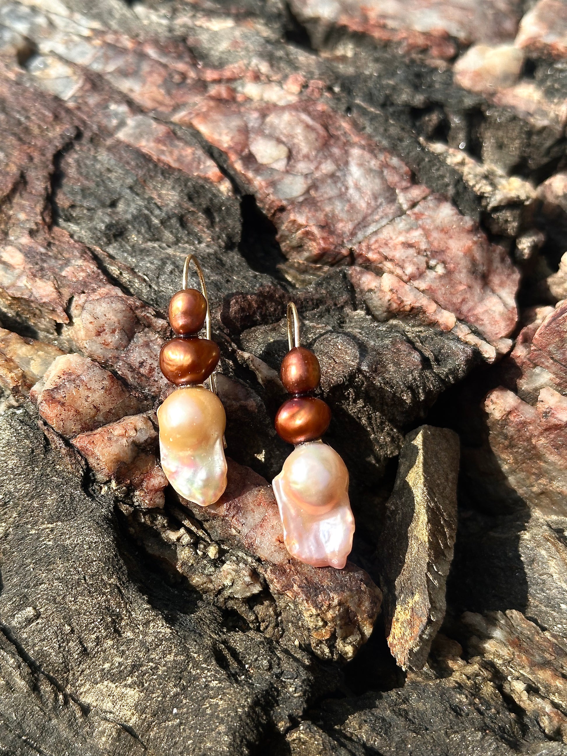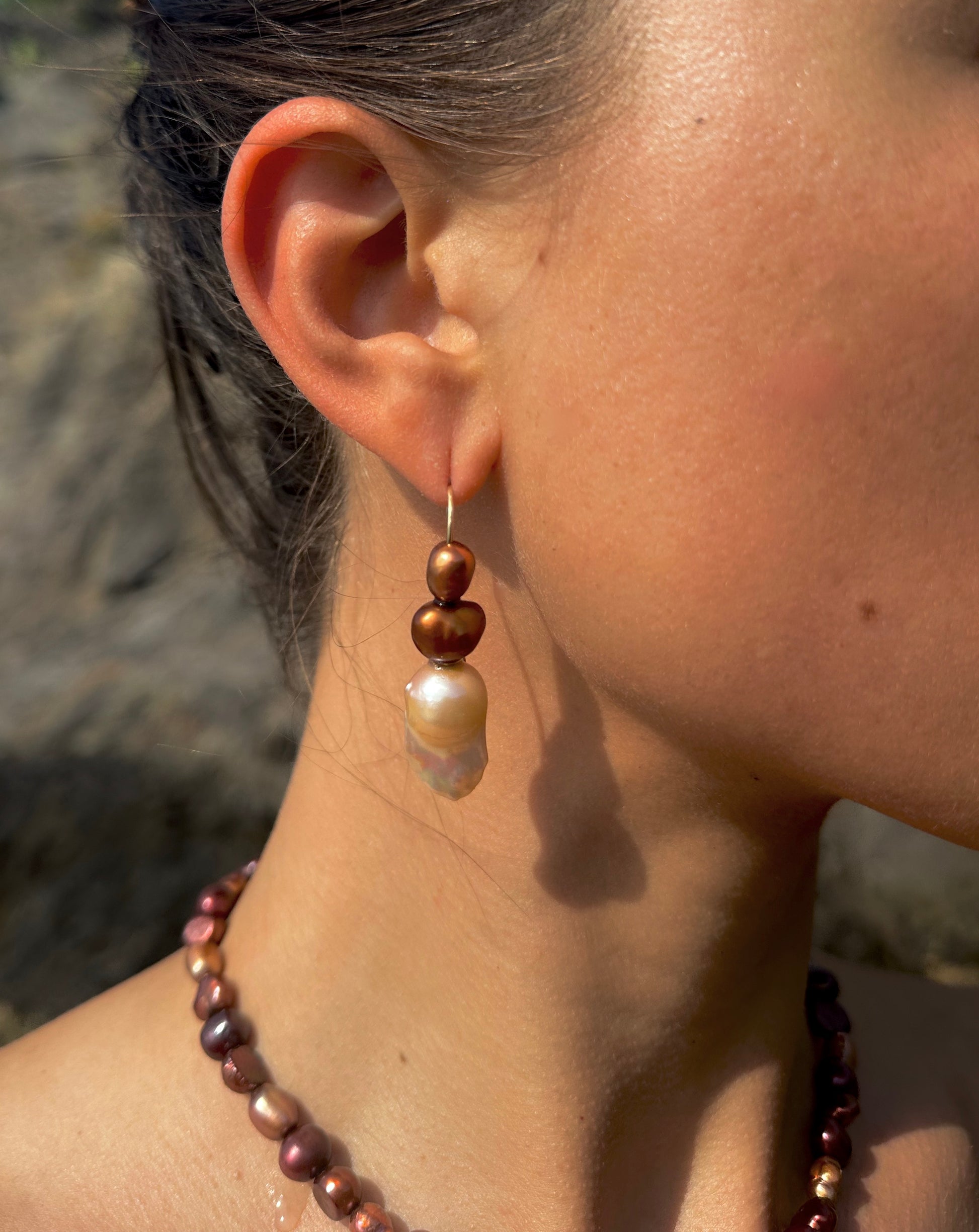 GABY · pendientes compuestos por una perla barroca de forma orgánica con brillo rosé-dorado, combinada con una perla de agua dulce en tonos bronce y otra marrón-rojiza, todo colgado de un bonito gancho de oro relleno de 14k.