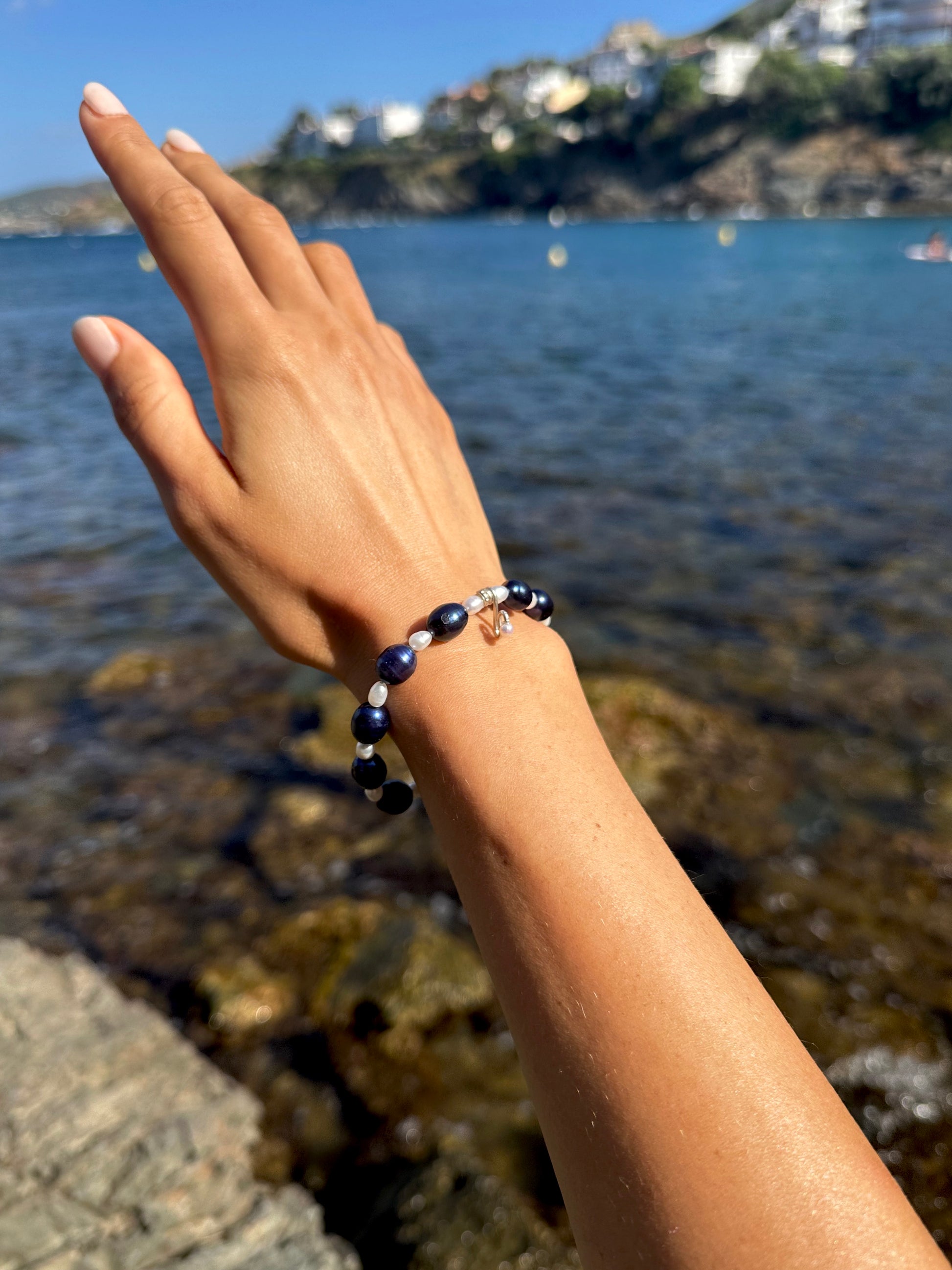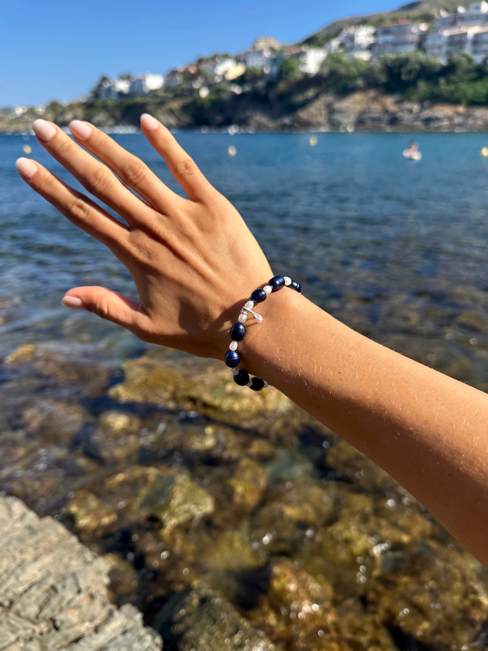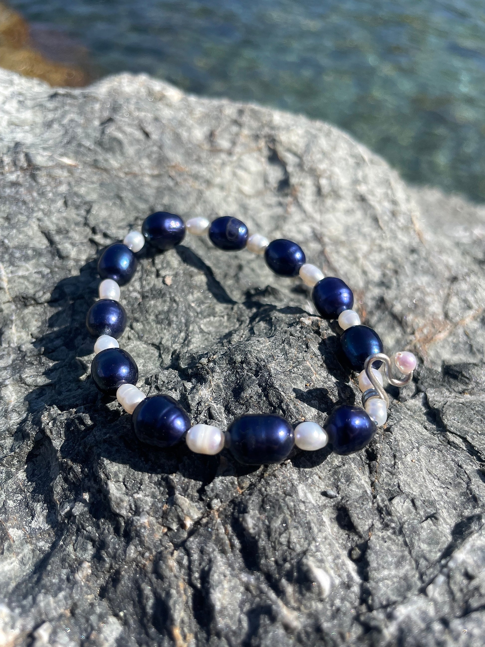 GEORG · pulsera elástica compuesta por perlas de agua dulce blancas y azul marinas con un detalle "salti" en plata 925. Es fácil de poner, cómoda y elegante.