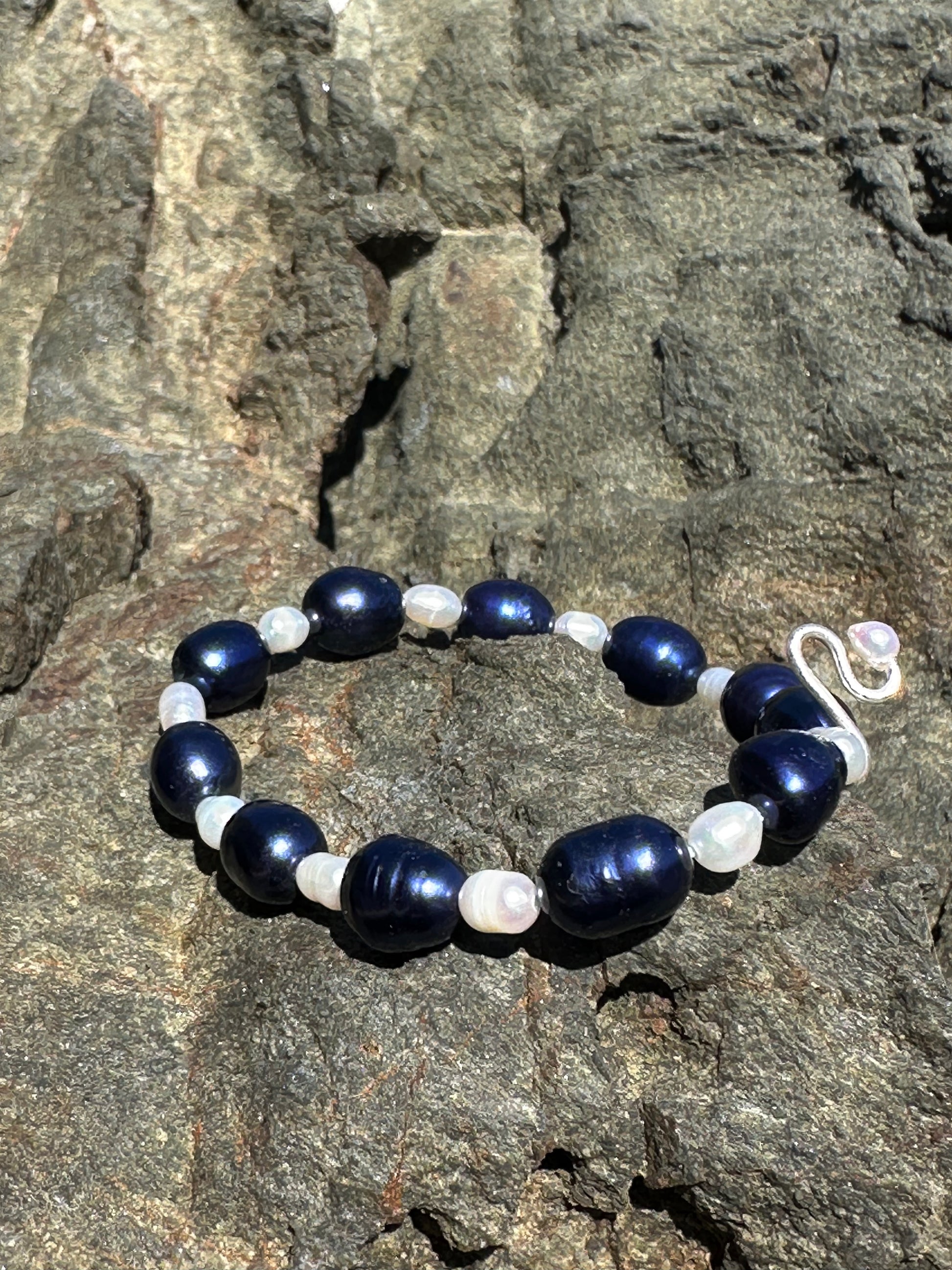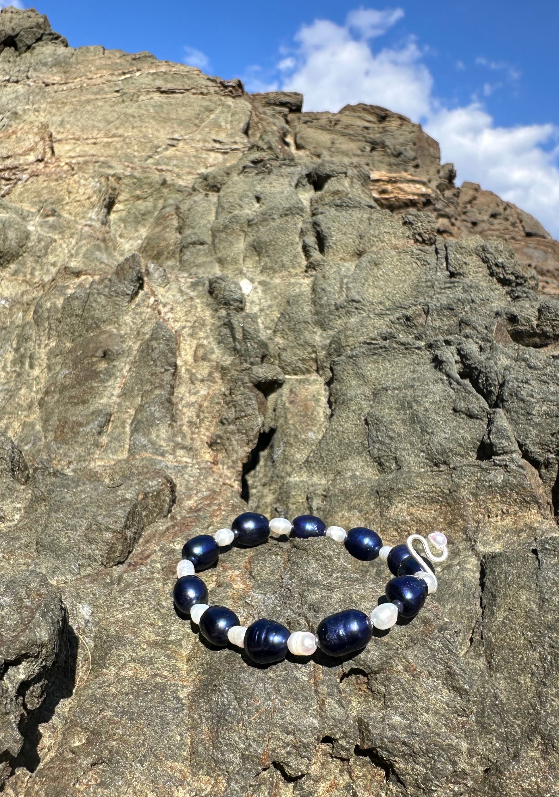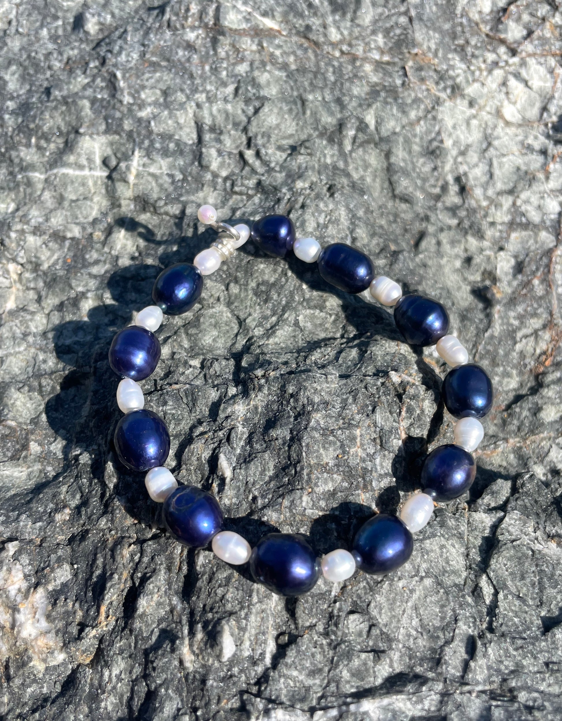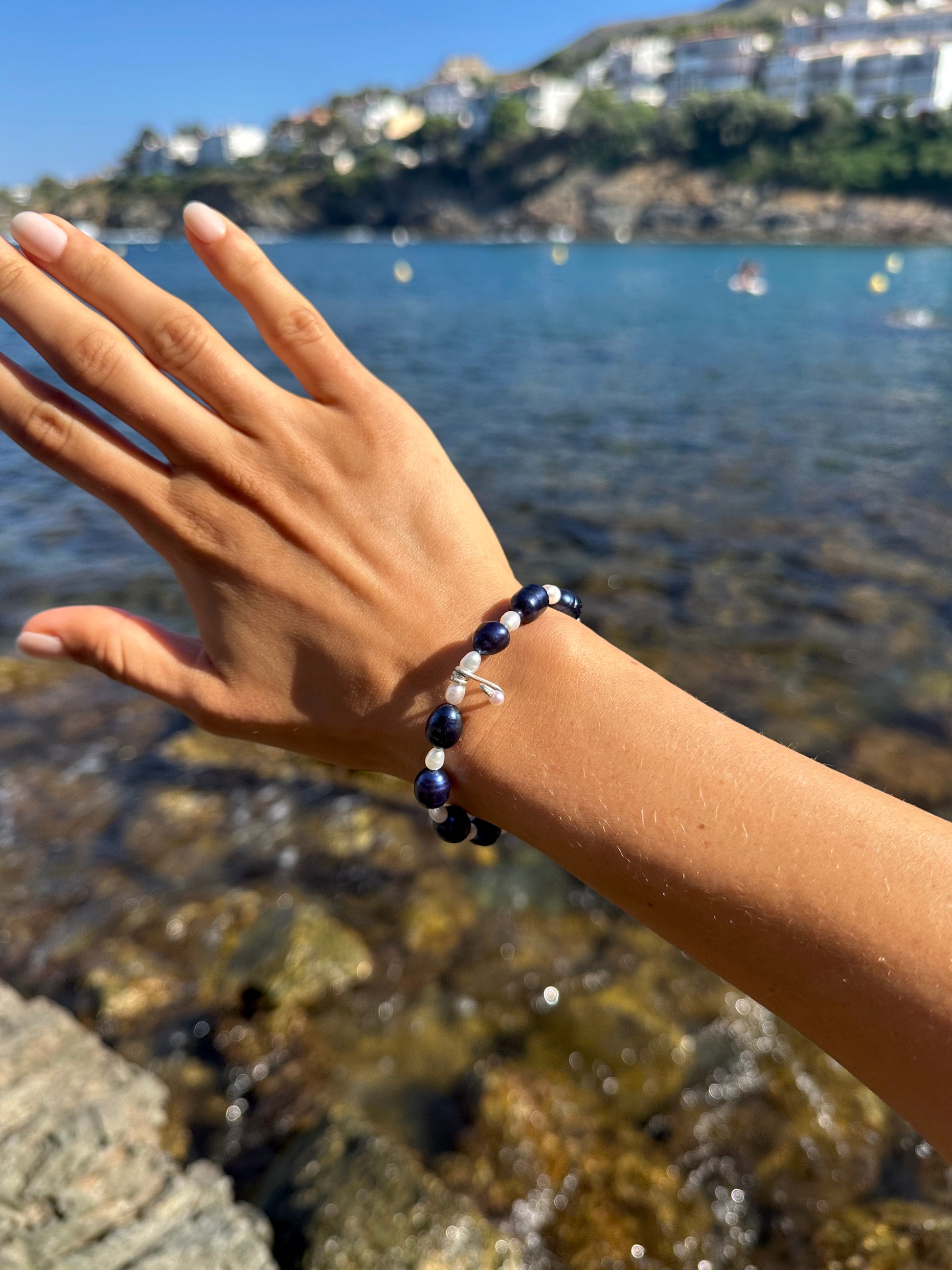 GEORG · pulsera elástica compuesta por perlas de agua dulce blancas y azul marinas con un detalle "salti" en plata 925. Es fácil de poner, cómoda y elegante.