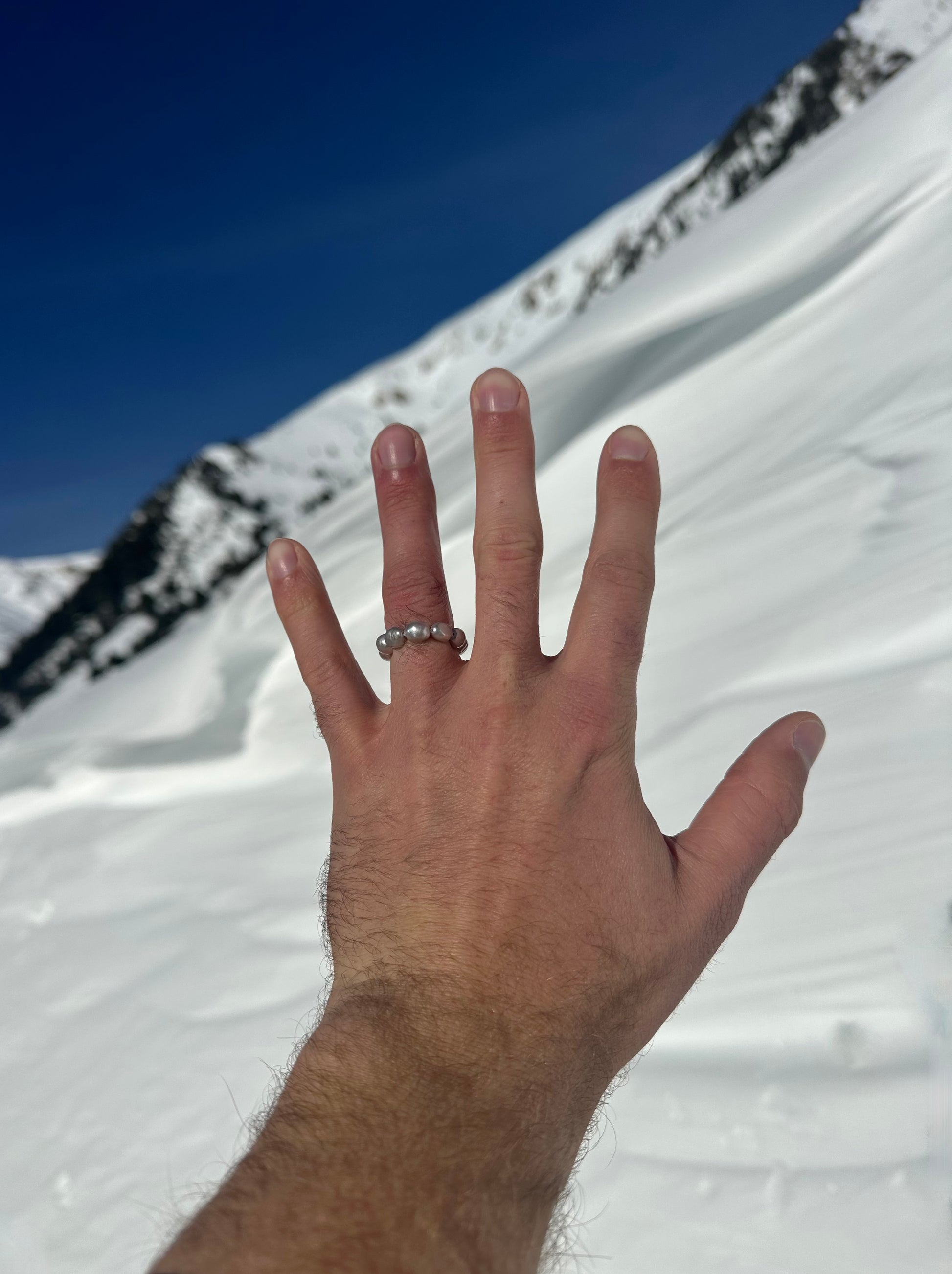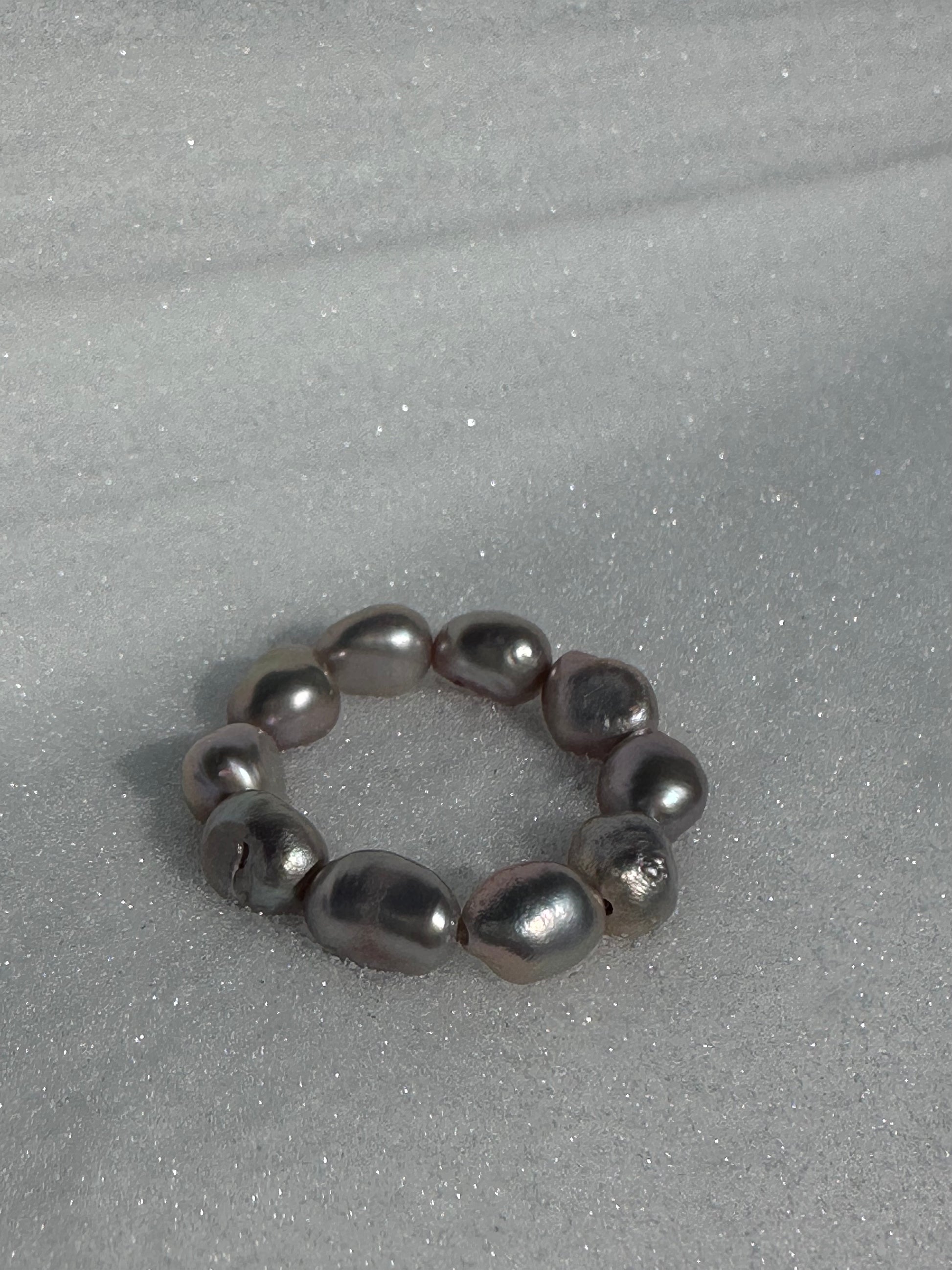 GREY · anillo elástico compuesto por varias perlas de agua dulce con brillo plateado y formas variadas.