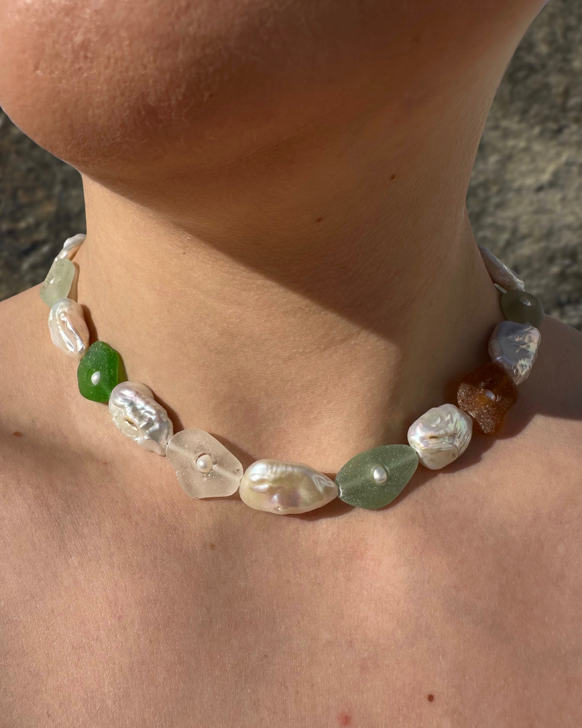 HUNTER · una pieza verdaderamente especial: un collar formado por seis fragmentos de vidrio marino de distintos colores, moldeados y suavemente matizados por el mar. Cada pieza ha sido perforada a mano en el centro para engastar una pequeña perla de agua dulce.