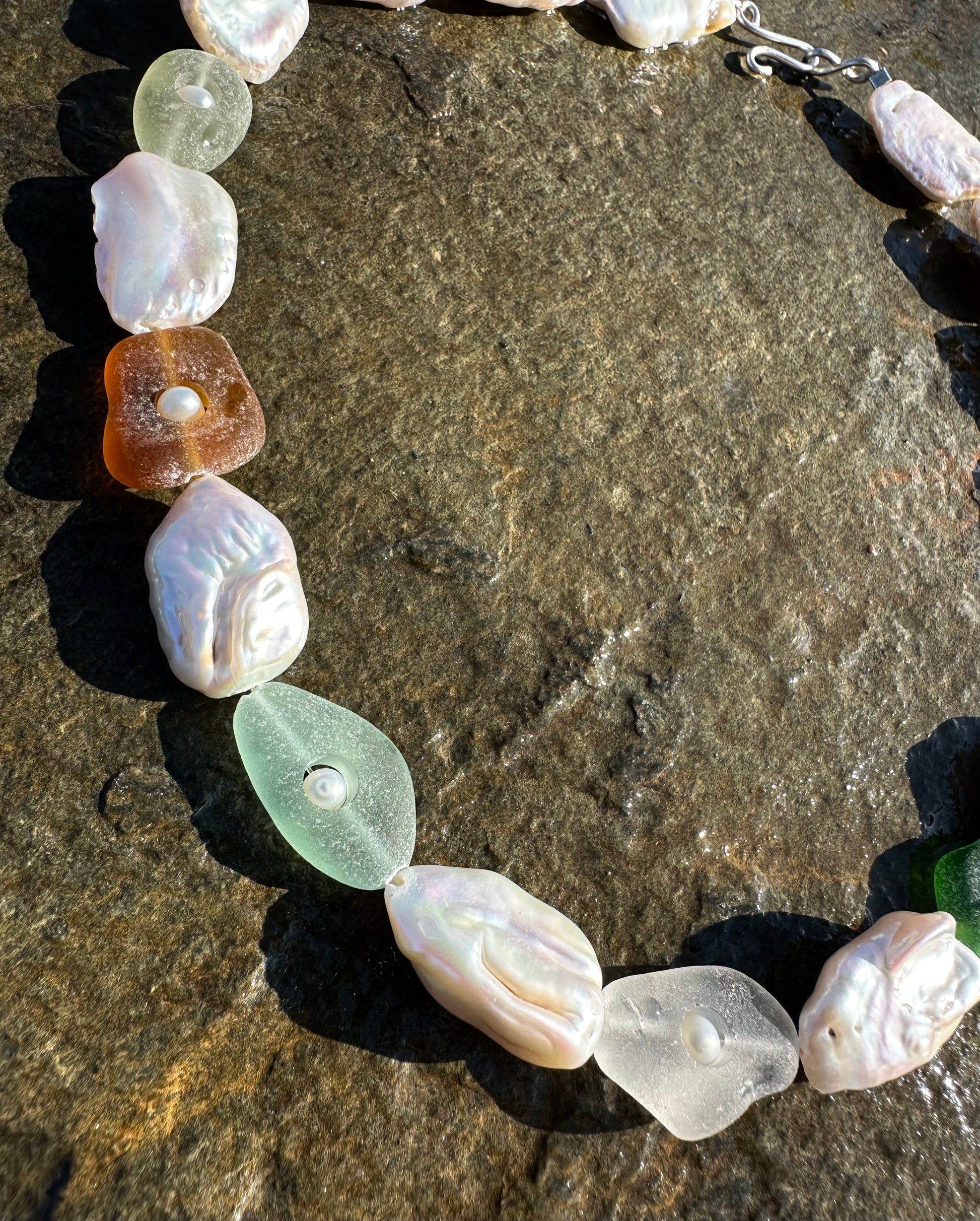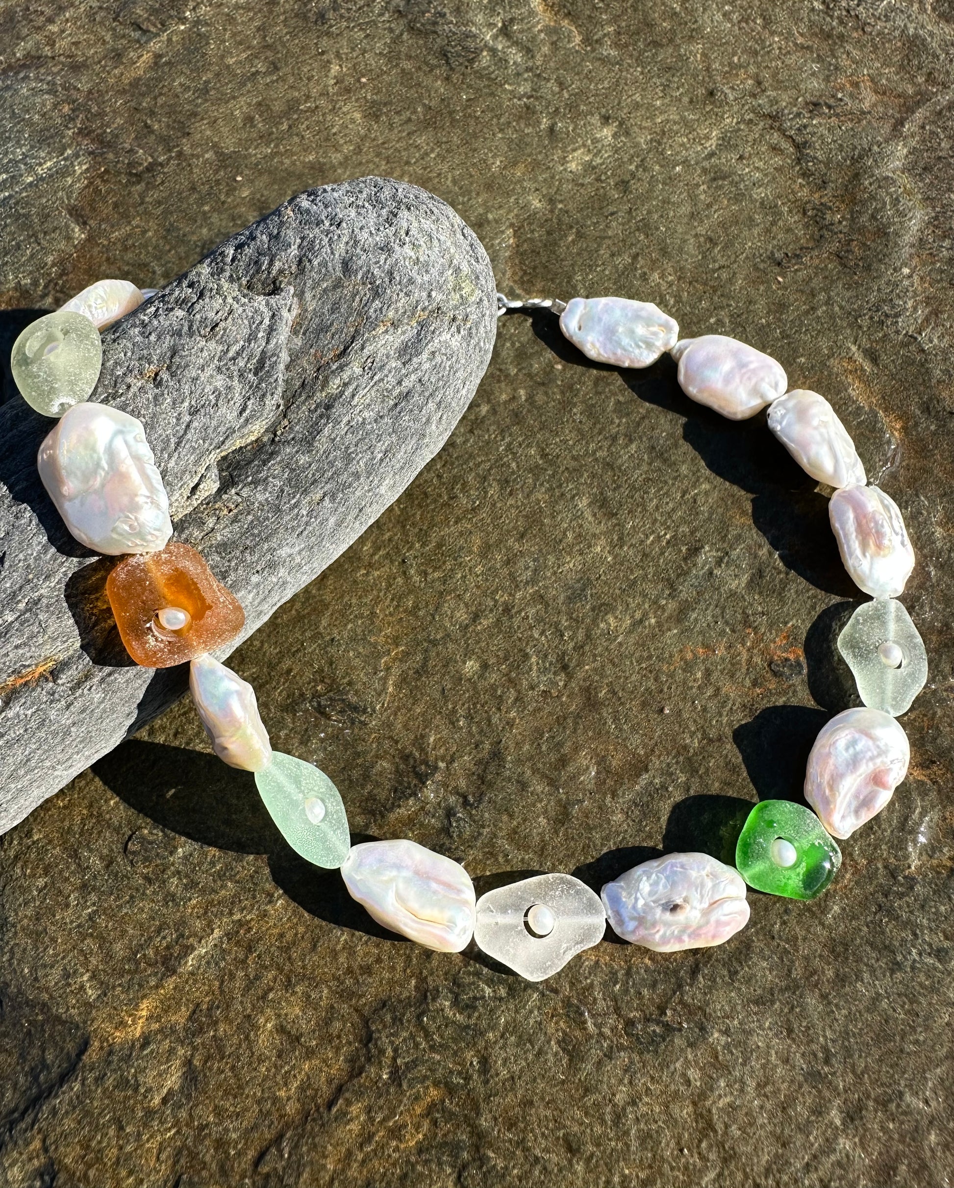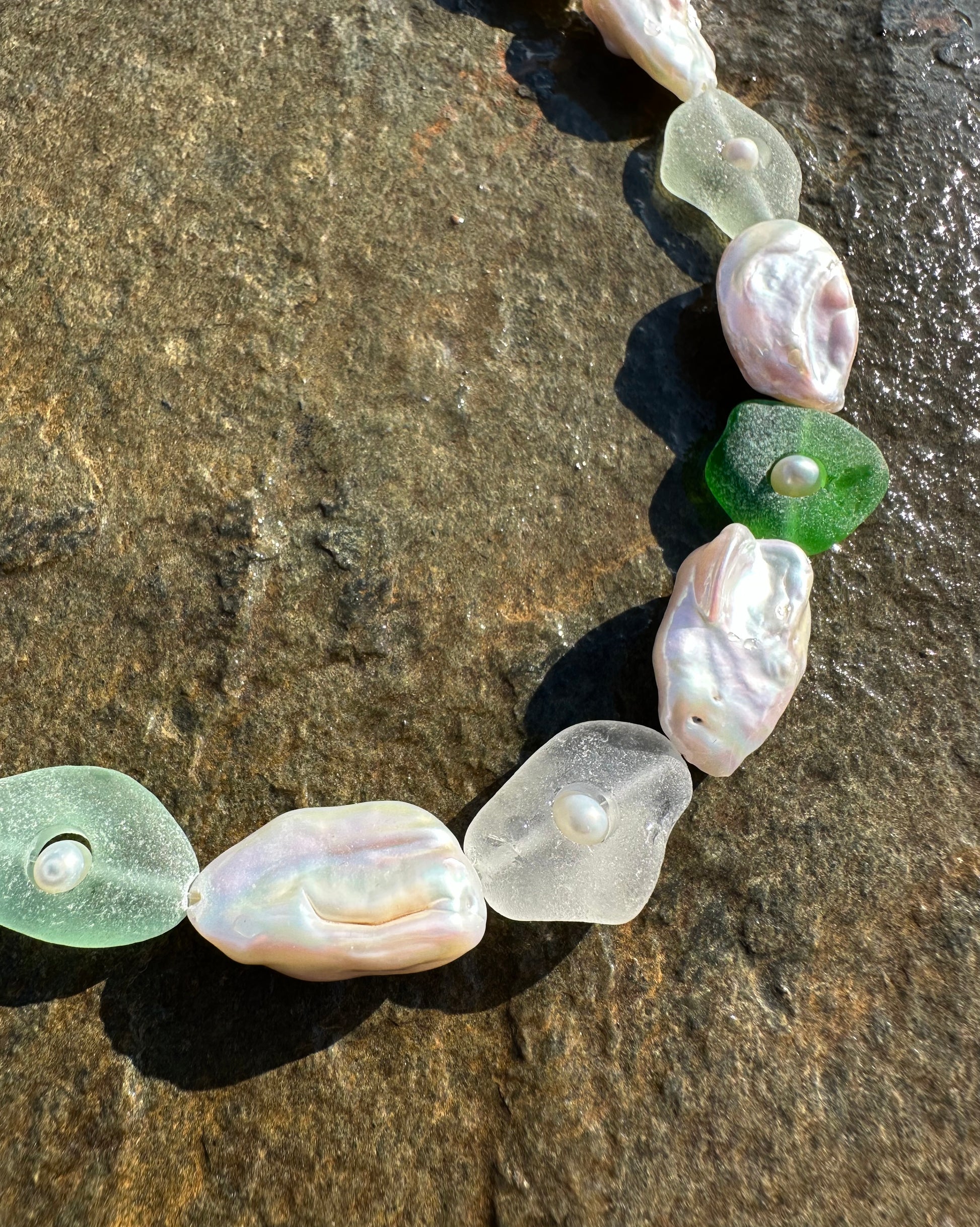 El vidrio marino está rodeado de perlas barrocas y Keshi de formas orgánicas, cuyos tonos nacarados crean una armonía preciosa al combinarse con los colores vibrantes del vidrio.