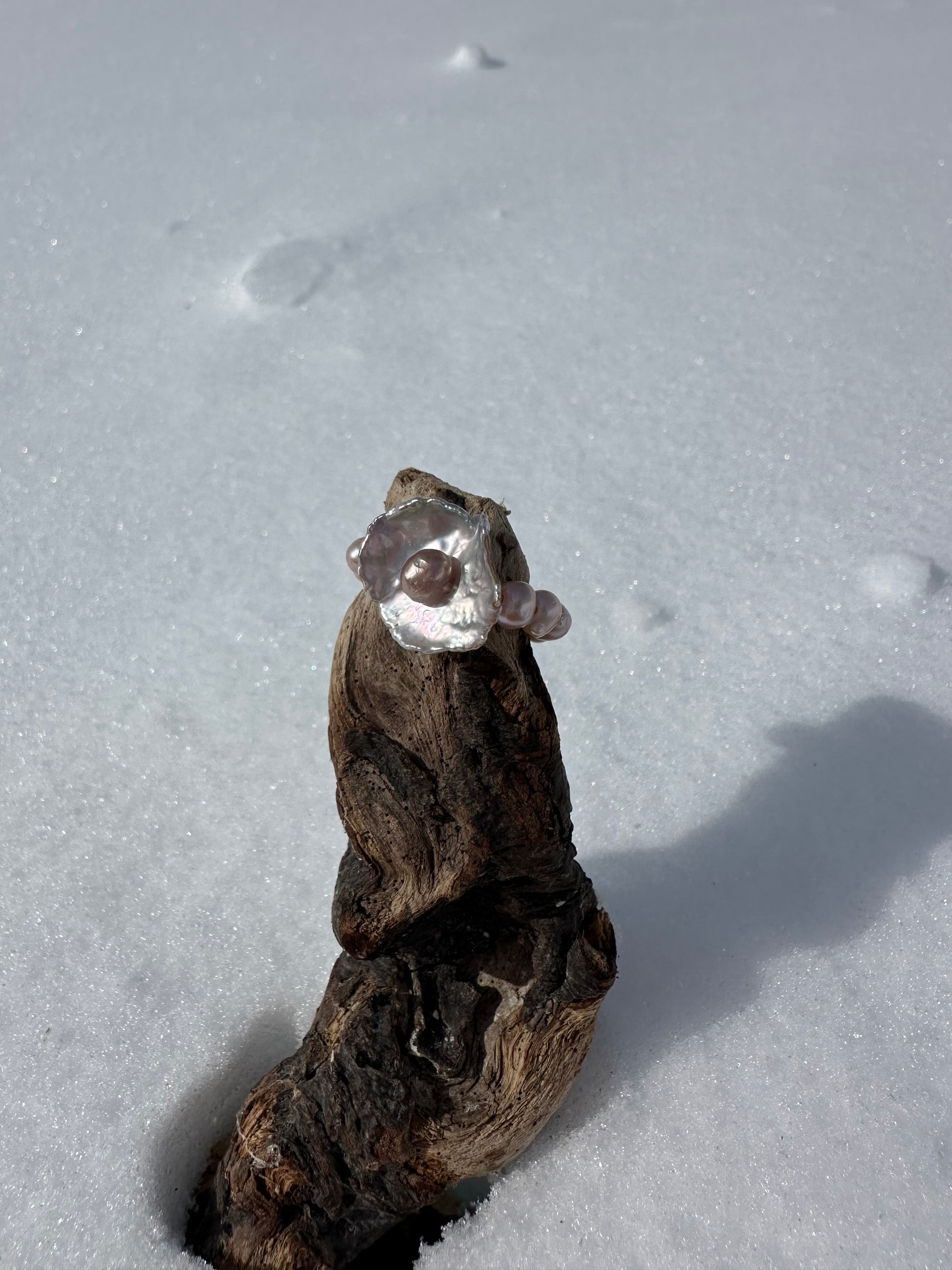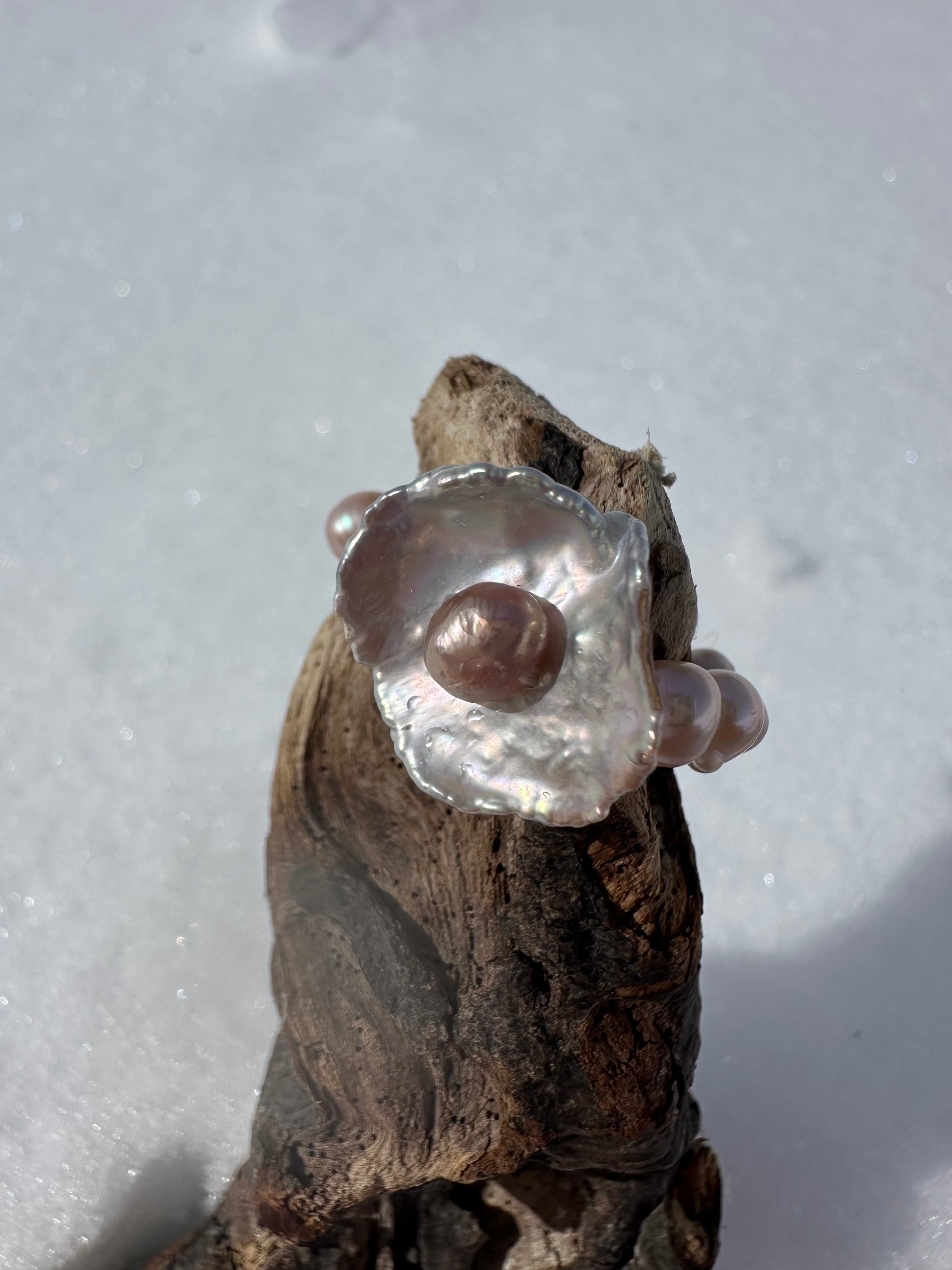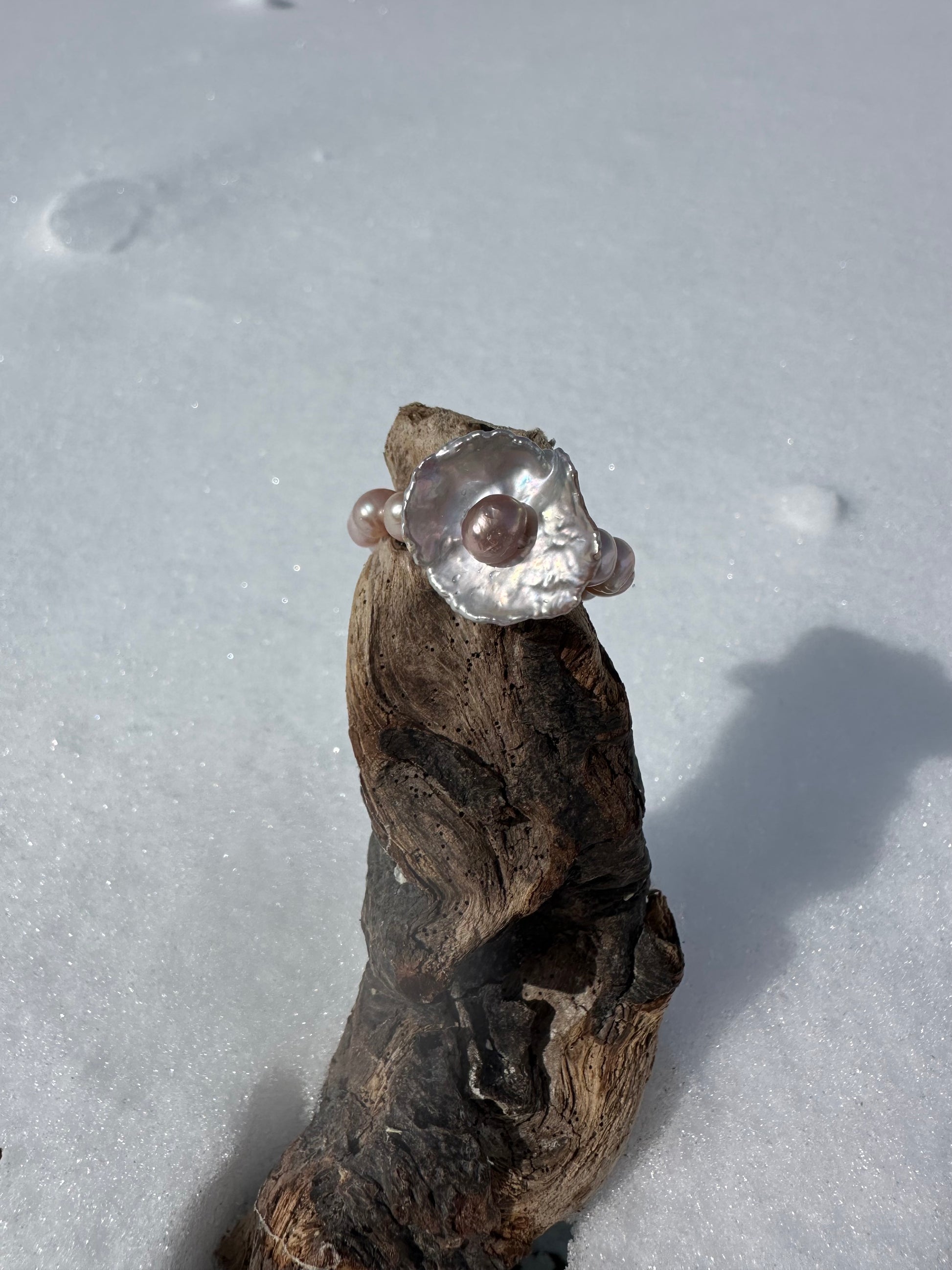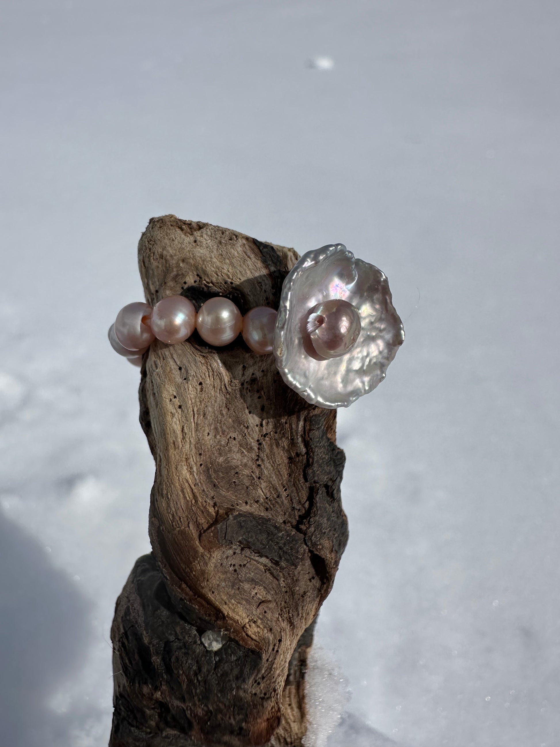 IRIS · anillo elástico con una perla Keshi de forma floral en su centro, de brillo plateado natural, delicadamente adornada por una perla de agua dulce en tono rosé en su núcleo.