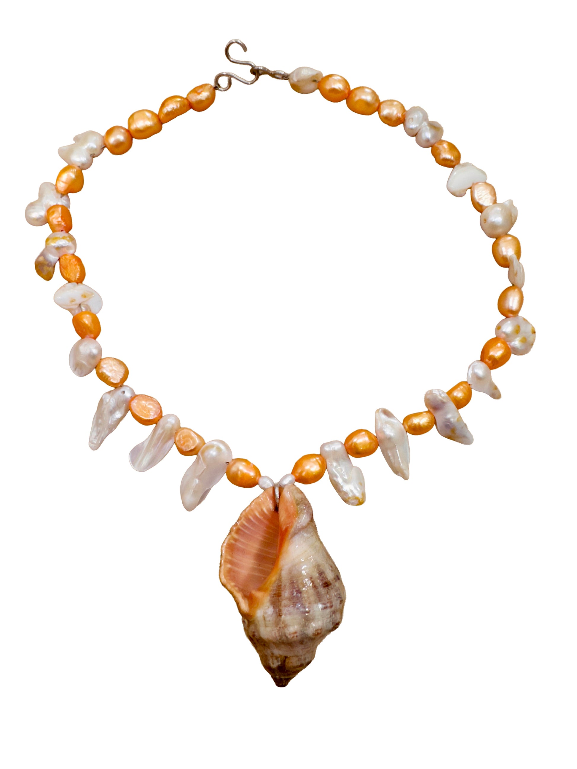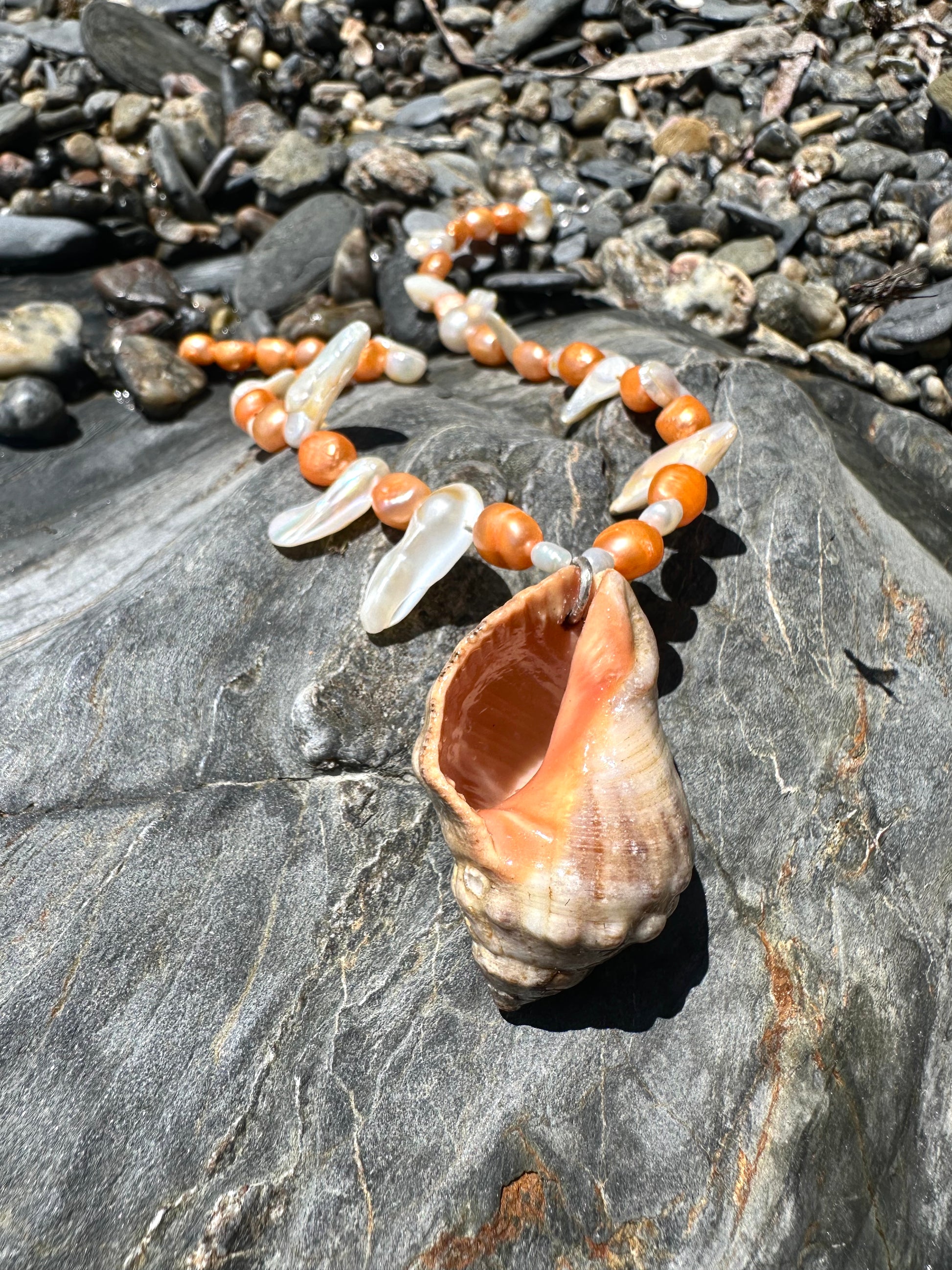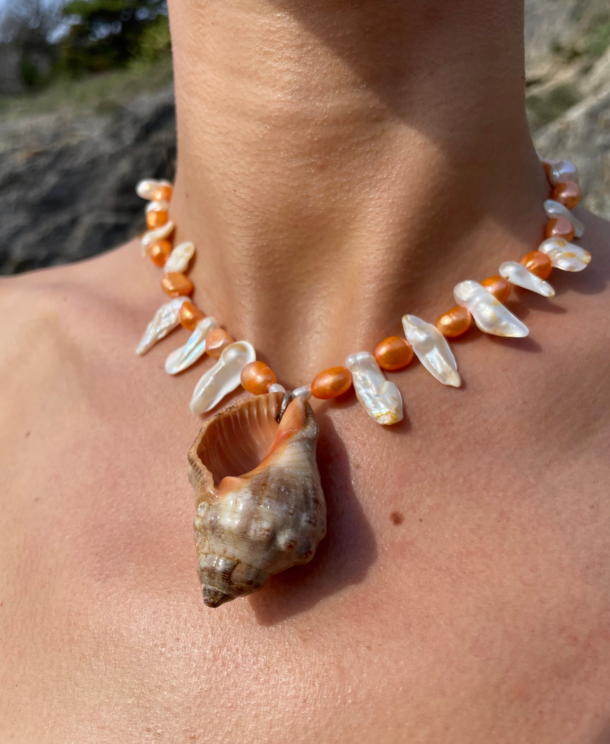 ISABELLA · collar con un caracol marino en tono ámbar, realzada por perlas de agua dulce alargadas en blanco y delicados matices anaranjados, que aportan luz y movimiento a la pieza.