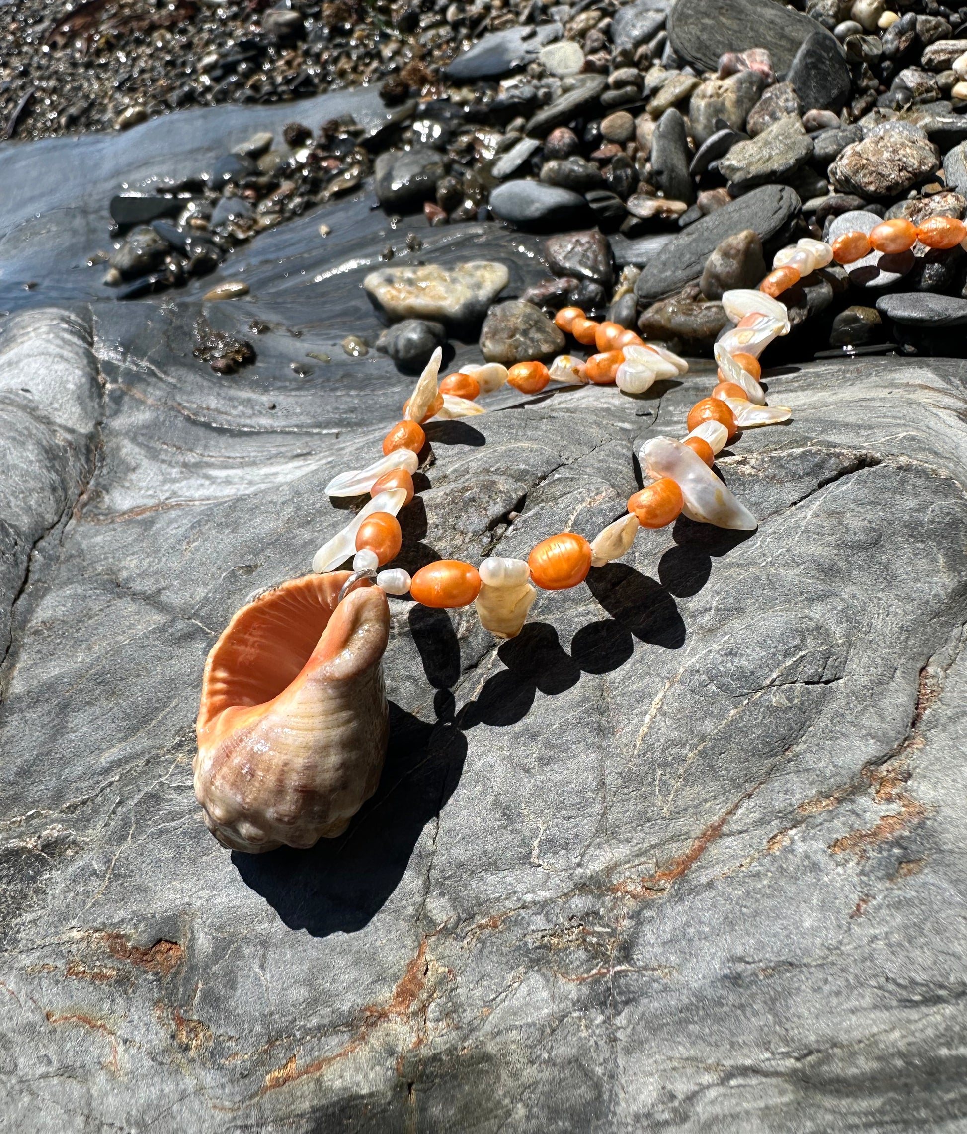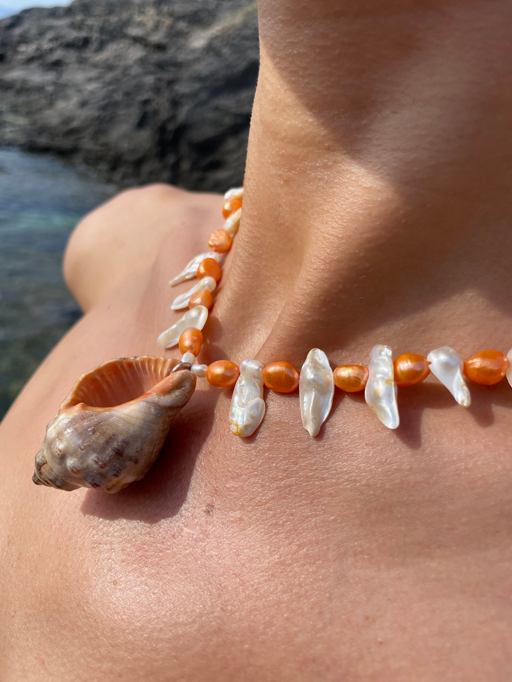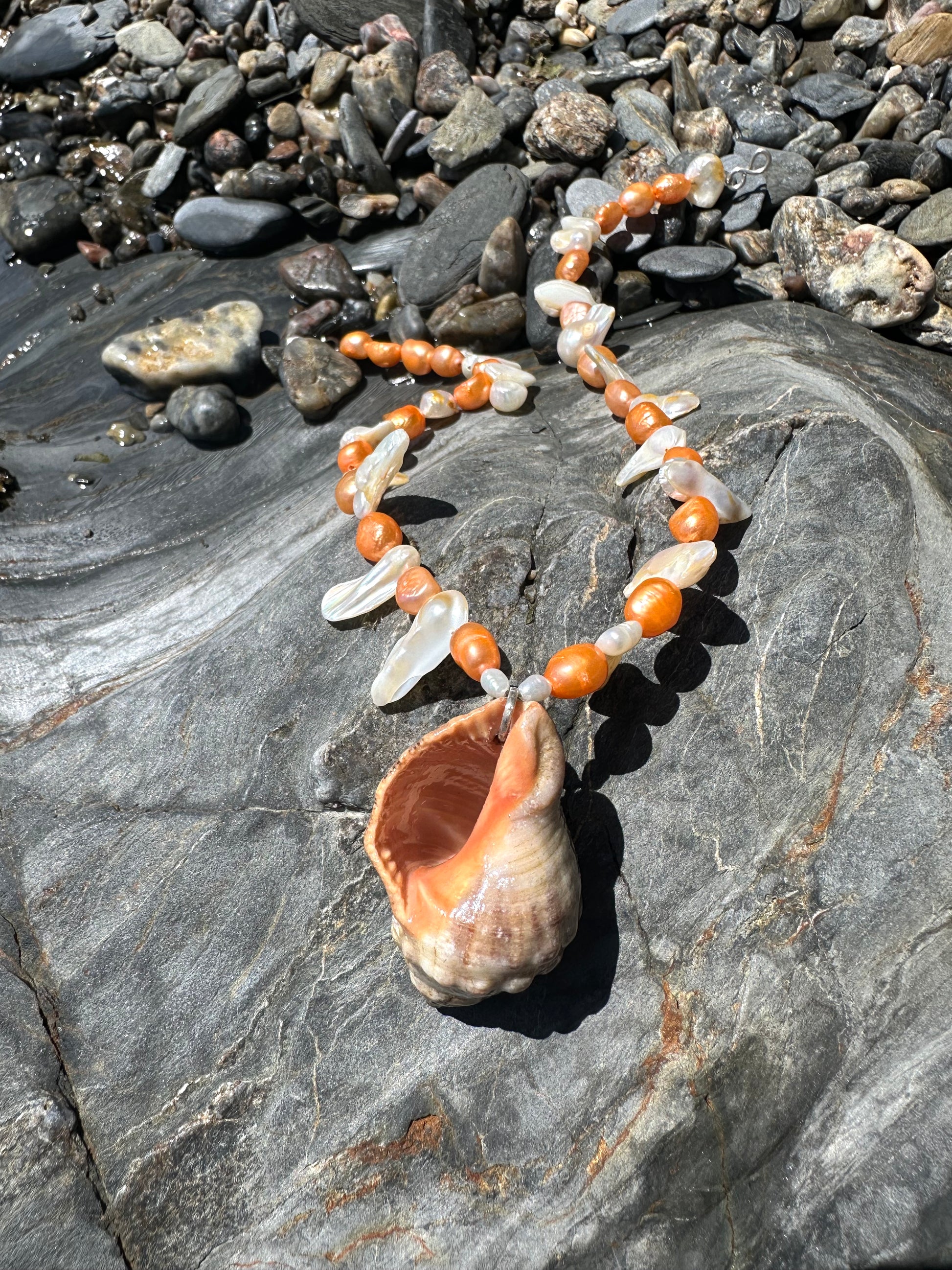 ISABELLA · collar con un caracol marino en tono ámbar, realzada por perlas de agua dulce alargadas en blanco y delicados matices anaranjados, que aportan luz y movimiento a la pieza.