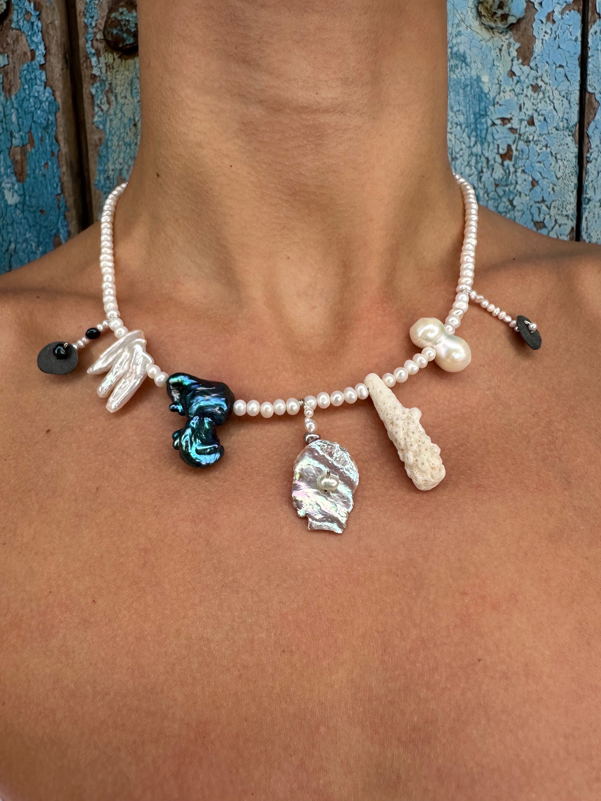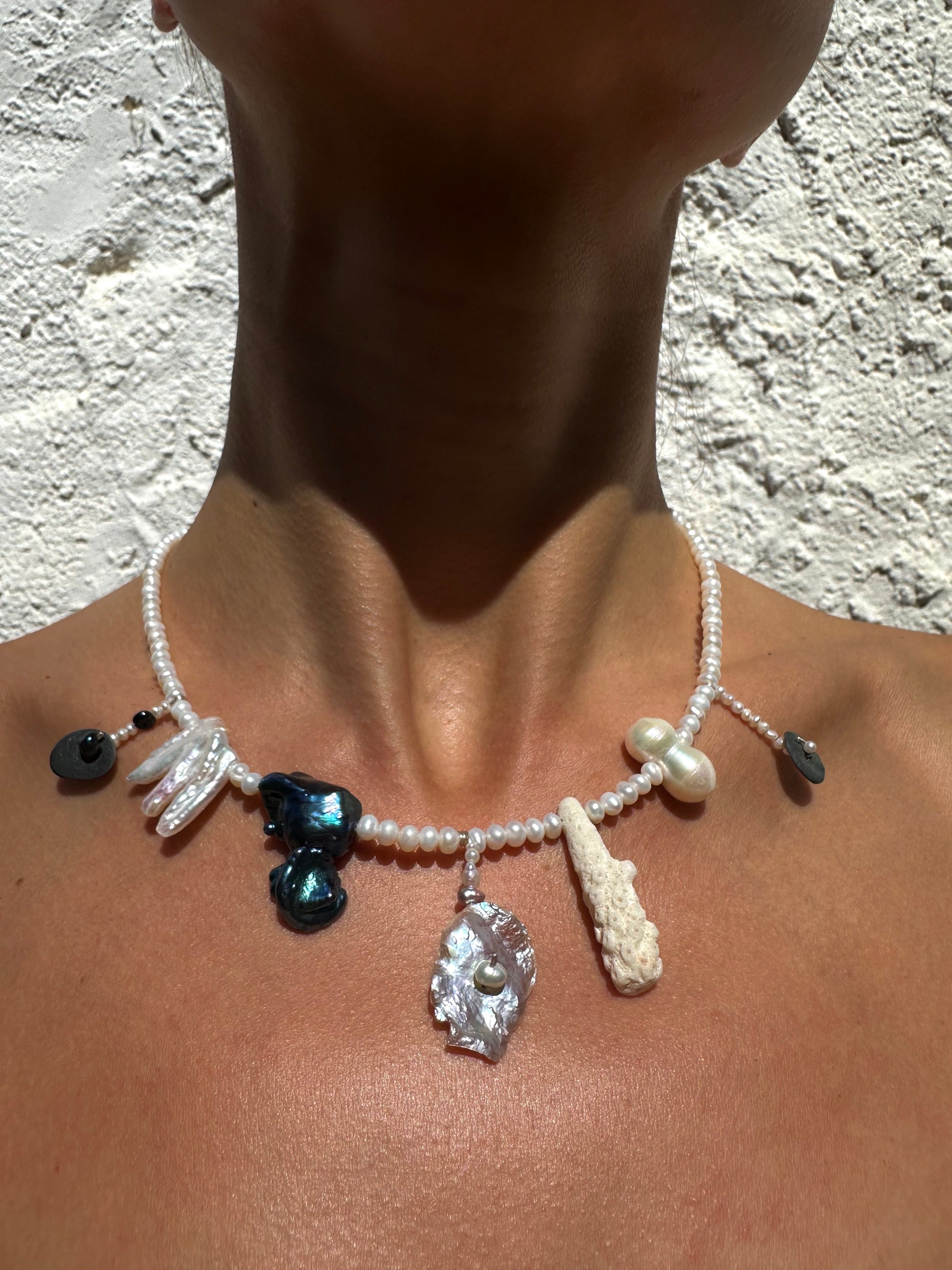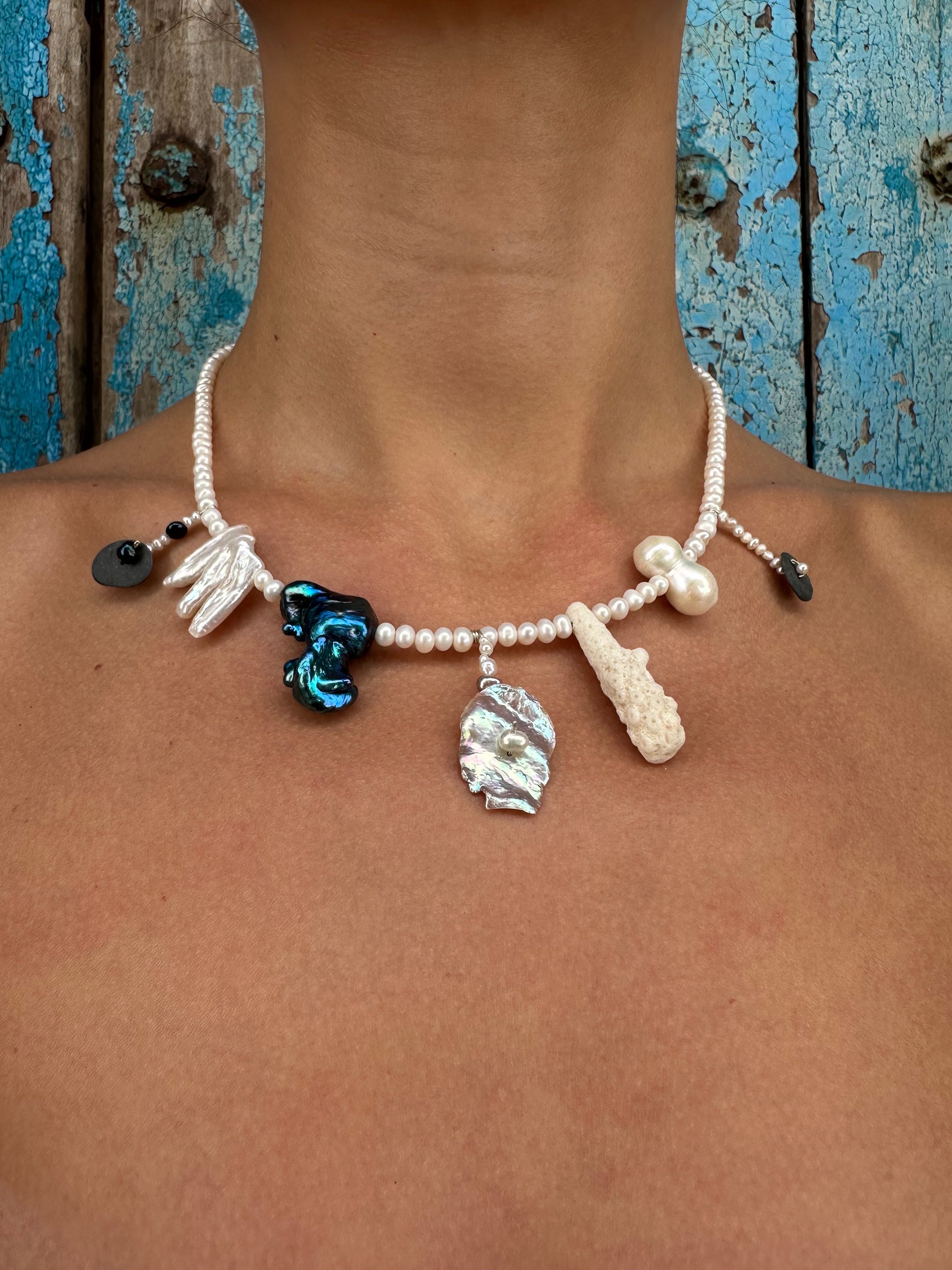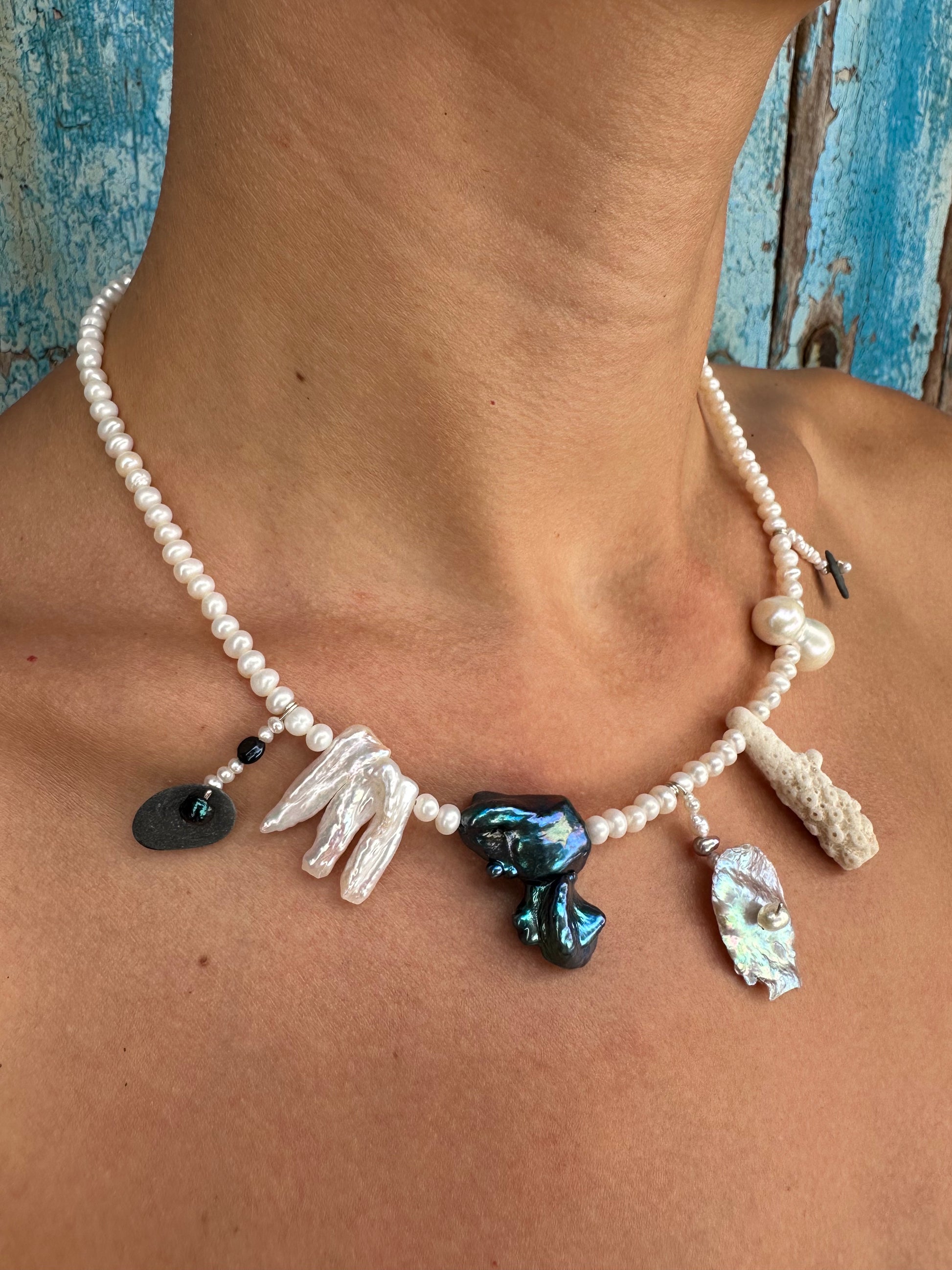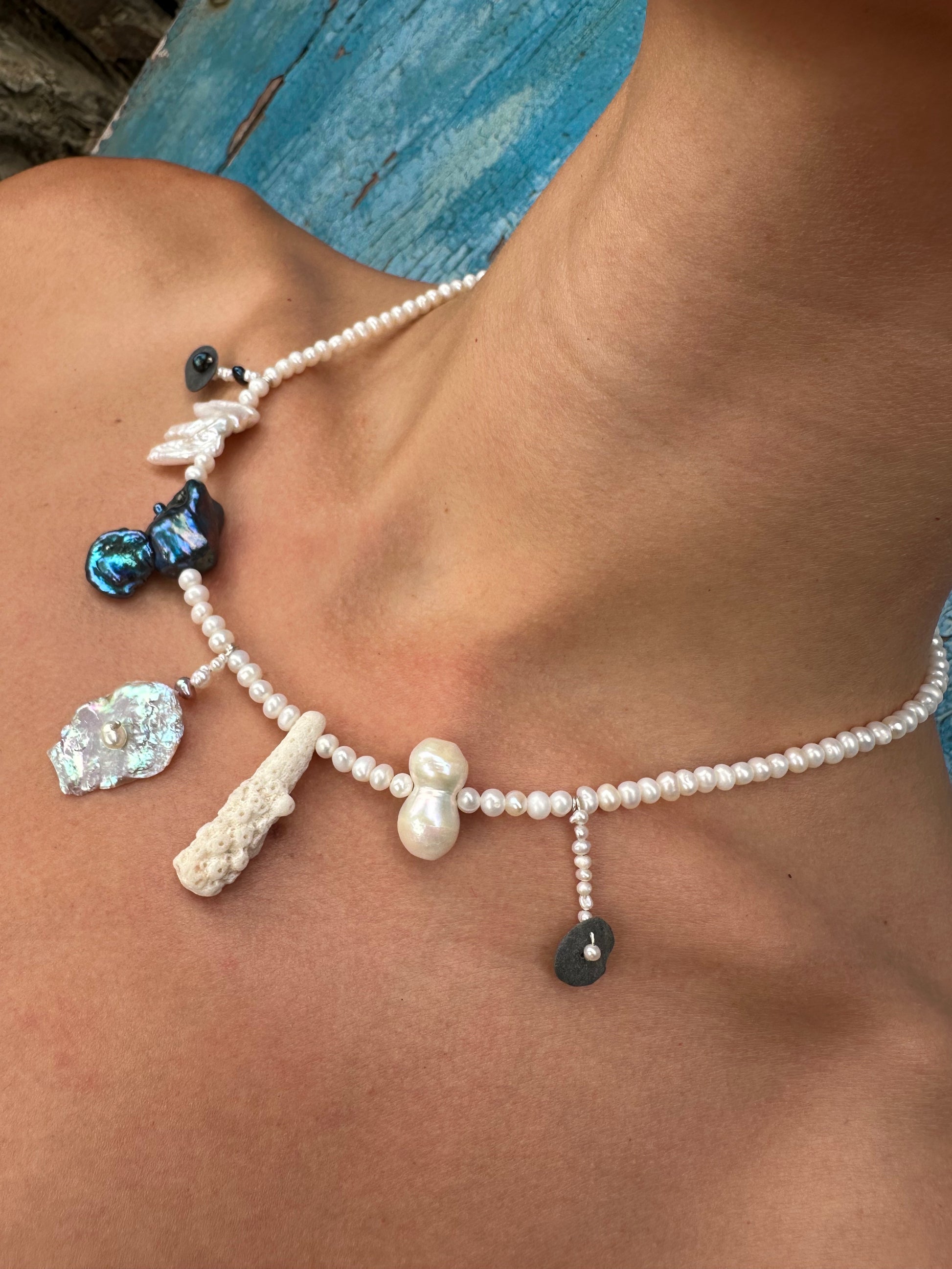 En el centro de esta hermosa pieza se combinan elegantes perlas barrocas, perlas de agua salada, perlas de agua dulce, coral, piedra de pizarra y plata 925. Estos elementos centrales están rodeados de delicadas perlas de agua dulce en forma de "potato", que aportan un toque orgánico y sofisticado al diseño.