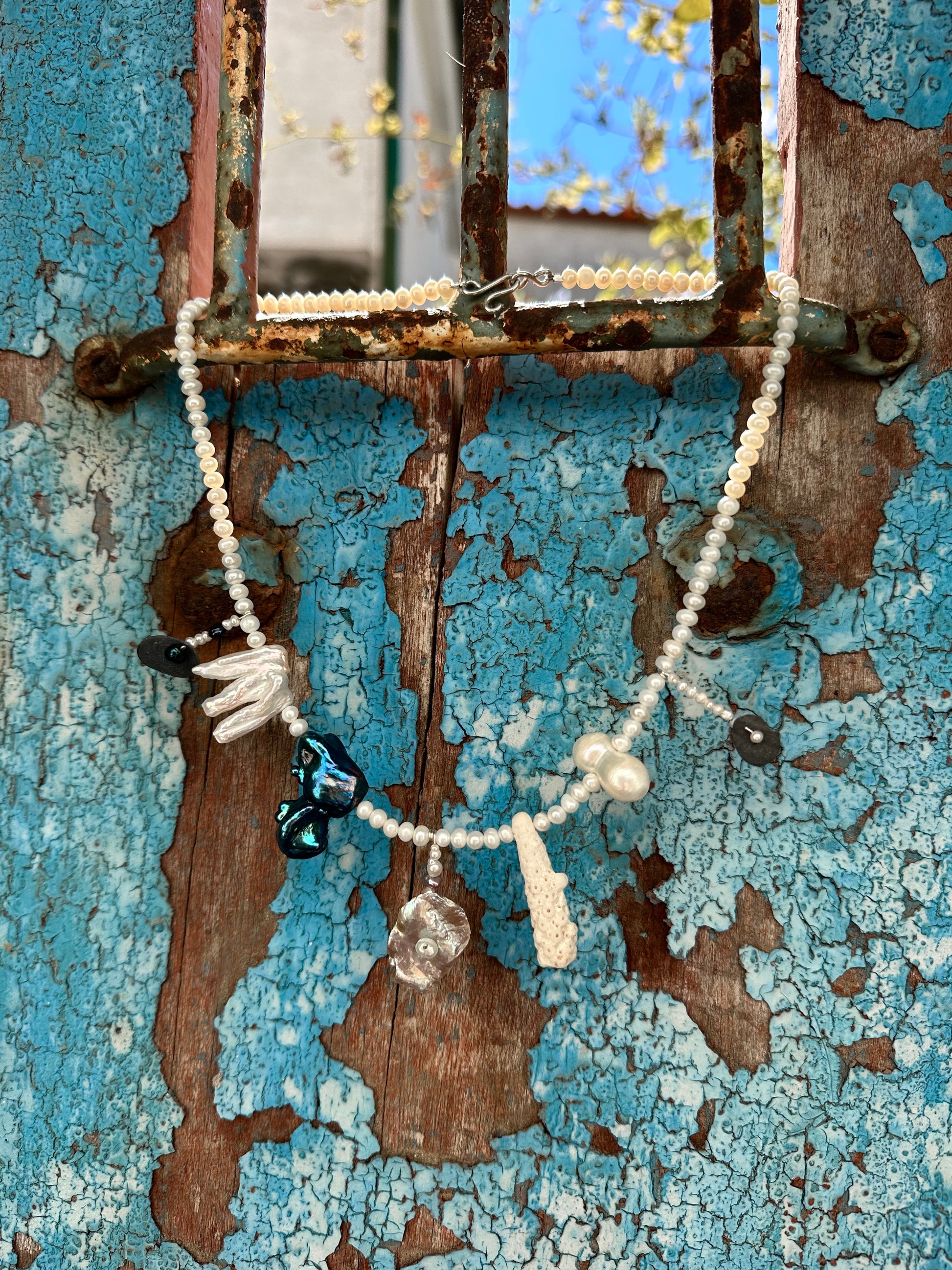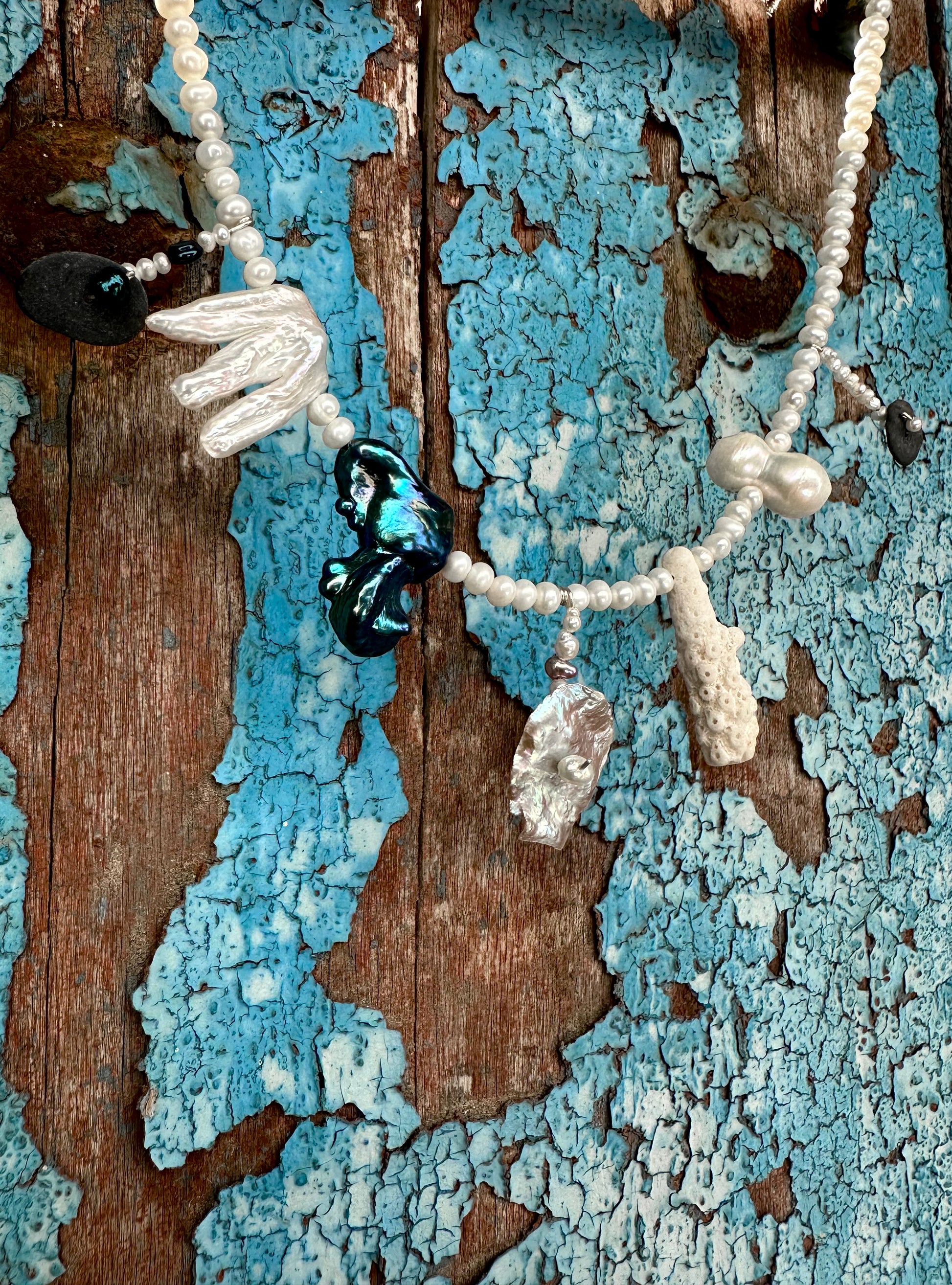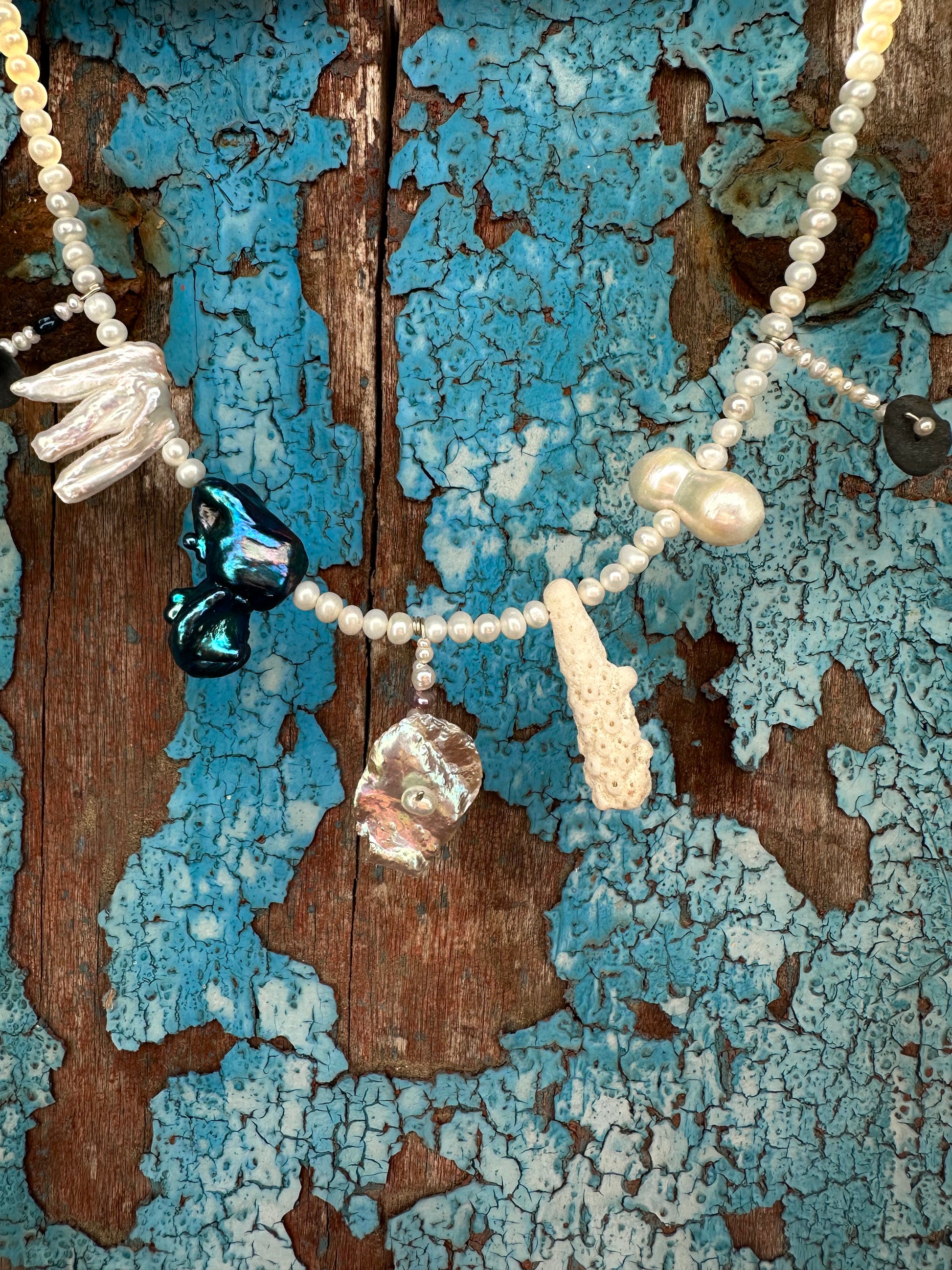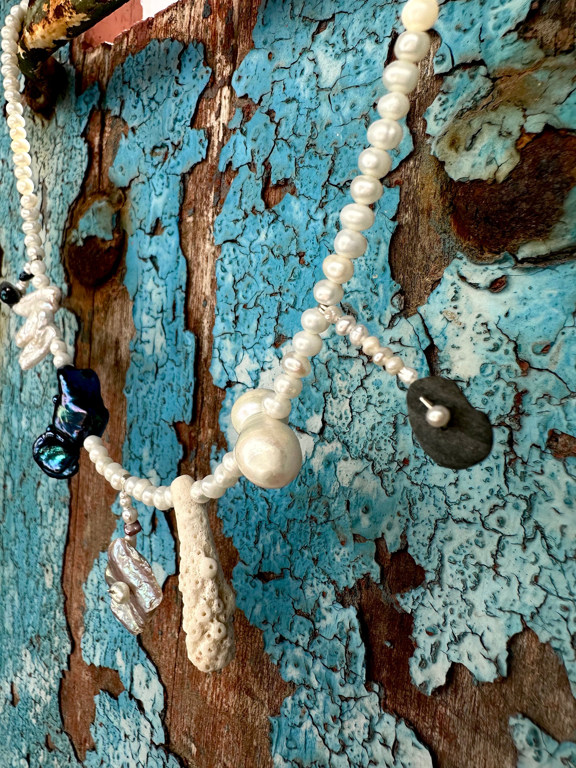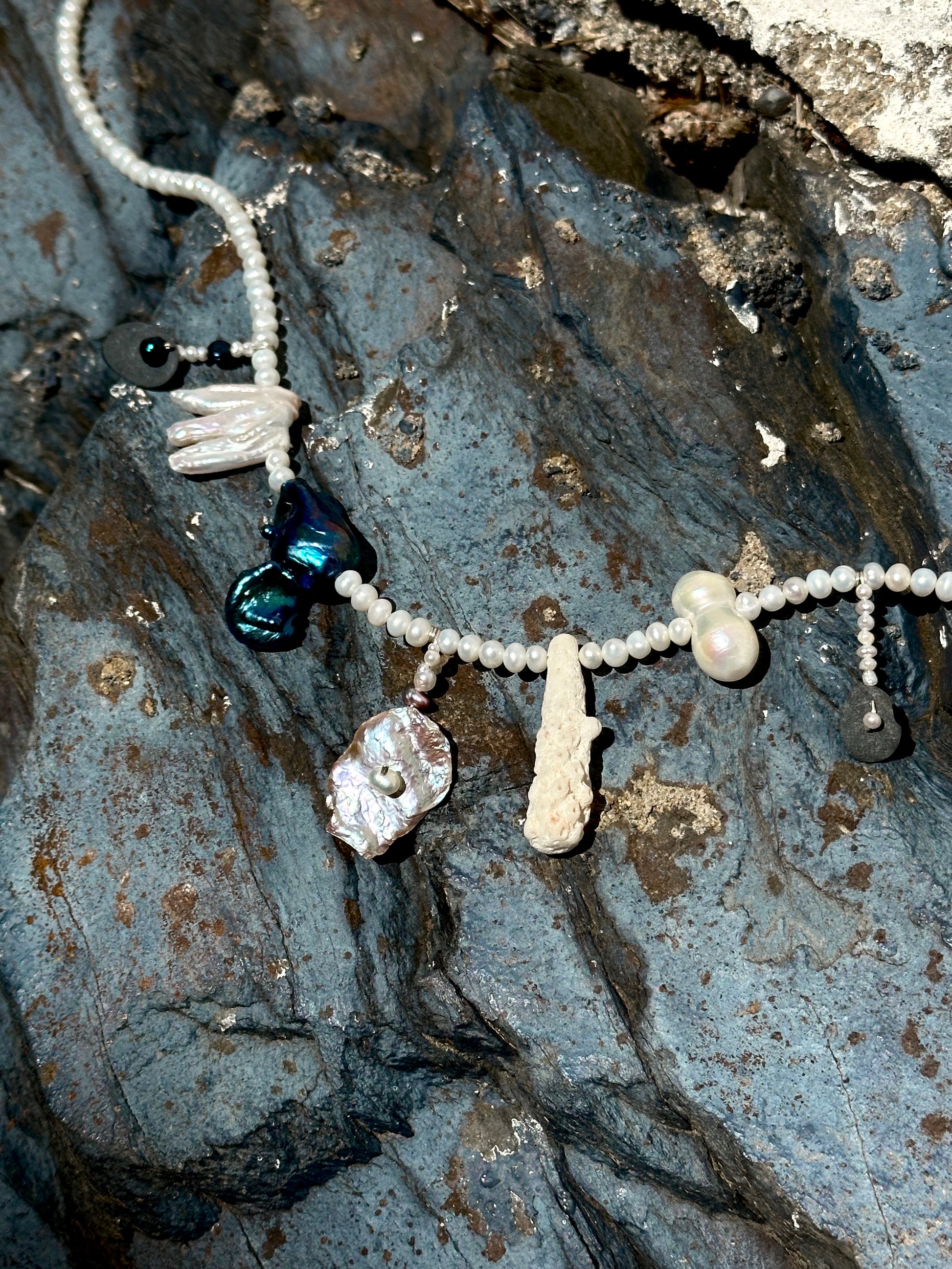 En el centro de esta hermosa pieza se combinan elegantes perlas barrocas, perlas de agua salada, perlas de agua dulce, coral, piedra de pizarra y plata 925. Estos elementos centrales están rodeados de delicadas perlas de agua dulce en forma de "potato", que aportan un toque orgánico y sofisticado al diseño.